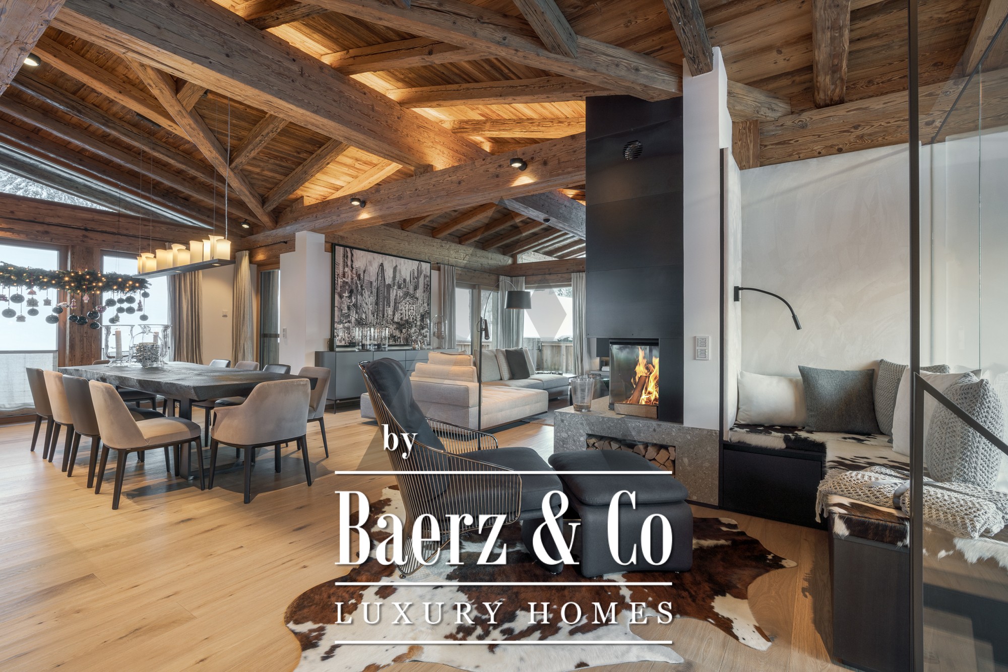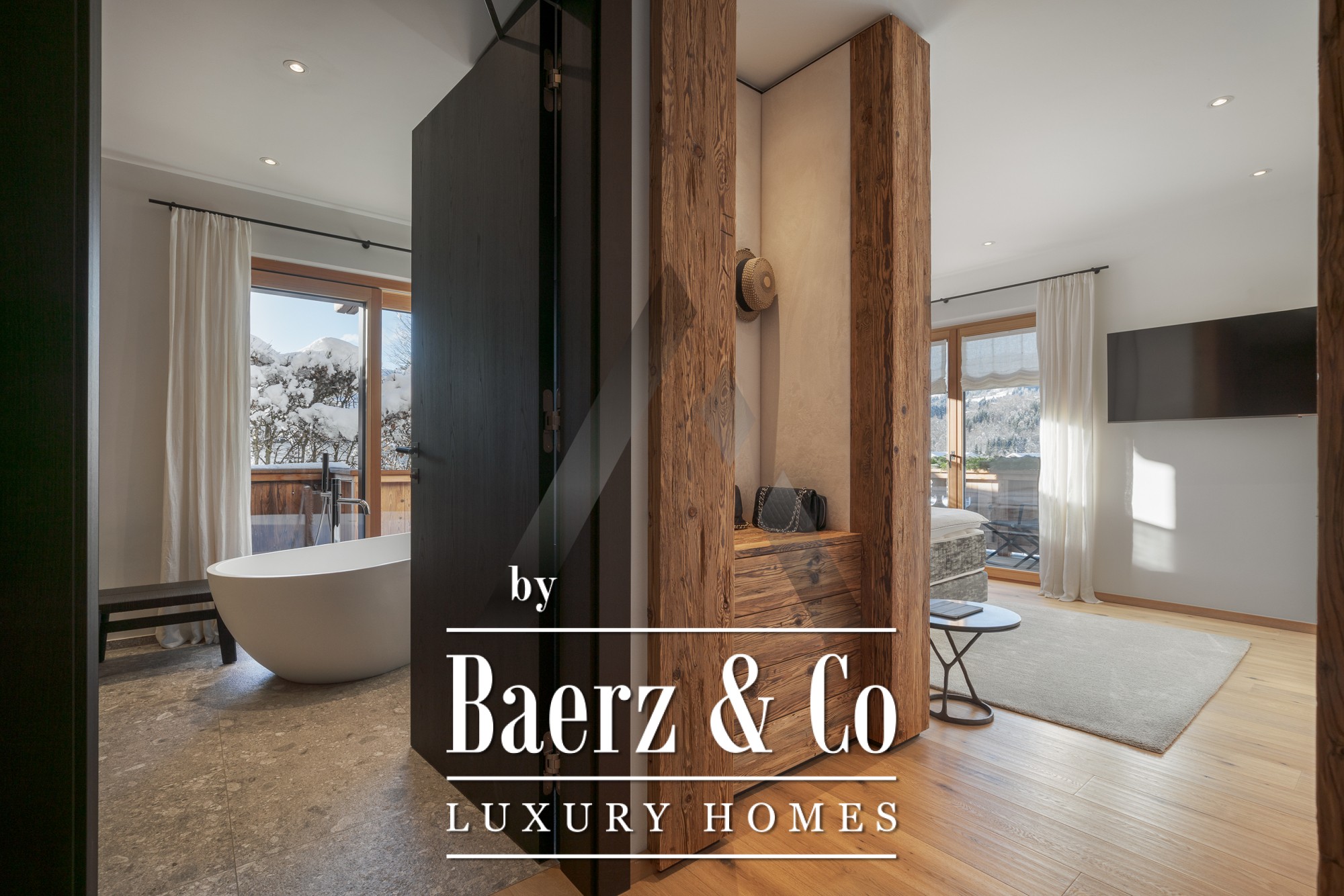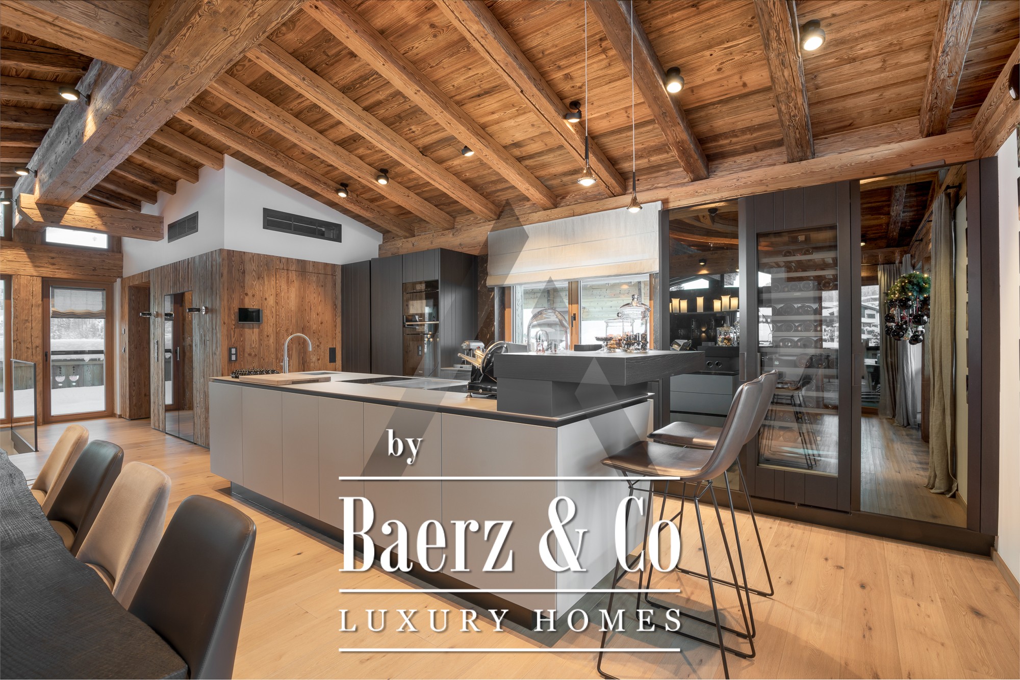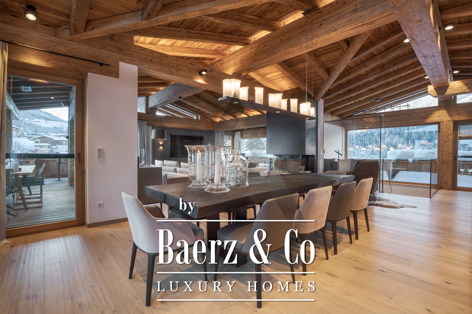 Chalet Kirchberg in Tirol biedt een bijzondere combinatie van verfijnd Alpenwonen en hedendaags design. Deze woning, gebouwd in 2018, strekt zich uit over 312 m² en ligt op een glooiende helling aan de rand van het iconische dorp, direct bij zowel de skipistes als het rustige Spertental. Het chalet is ruim opgezet en nodigt uit tot geborgenheid of samenzijn met een royale living, eetkamer en keuken, omlijst door zichtbare balken van hergebruikt hout en een open haardpartij in natuursteen. De luxe leefkeuken is uitgerust met BORA, teppanyaki-grill, Miele-apparatuur, frituur en Liebherr-wijnkasten, perfect voor kookliefhebbers of voor eenvoudig comfort. Rondom het chalet lopen deels overdekte balkons die het interieur verbinden met magistrale bergpanorama’s op het zuiden en noorden en volop daglicht garanderen tijdens alle seizoenen.