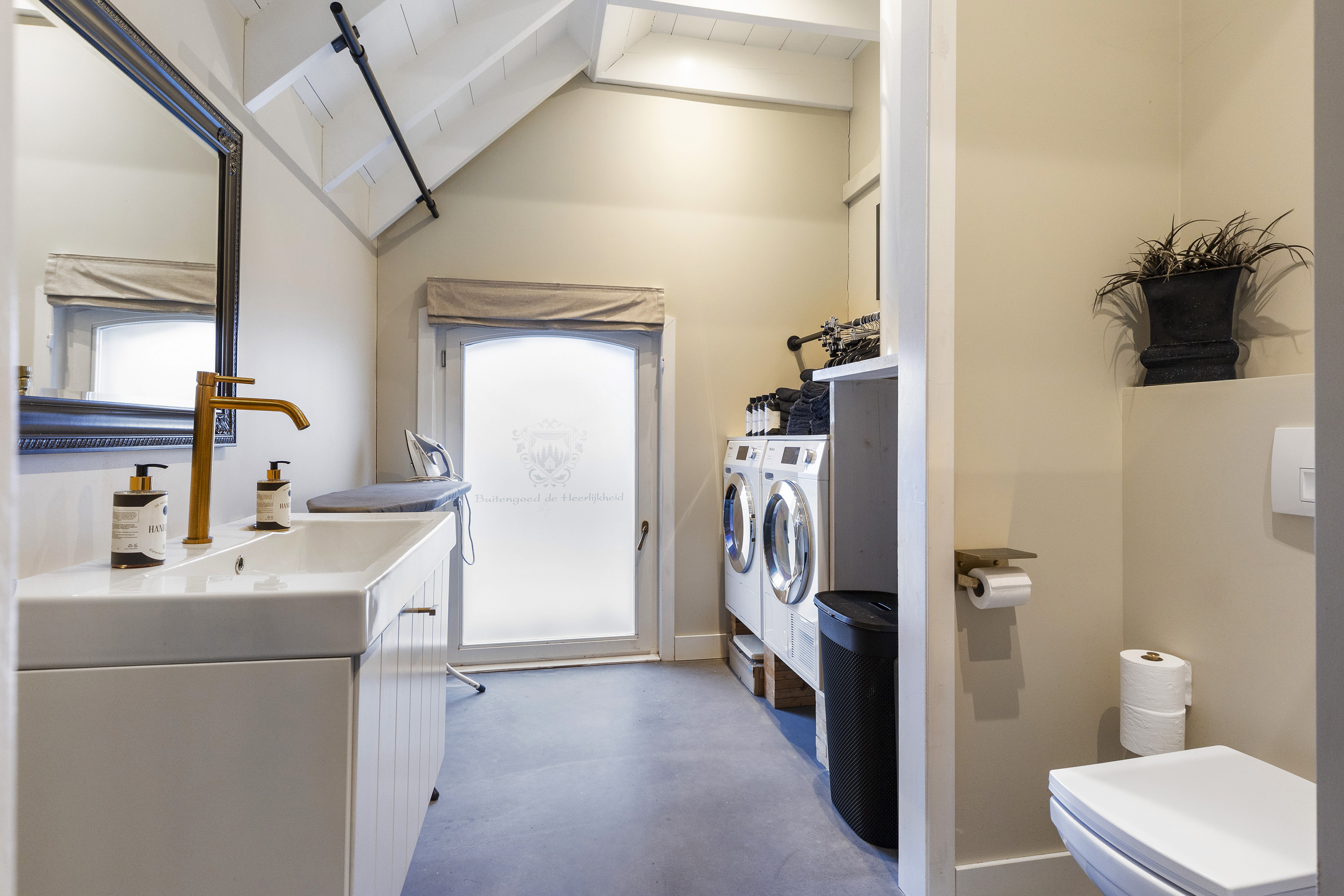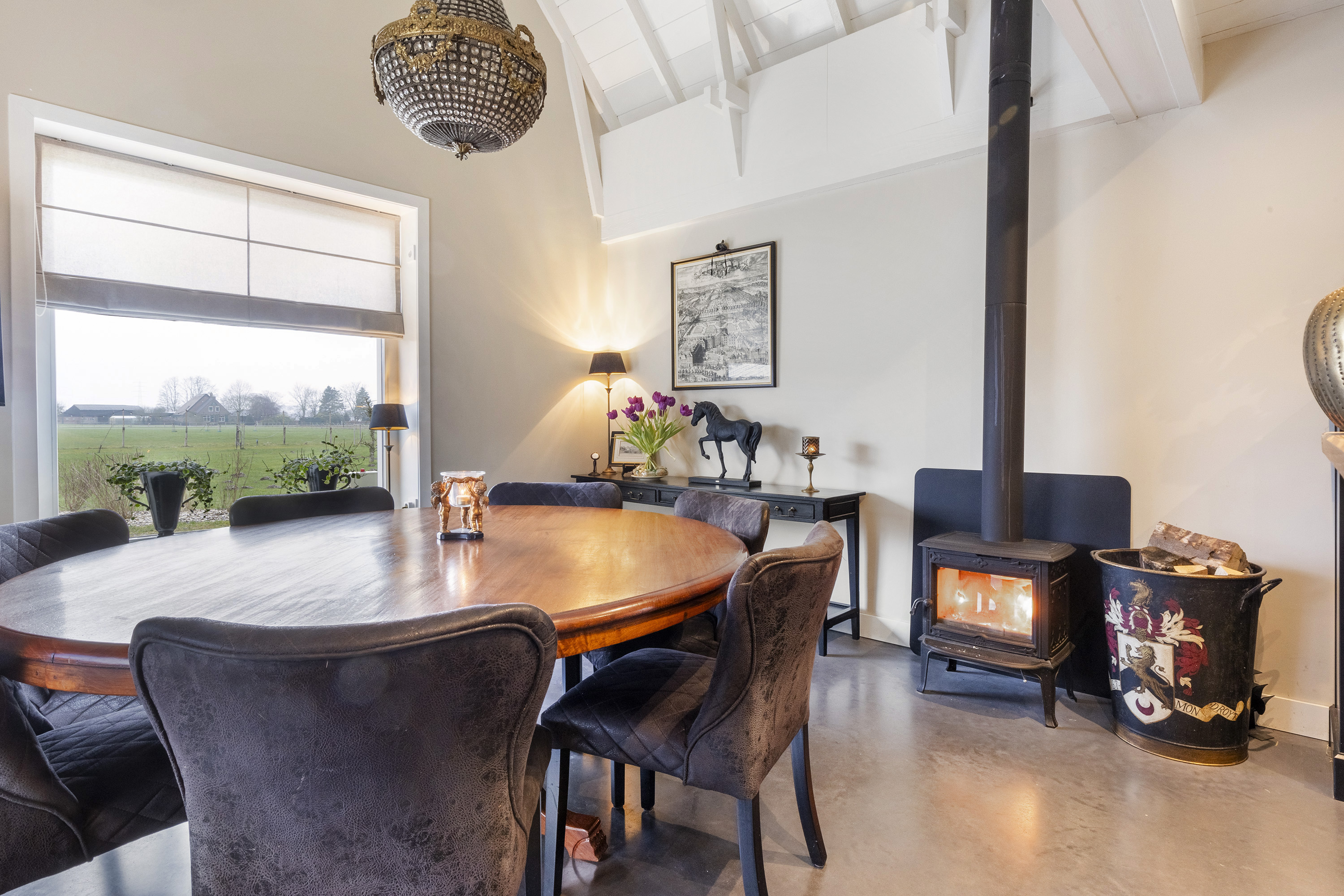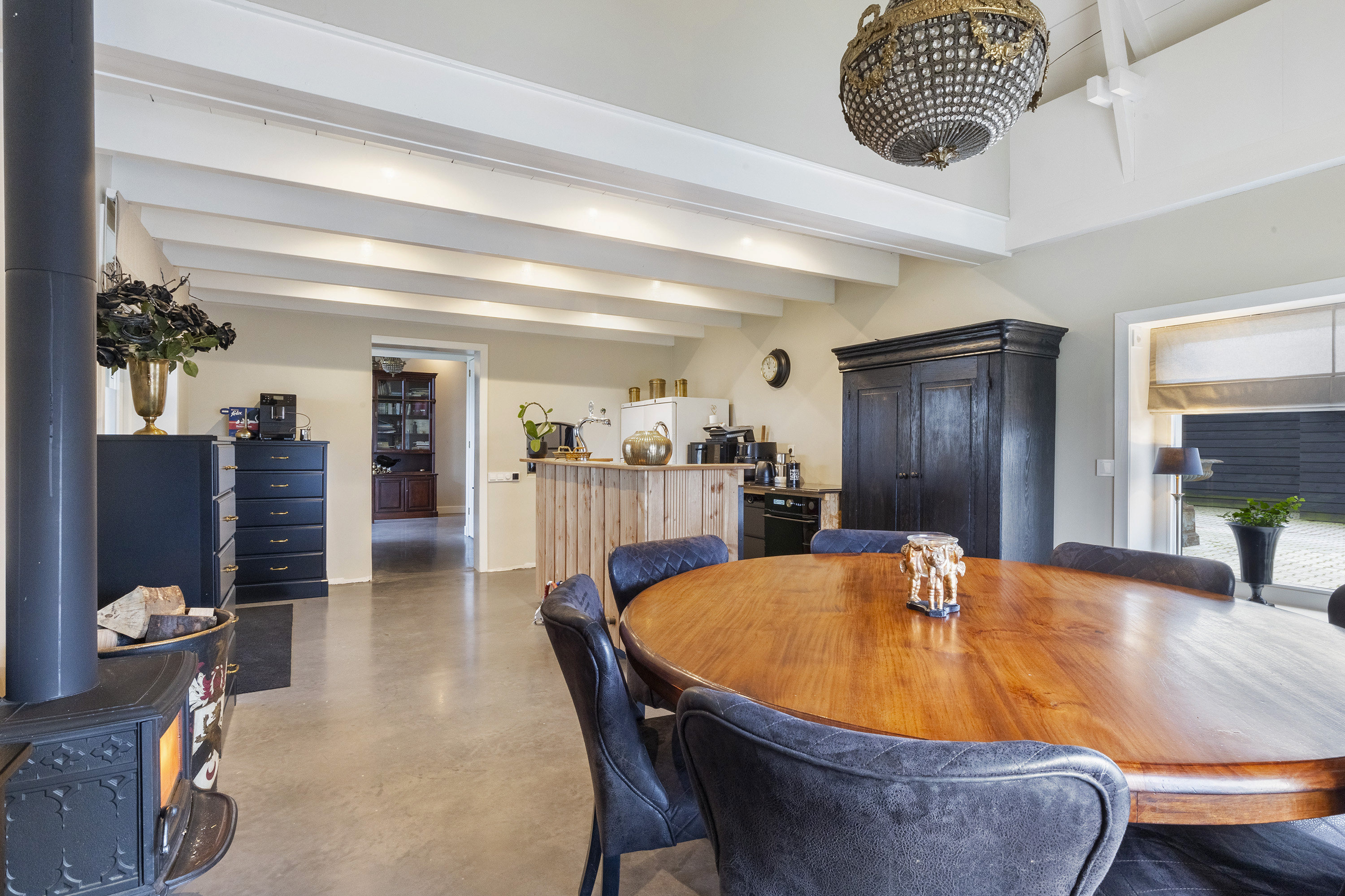 De woonkeuken vormt het hart van de woning. Deze lichte ruimte, met ramen aan drie zijden, hoge nok en een fraai balkenplafond, biedt een uitnodigende plek om te koken en te leven. De houthaard en vloerverwarming zorgen voor een aangename sfeer. Aansluitpunten voor een exclusieve keukenopstelling met kookeiland zijn reeds aanwezig, zodat u deze ruimte geheel naar eigen wens kunt realiseren. Via dubbele tuindeuren is er directe toegang tot de veranda en de tuin, waar het uitzicht vrij en weids is.