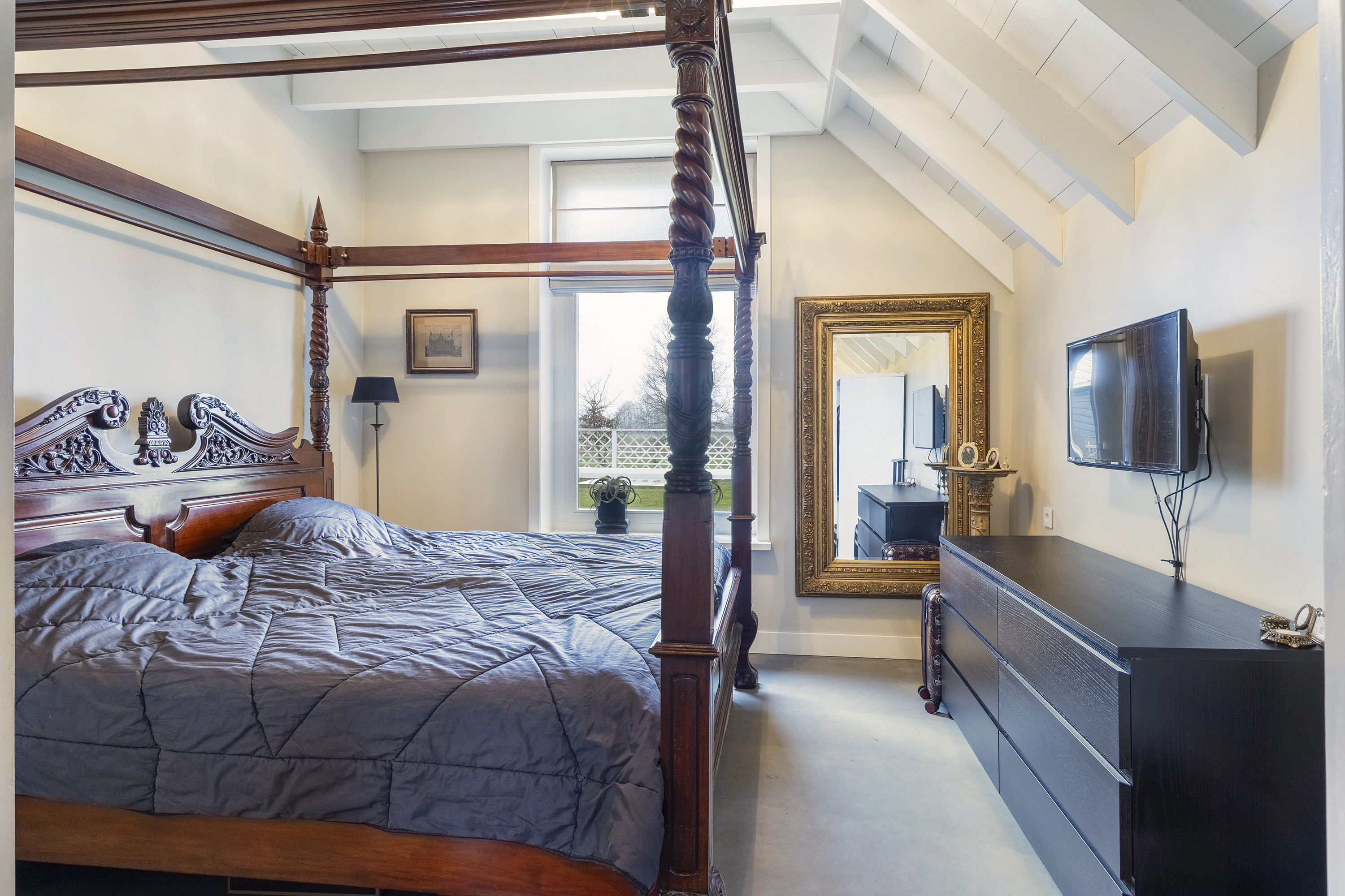 Op de begane grond bevindt zich daarnaast een royale hoofdslaapkamer met een open, loftachtige indeling en uitzicht op de tuin. De slaapkamer staat in verbinding met een en-suite kleedruimte en een inloopdouche met zwarte betegeling, een wastafelmeubel, toilet en een separate wasruimte.