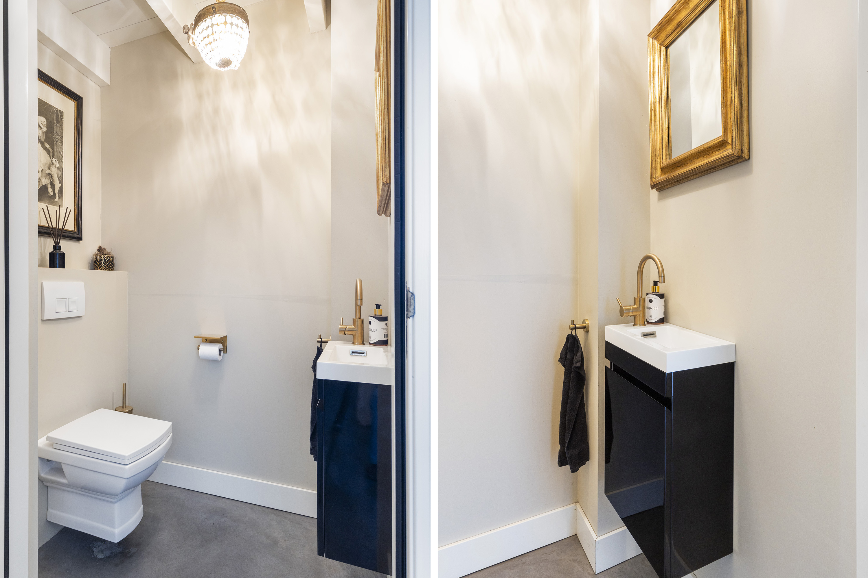 Via de karakteristieke tweedelige voordeur met venster betreedt u de royale hal, waar direct de ruimtelijkheid en kwaliteit voelbaar zijn. Hier bevinden zich de meterkast (18 groepen) en een praktische ingebouwde kastruimte onder de trap.