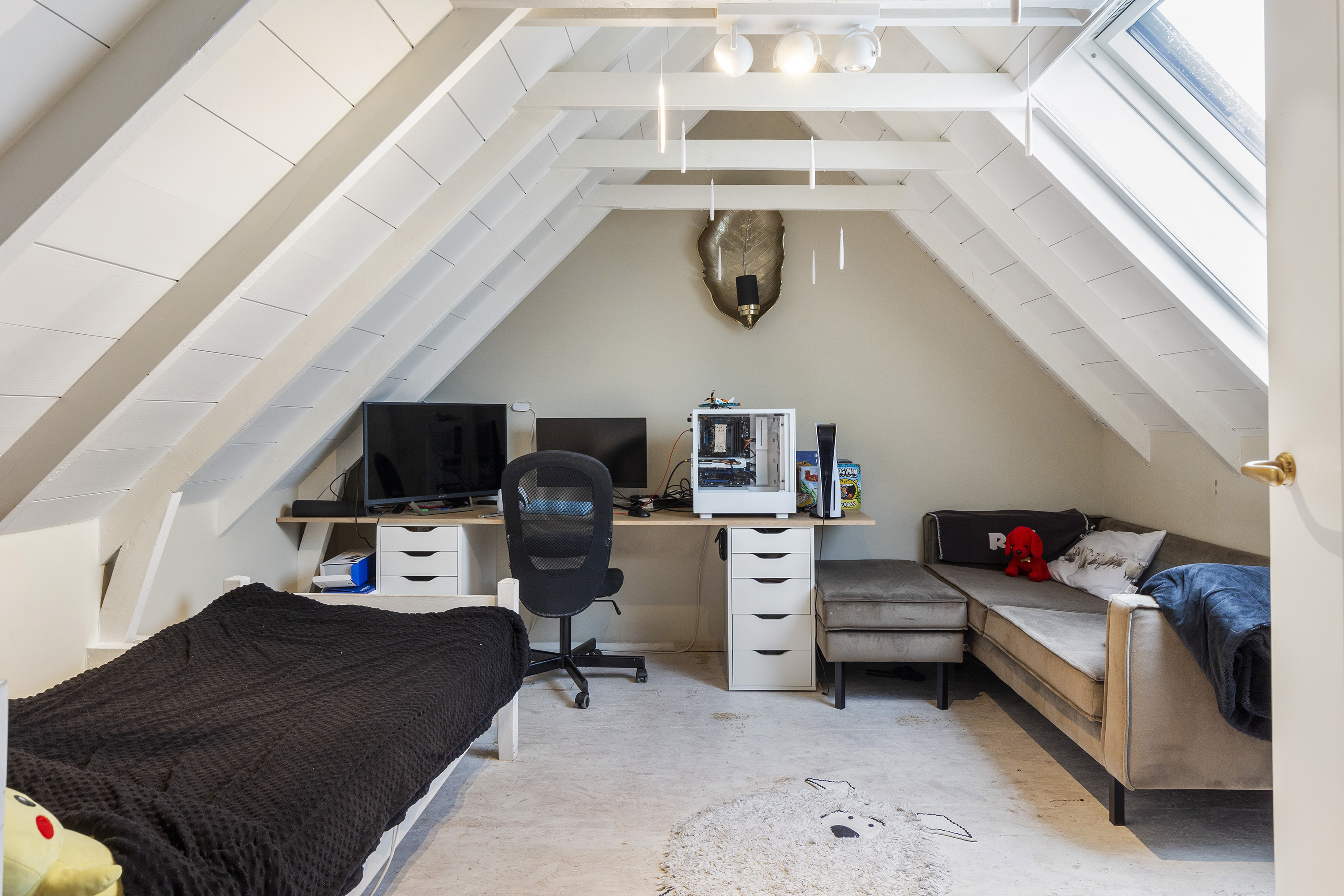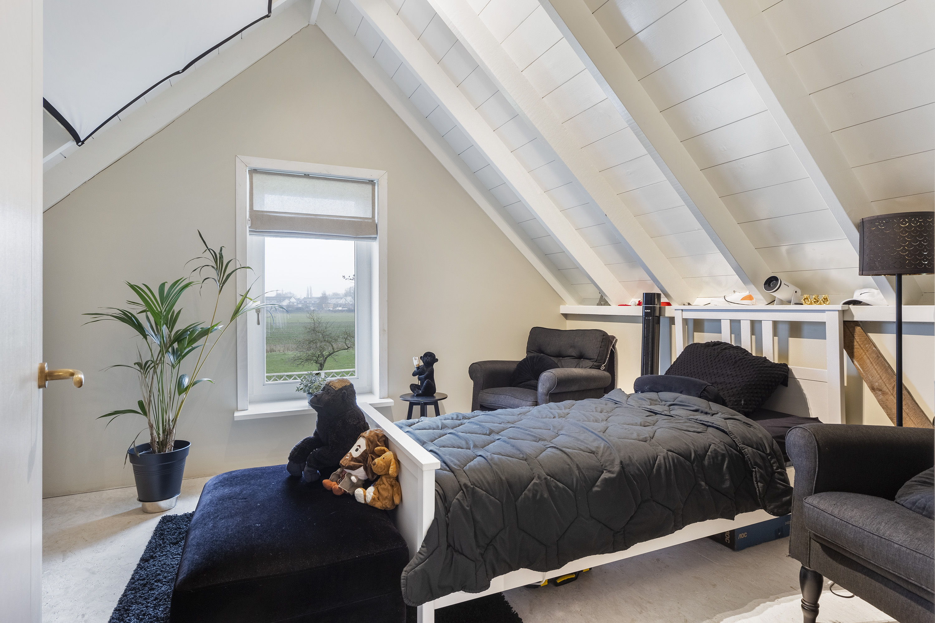 Via een bordestrap bereikt u de overloop. Hier bevinden zich drie ruime slaapkamers. Twee kamers beschikken over een hoge nok en dakvensters, waardoor zij zich uitstekend lenen voor een comfortabele slaapruimte in combinatie met een werk- of kleedgedeelte. De derde kamer biedt eveneens een prachtig uitzicht over het omliggende landschap en kan desgewenst worden ingericht als tweede badkamer. Tevens is er een separaat toilet met fontein aanwezig.