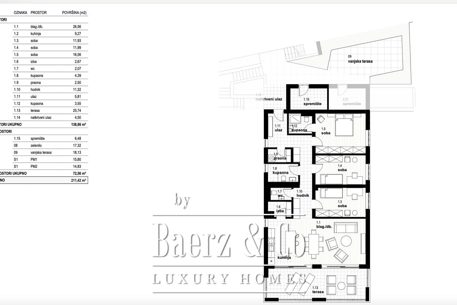 Elke van de vier slaapkamers biedt ruimte en balans, waarbij de master suite 21,91 m² beslaat en de overige drie elk 14,20 m² groot zijn. Doordachte details zoals drie stijlvolle badkamers, een inloopkast, wasruimte, voorraadruimte en berging dragen bij aan het woongenot. Een overdekt terras van 26,14 m² brengt het panoramische uitzicht op de Adriatische Zee naar het dagelijks leven, aangevuld met extra buitenterrassen en een aangelegde tuin.