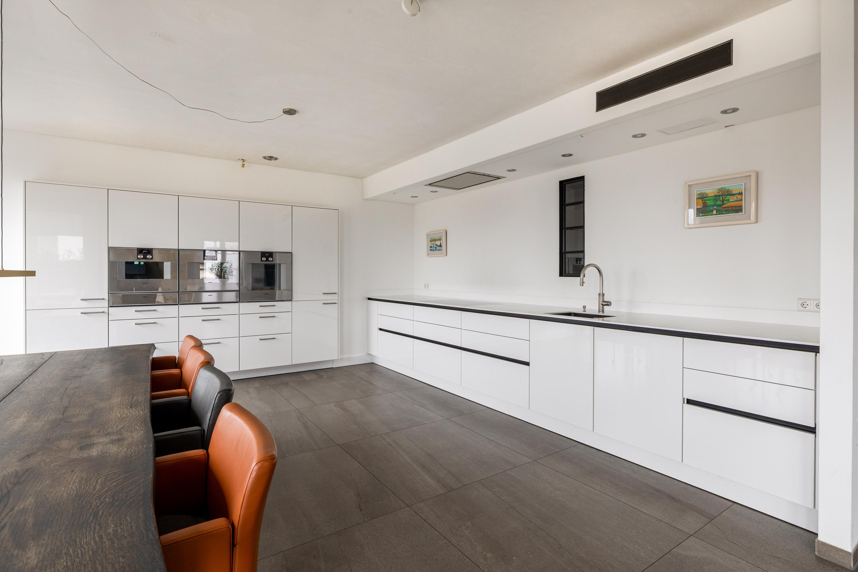 Aansluitend bevindt zich de zeer royale leefkeuken, een plek die uitnodigt tot lange diners en gezellige momenten. De Siematic keuken is strak, tijdloos en van alle gemakken voorzien. Met hoogwaardige Gaggenau apparatuur, veel werkruimte en een praktische indeling is dit een keuken waar koken vanzelf gaat. Of je nu uitgebreid wilt uitpakken of juist comfortabel dagelijks gebruik zoekt: hier zit je goed.