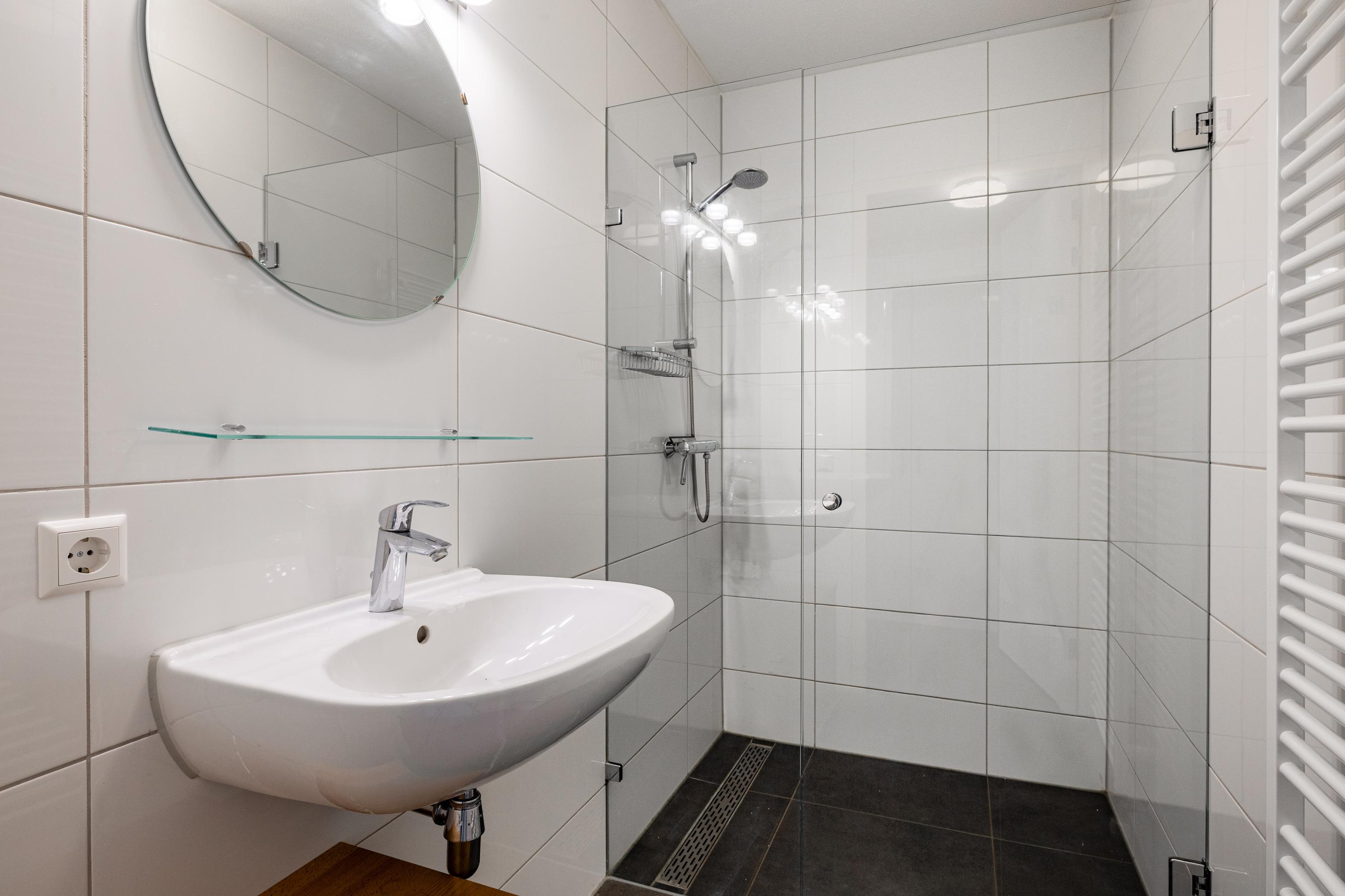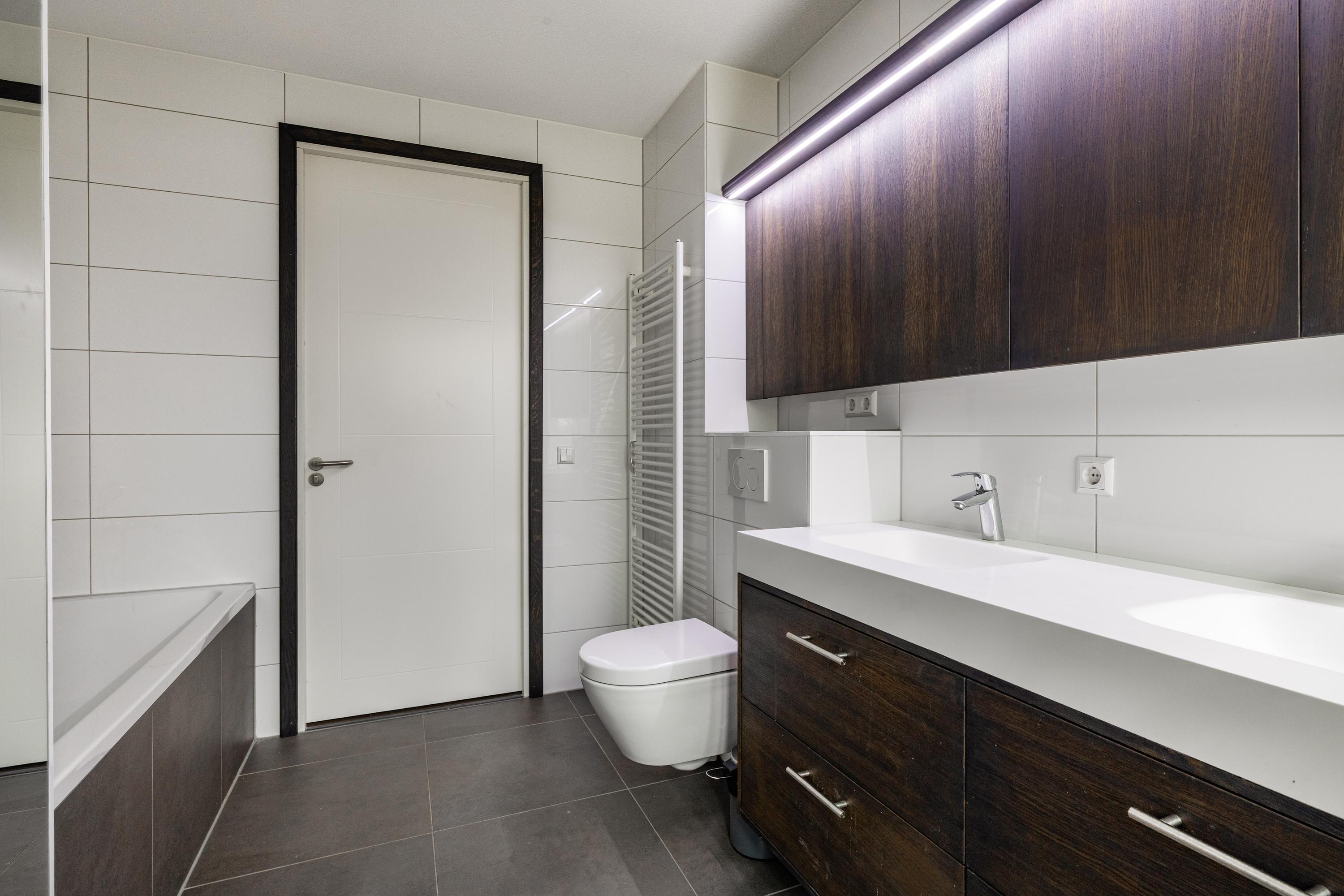 De ensuite badkamer is stijlvol en comfortabel ingericht en beschikt over een ligbad, ruime inloopdouche, dubbele wastafel en hoogwaardige afwerking. Alles is ruim opgezet en perfect passend bij de doelgroep die gelijkvloers wil wonen zonder concessies te doen aan luxe en comfort. De tweede badkamer is ideaal voor logees of (klein) gezin en zorgt ervoor dat iedereen hier zijn eigen plek heeft.