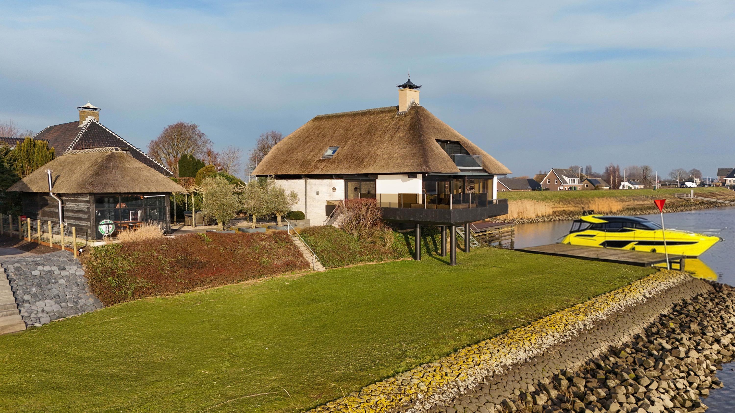 De Werf 5 in Lekkerkerk is een huis voor mensen die weten wat ze willen. Rust, ruimte, water aan je voeten en comfort op hoog niveau. Deze rietgedekte villa ligt op een werkelijk zeldzame plek, direct aan de rivier de Lek, met een eigen aanlegsteiger en bootlift. Hier stap je vanuit je tuin zo de boot op en vaar je richting de Biesbosch, Dordrecht of Rotterdam. Het uitzicht over het water verveelt nooit en verandert elk moment van de dag. Dit is wonen met allure, vrijheid en privacy.