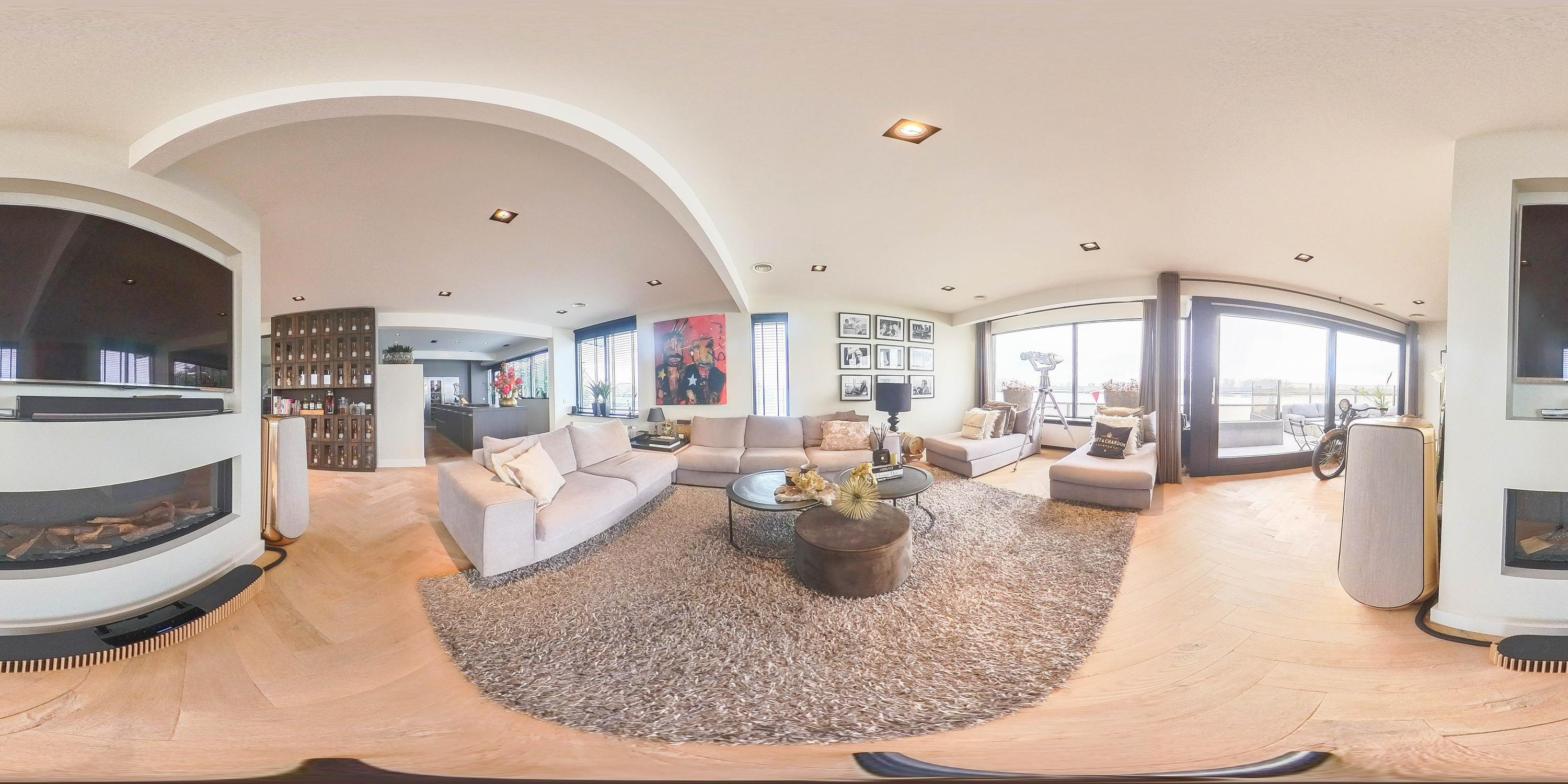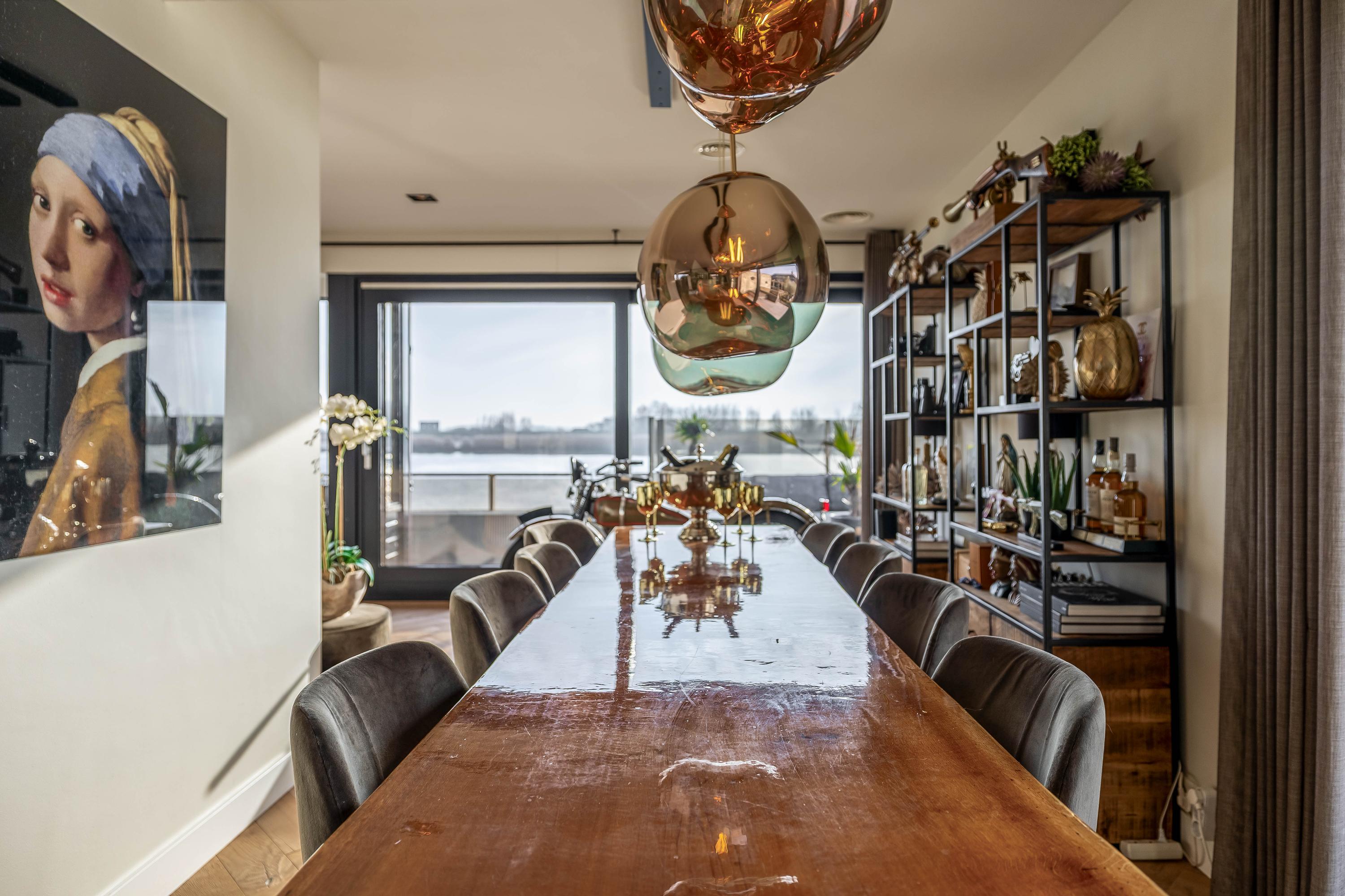De woonverdieping is ruim opgezet en voelt direct prettig aan. Grote raampartijen zorgen voor veel licht en maken het uitzicht onderdeel van het interieur. De woonkamer biedt volop ruimte voor meerdere zitplekken, waarbij het water altijd de hoofdrol speelt. Of je nu overdag geniet van de rust of ’s avonds de zon langzaam ziet zakken achter de dijk, dit huis biedt elke dag een ander decor.