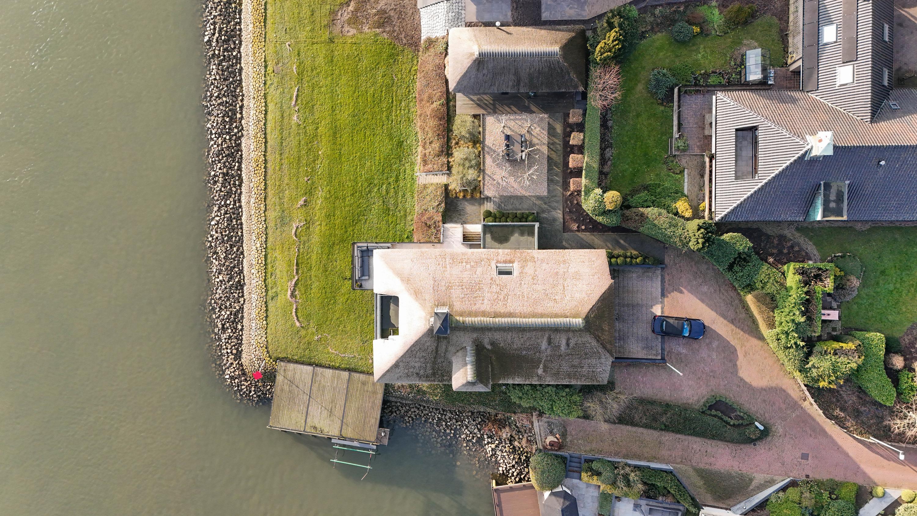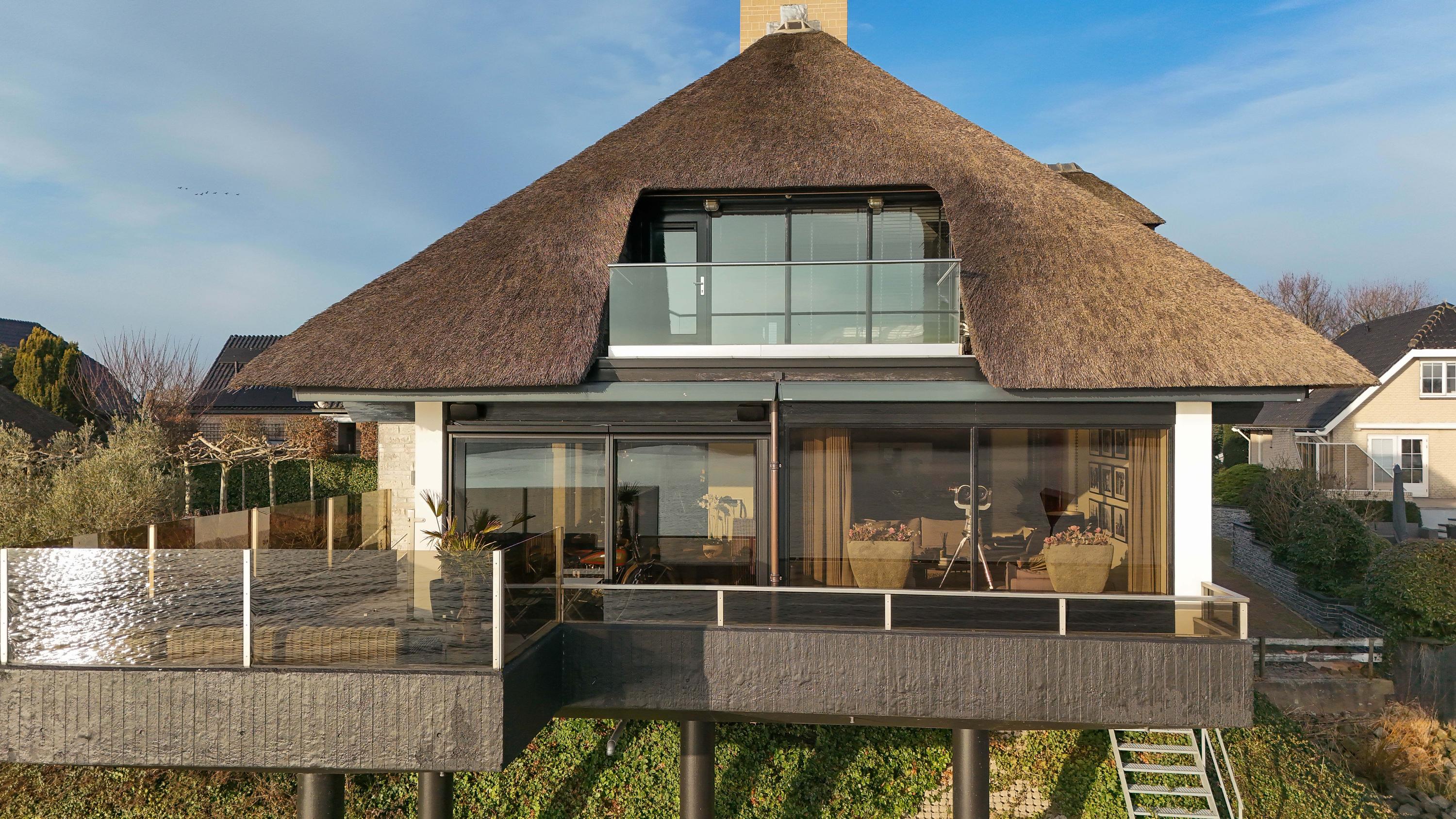 De villa staat op een royaal perceel van 1.342 m² eigen grond en is gebouwd in 1989, met hoogwaardige verbouwingen van recente datum. Het rieten dak is in 2024 nog volledig gerenoveerd en kan weer jaren mee. De architectuur past perfect bij de omgeving: stijlvol, tijdloos en met een sterke verbinding tussen binnen en buiten. Dankzij de ligging aan de rivier geniet je vanuit vrijwel iedere leefruimte van een panoramisch uitzicht over het water en het voorbijtrekkende scheepvaartverkeer.