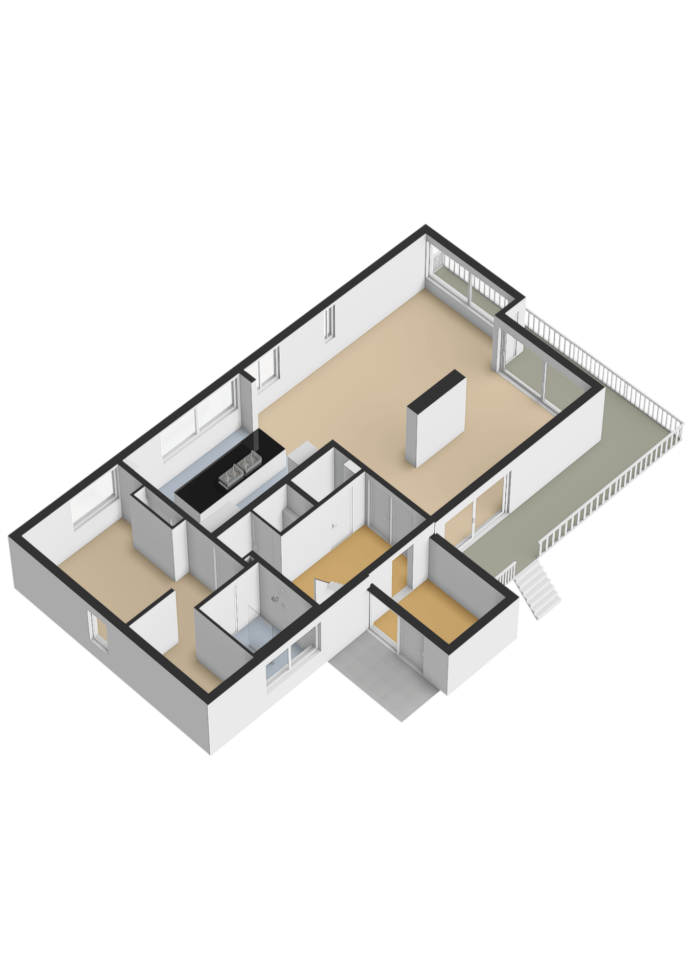 Aansluitend aan de keuken en woonruimte ligt het terras, waar binnen en buiten naadloos in elkaar overlopen. Op zonnige dagen zet je de deuren open en wordt het terras een verlengstuk van de leefruimte.