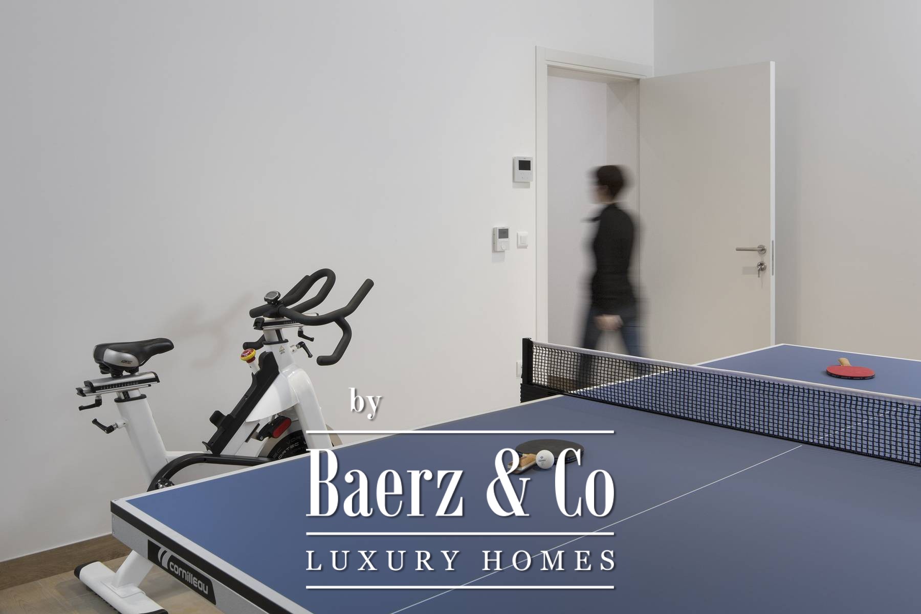 De slaapkamer op de begane grond met en-suite badkamer wordt aangevuld door drie en-suite slaapkamers op de verdieping, elk met een eigen gevoel van ruimte en openheid dankzij royale glaspartijen. Buiten koken en grillen vormt het podium voor gezellige momenten, terwijl de ochtendzon over het terras beweegt en buiten eten een dagelijks ritueel maakt. In het souterrain bevinden zich een fitnessruimte en een tafeltennistafel, voor zowel sportieve inspanning als ontspanning.