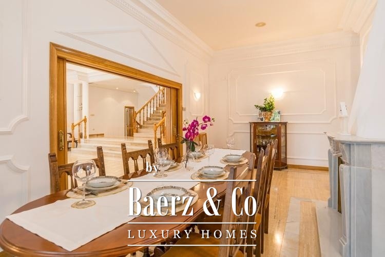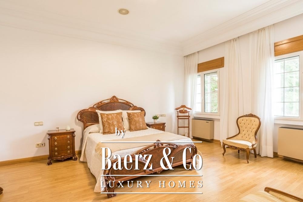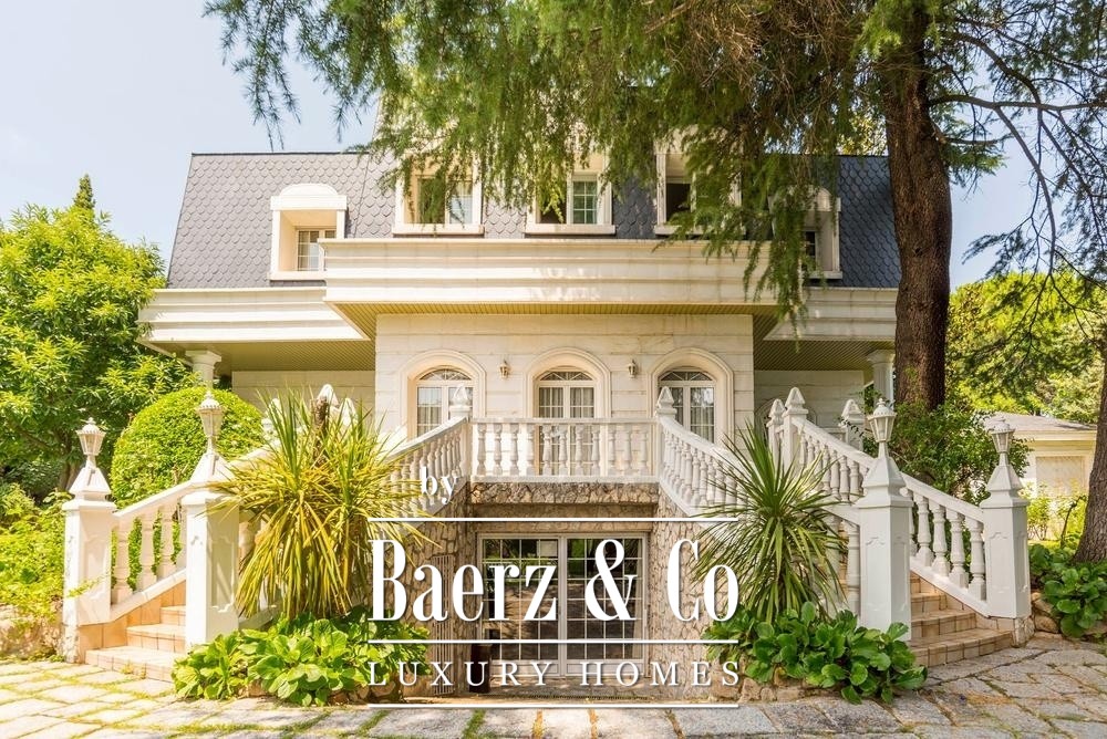 Deze uitzonderlijke vrijstaande villa ligt in El Plantío, een van de meest prestigieuze woonwijken aan de westkant van Madrid, op slechts 13 km van het stadscentrum met uitstekende verbindingen. De woning staat op een royaal privéperceel van 3.105 m² en biedt circa 952 m² bebouwde oppervlakte verdeeld over meerdere niveaus. Het ontwerp combineert klassieke elegantie met hoogwaardige afwerkingen zoals wit Macael-marmer en massief hout. De villa beschikt over zes ruime slaapkamers en acht badkamers, evenals zorgvuldig ingedeelde woonruimtes, waaronder een indrukwekkende hoofdwoonkamer met open haard, een bibliotheek, wijnkelder, privéfitnessruimte en een master suite met inloopkast en jacuzzi. Buiten vindt u prachtig aangelegde tuinen met volwassen bomen, een groot zwembad, een overdekt terras met barbecue en houtoven, en professionele tennis- en frontonbanen. Daarnaast beschikt de woning over een zelfstandig gastenappartement, ruime garagefaciliteiten en geavanceerde beveiligings- en klimaatsystemen, waardoor dit object ideaal is als luxe gezinswoning of hoogwaardige investering in een elitewijk van Madrid.