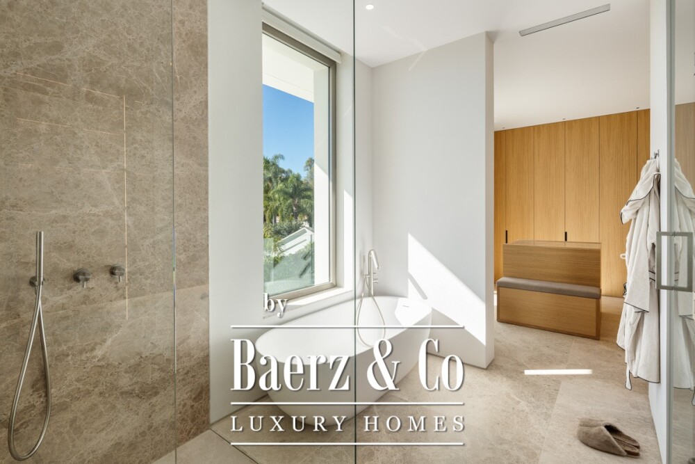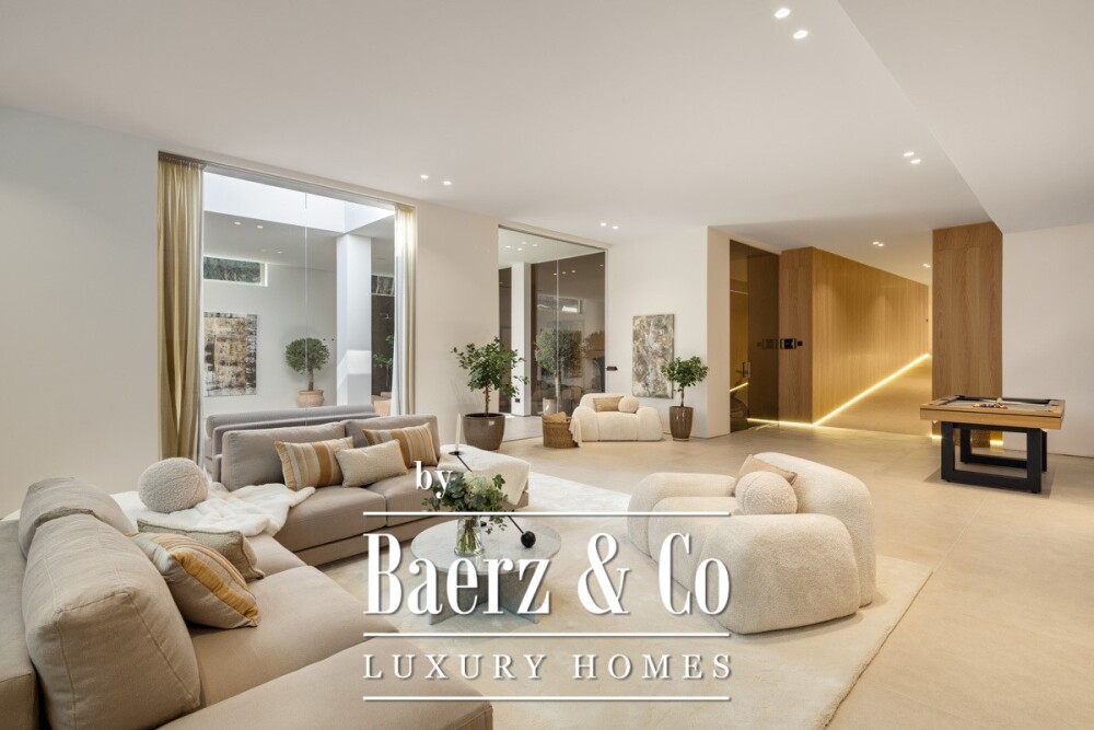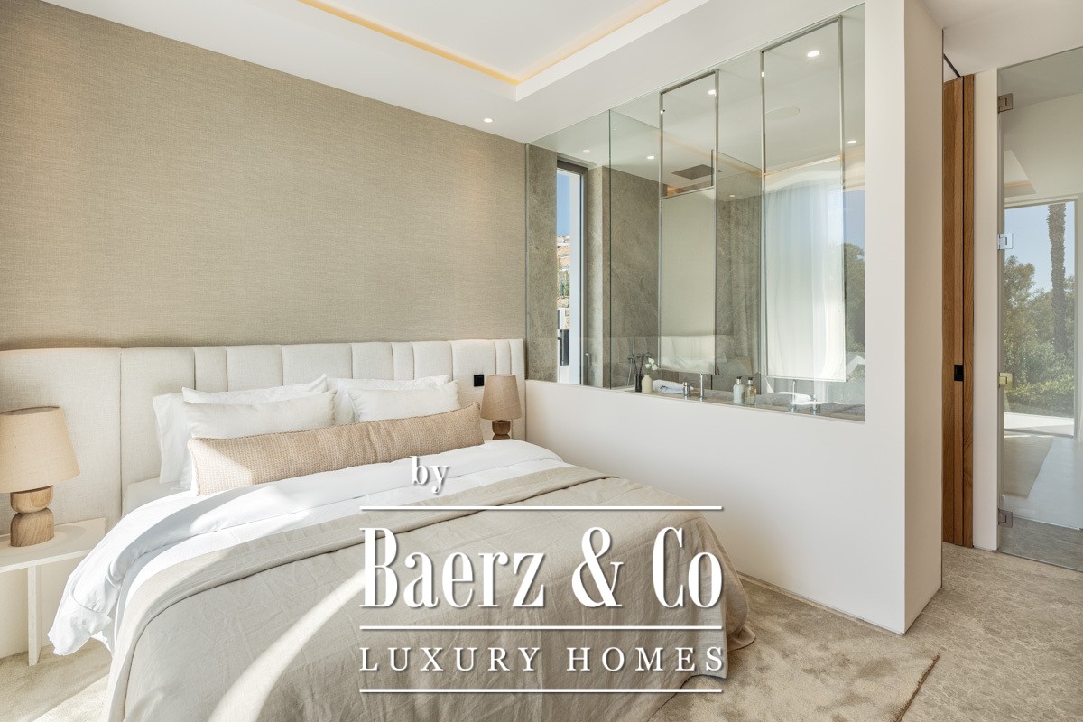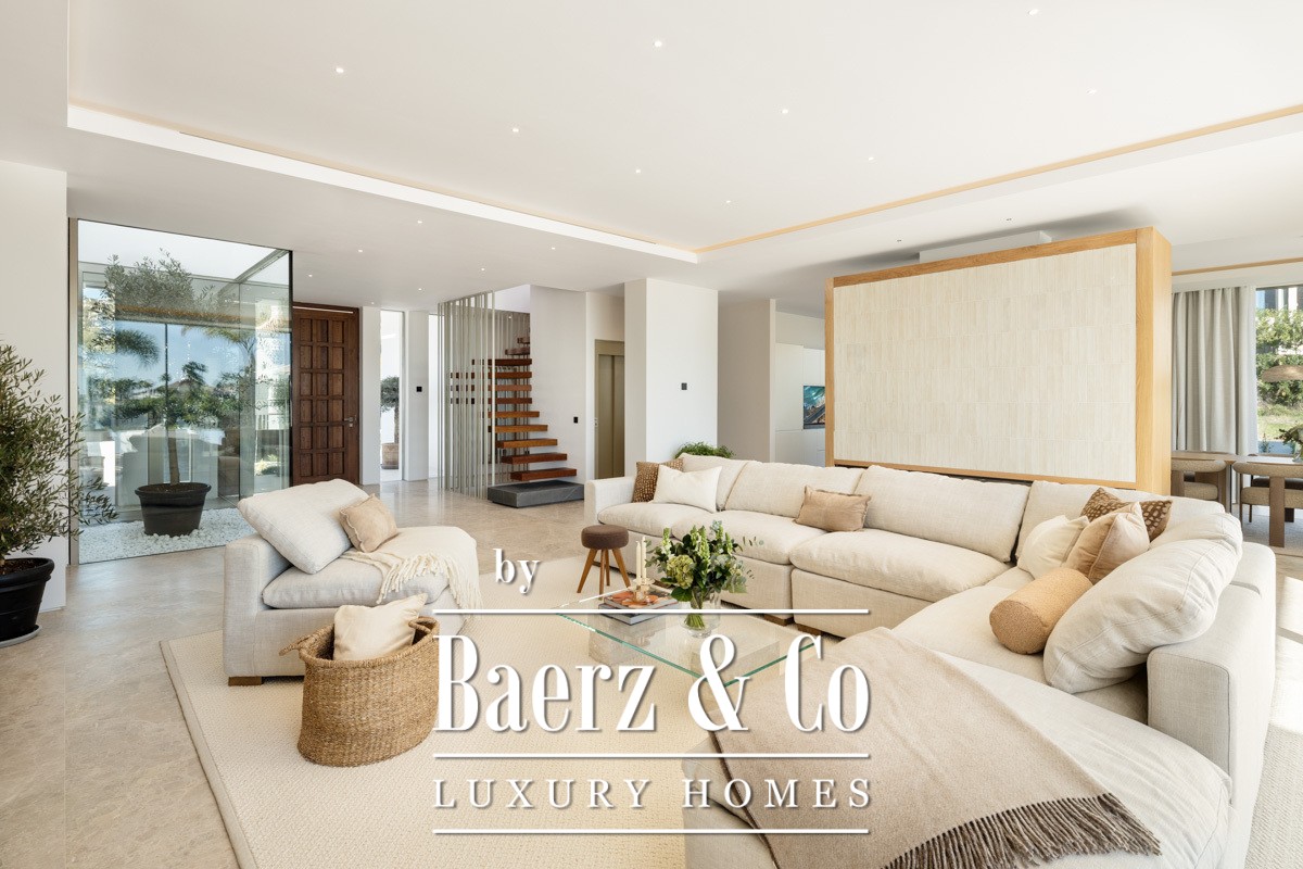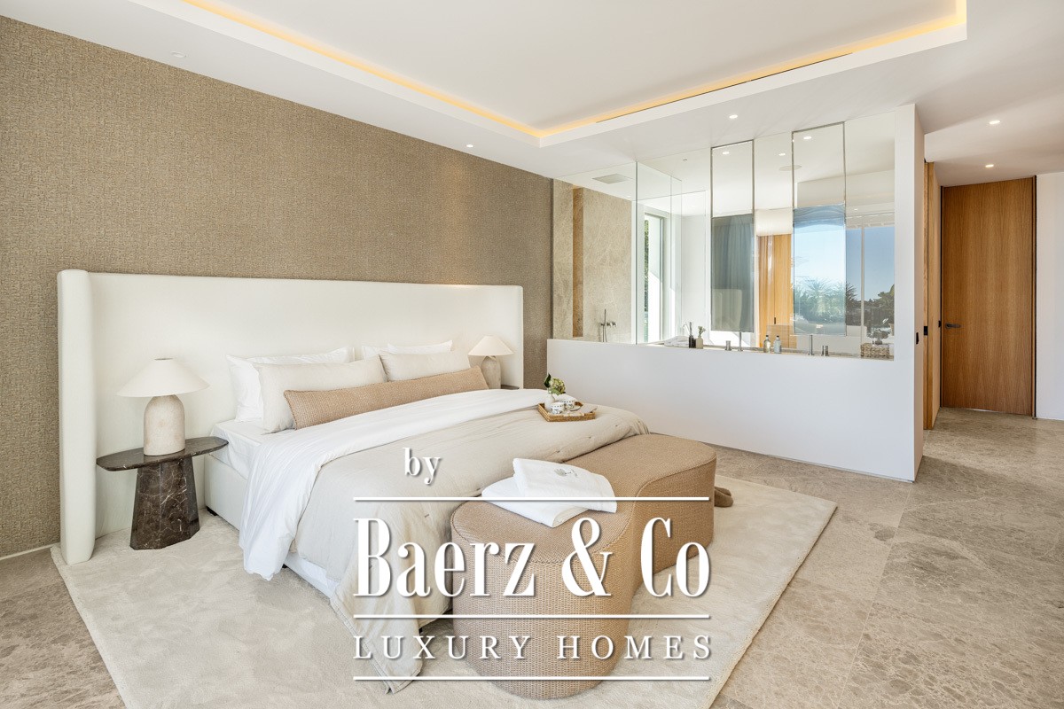 Binnen de 854 m² woonoppervlakte zorgen royale volumes en een neutraal kleurenpalet voor een subtiele luxe uitstraling. Natuurlijk licht stroomt via de grote glazen deuren naar binnen, waardoor de open leefruimtes naadloos worden verbonden met de terrassen die uitnodigen tot optimaal buitenleven. De moderne keuken is ingericht voor de meest veeleisende fijnproever, terwijl vijf slaapkamers, waaronder een exclusieve master suite met privéterras, inloopkast en verfijnde badkamer, elke bewoner een persoonlijke toevluchtsoord bieden.