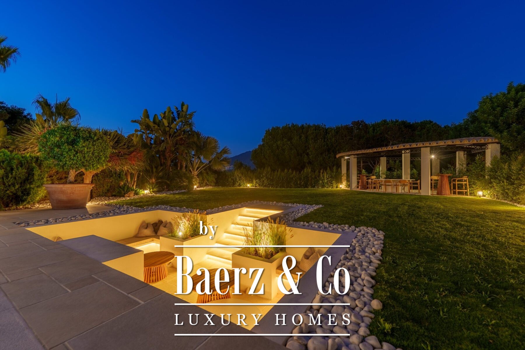 The outdoor spaces are nothing short of spectacular. Beautifully landscaped gardens surround a private swimming pool, complemented by a sunken lounge with ambient lighting and multiple shaded dining and relaxation areas. From sunrise breakfasts overlooking the sea to evening cocktails framed by mountain silhouettes, every moment here is elevated by the breath-taking surroundings.