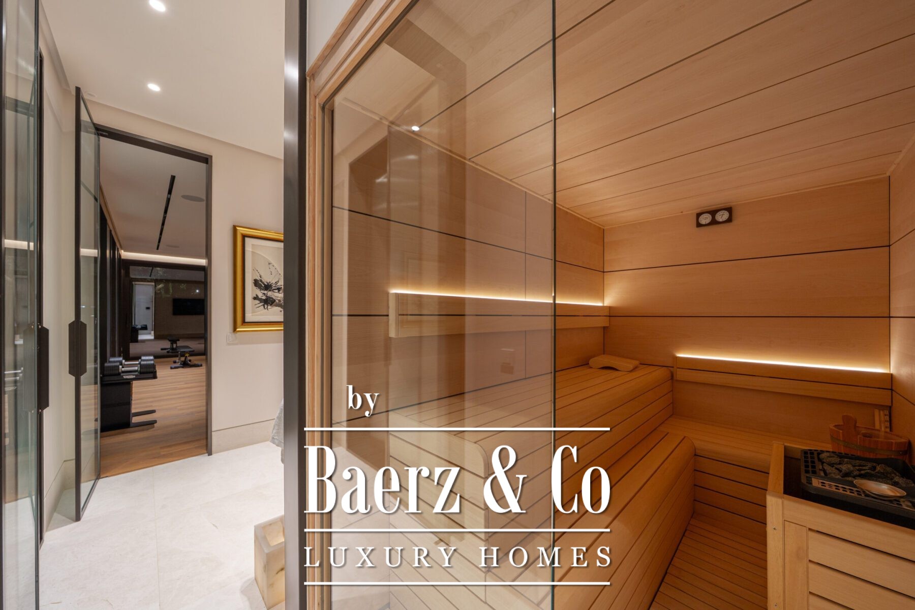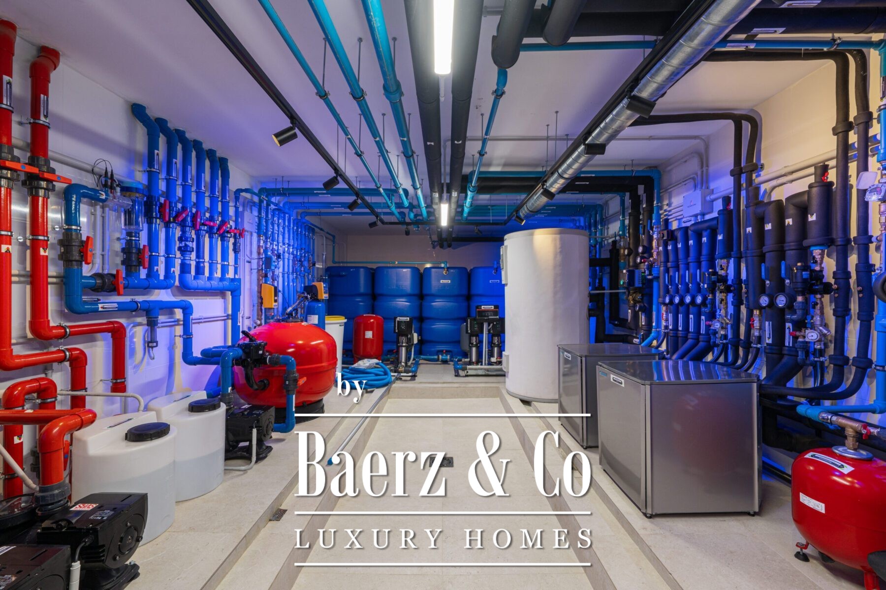 Op de benedenverdieping smelten ontspanning en wellness samen, met een exclusieve gastensuite, een privéspa voorzien van een verwarmd binnenzwembad, sauna en fitnessruimte. De entertainmentlounge en op maat gemaakte bar nodigen uit tot stijlvolle bijeenkomsten, terwijl de bioscoopzaal en technische ruimte maatwerk onderstrepen de verfijnde infrastructuur en operationele discretie van de woning.