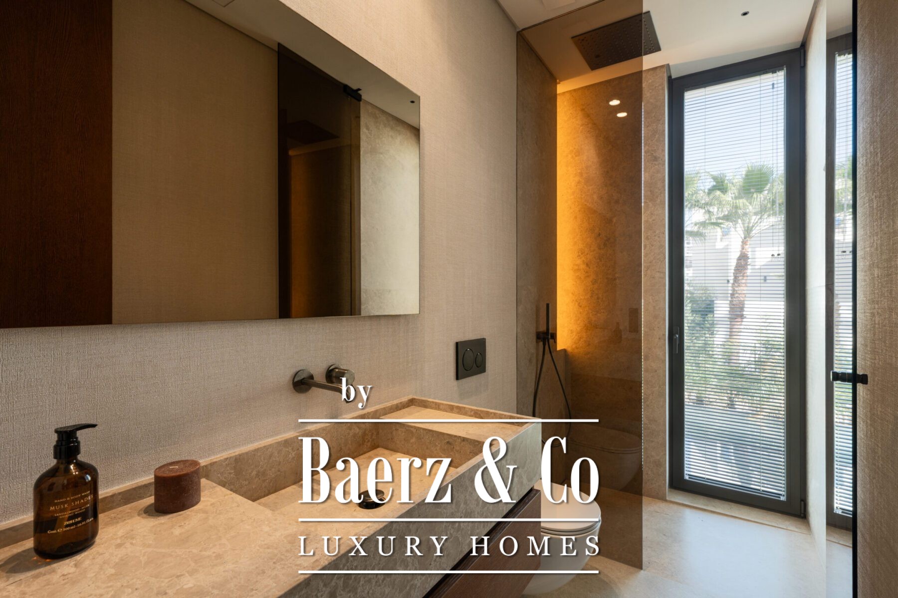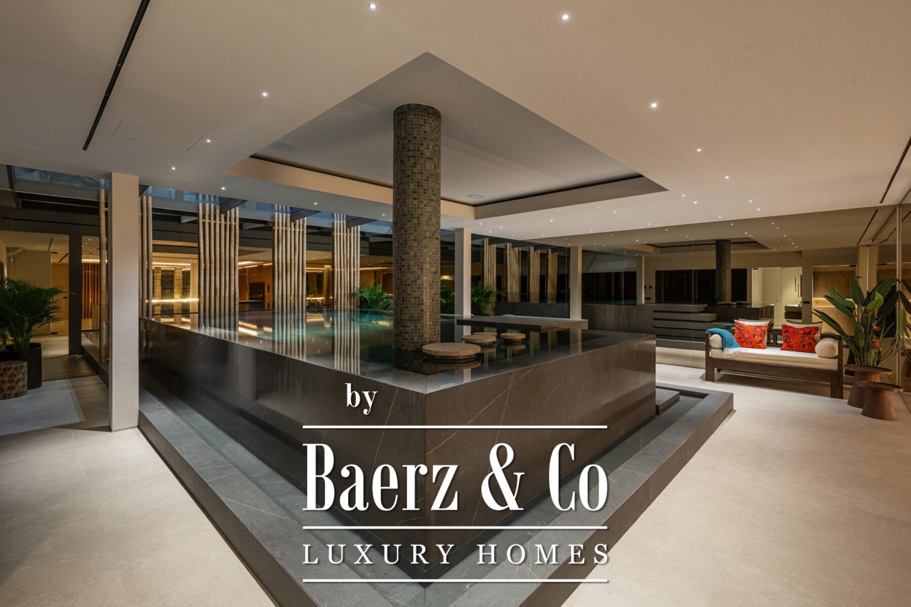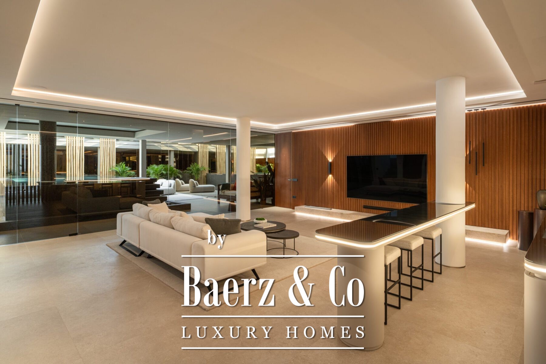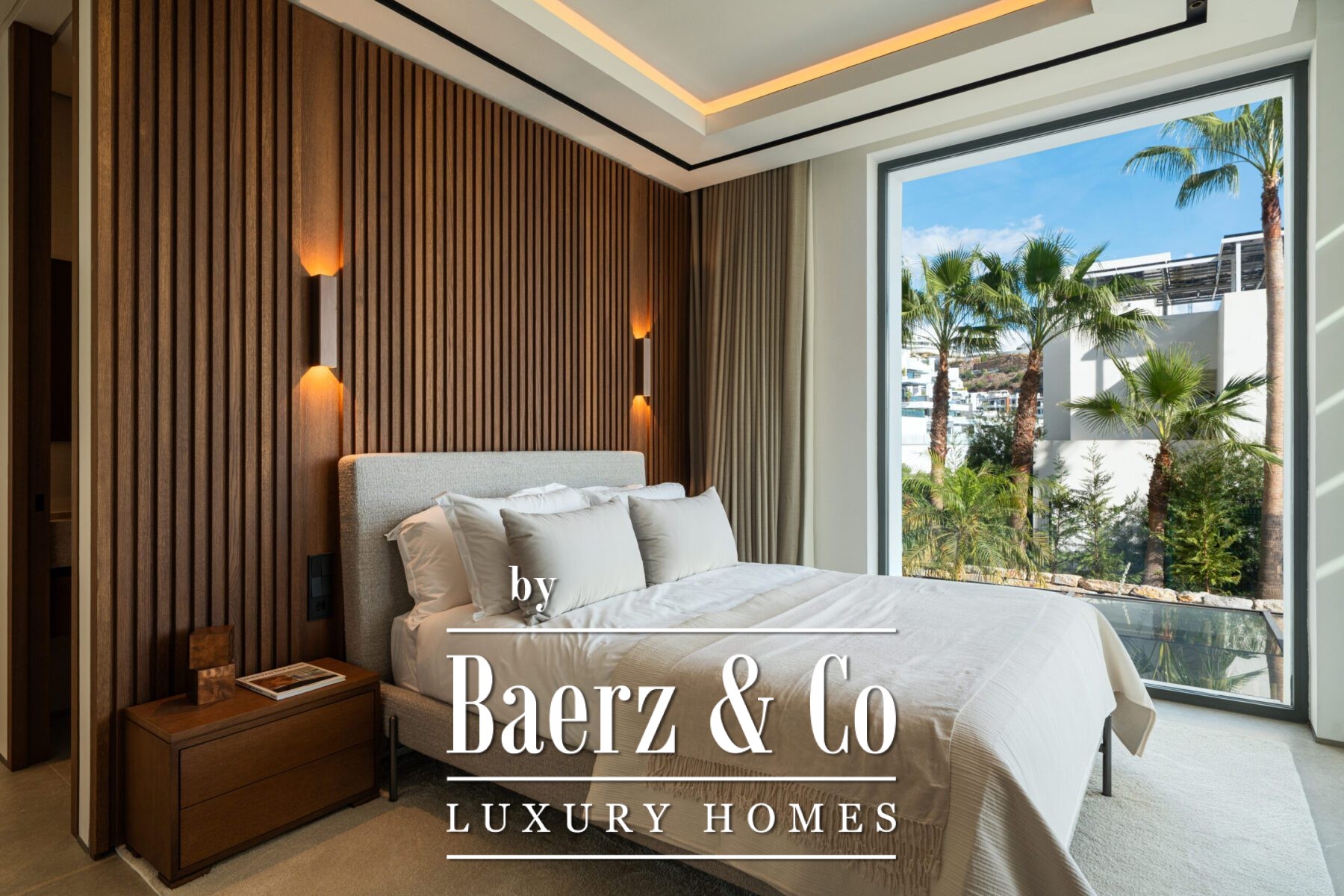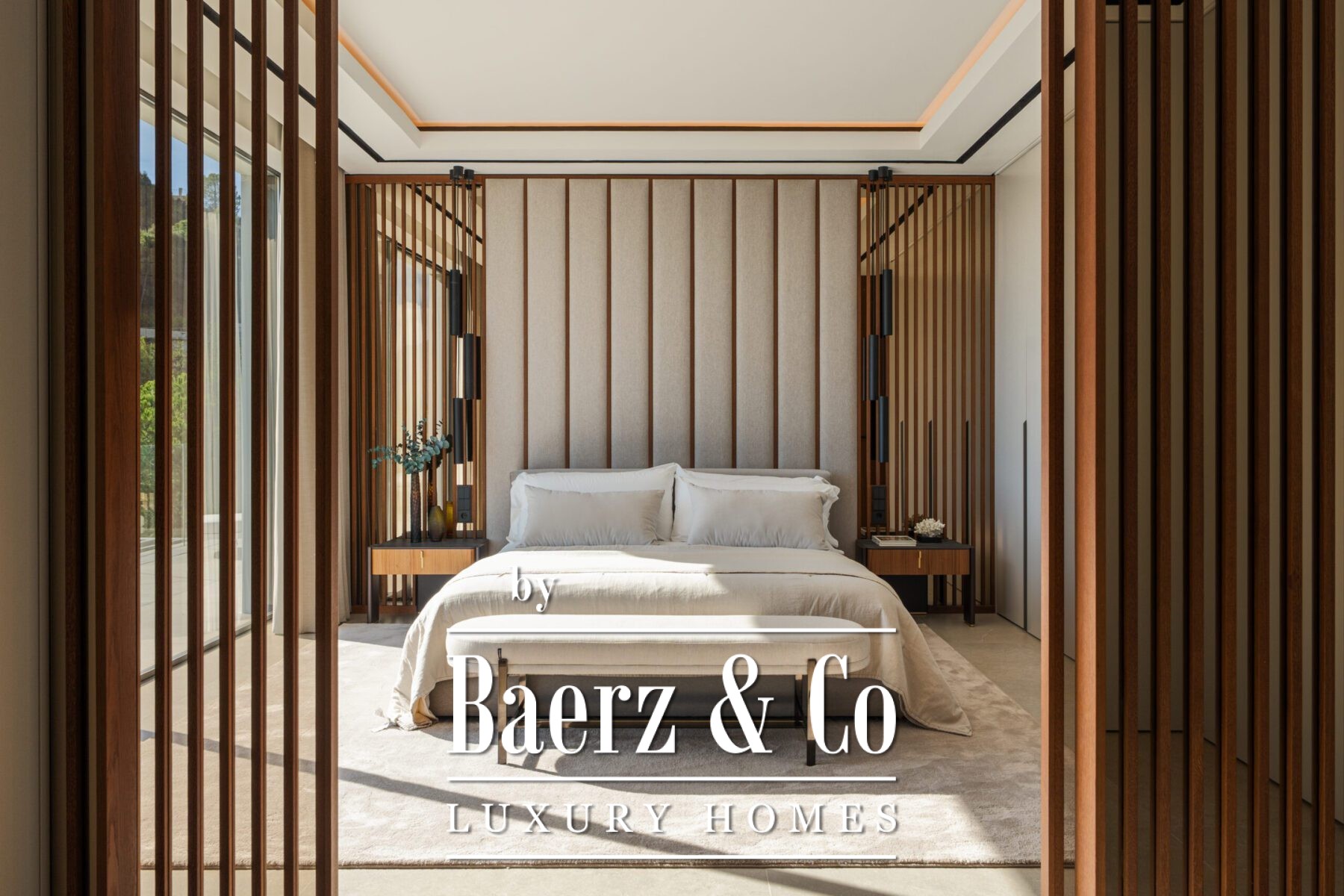 Binnen biedt het pand zes slaapkamers en zeven badkamers, verbonden door exclusief meubilair en natuurlijke, verfijnde materialen. De interieurs worden gekenmerkt door symmetrie en een naadloze overgang van binnen naar buiten. Grote schuifpanelen en royale raampartijen laten het licht en het landschap overvloedig binnenstromen, terwijl geïntegreerde verlichting en zorgvuldig gekozen texturen zorgen voor een sfeer van ingetogen verfijning.