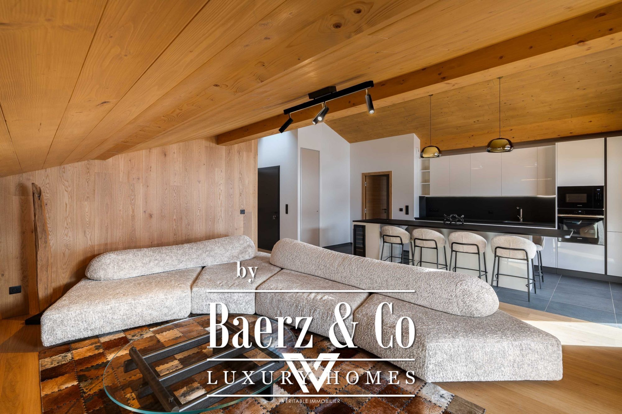 De kathedraalachtige woonkamer van ruim 40 m² vormt het hart van het appartement, gekenmerkt door royale ruimten en zorgvuldig gekozen materialen. Massief eiken parket en verfijnde houten afwerkingen creëren een sfeer van tijdloze kwaliteit, gecombineerd met een volledig uitgeruste open keuken. De leefruimte heeft een naadloze overgang naar een ruim balkon op het zuidwesten, waar u kunt genieten van het adembenemende Alpenpanorama.