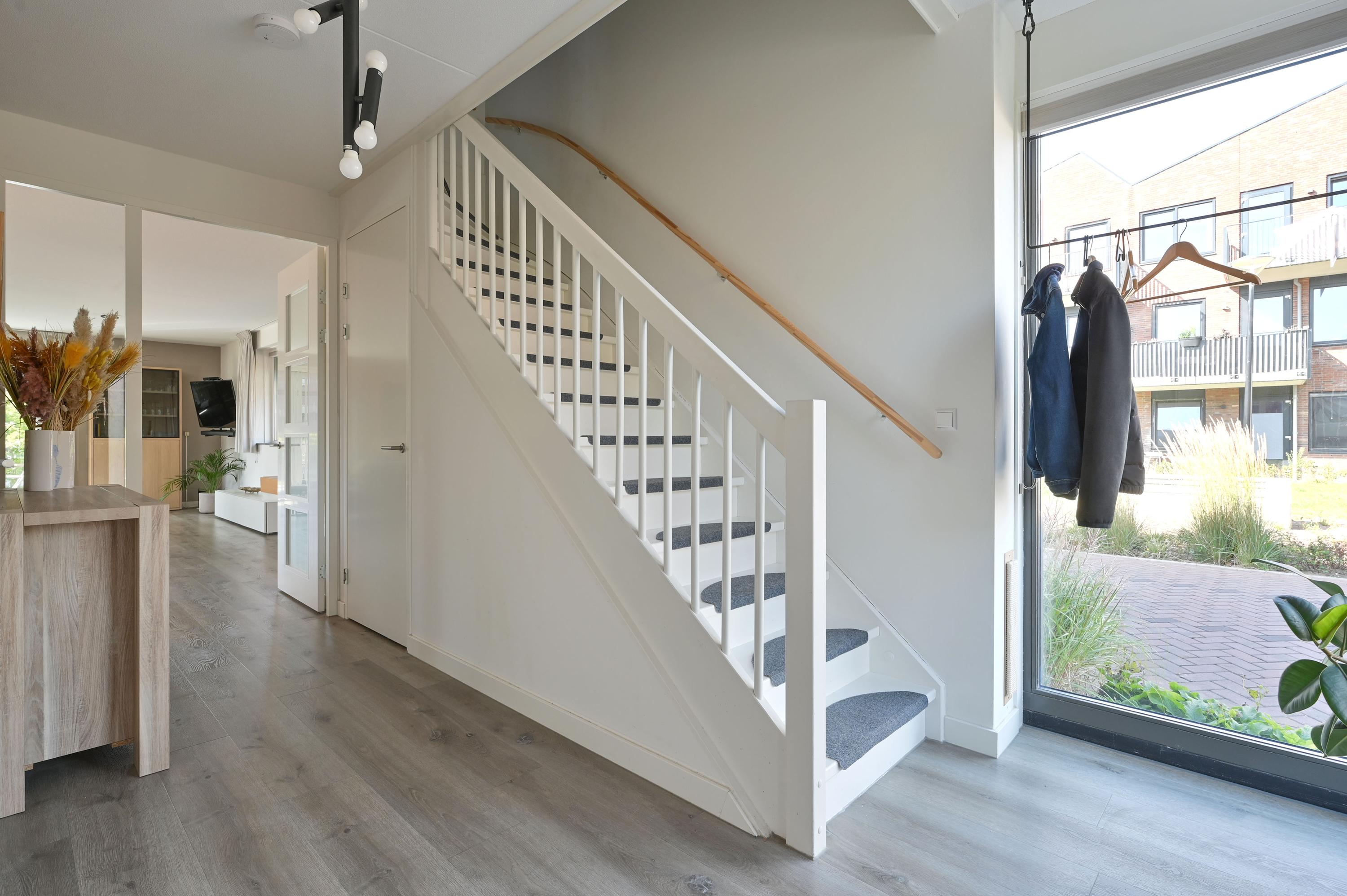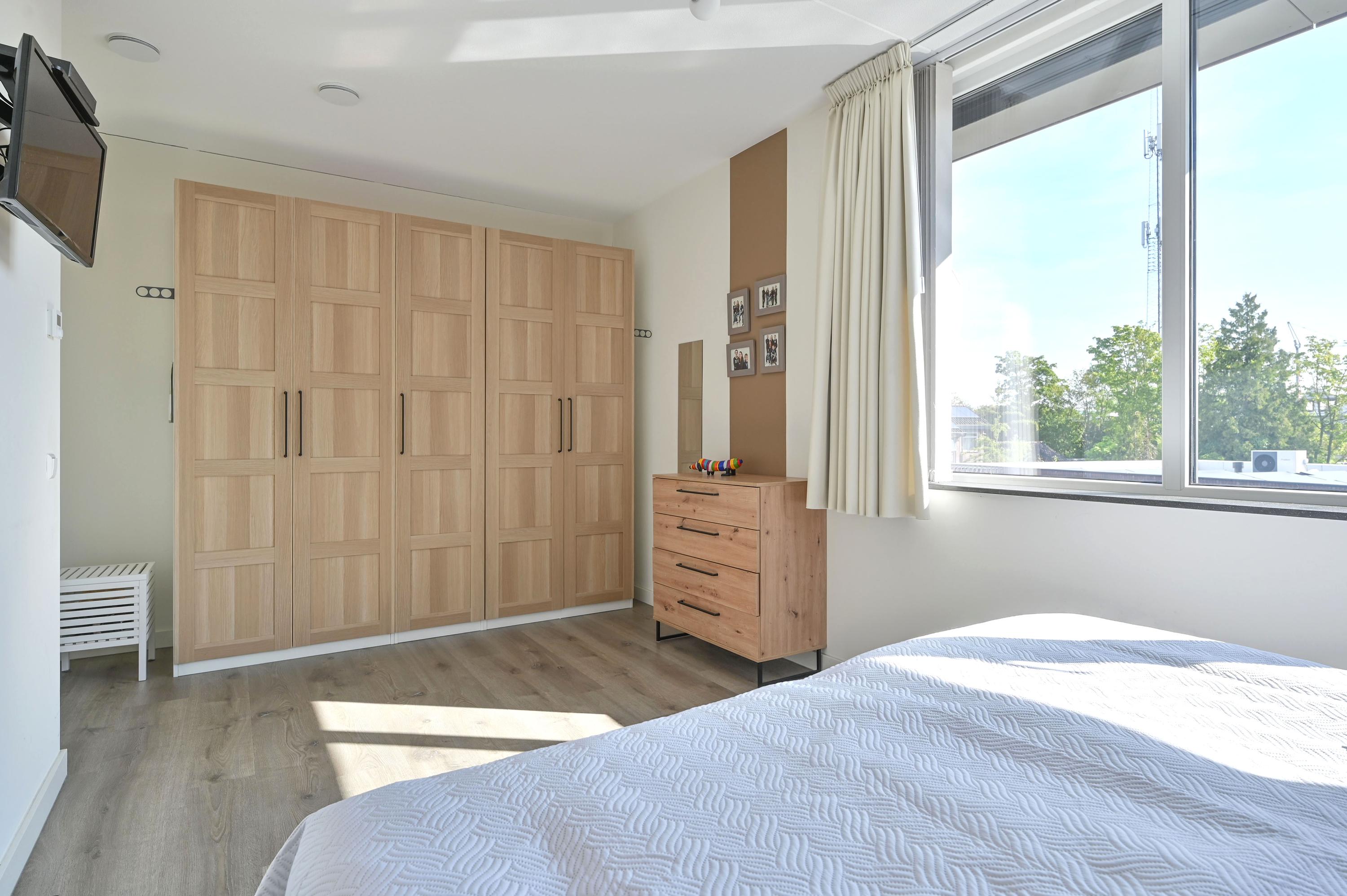 Via de vaste trap bereikt u de royale overloop, die toegang biedt tot alle vertrekken op deze verdieping. Direct links bevindt zich een praktische wasruimte met raam, voorzien van aansluitingen voor de wasmachine en de wasdroger, én genoeg ruimte voor extra opslag. Naast deze ruimte ligt een grote slaapkamer of logeerkamer, heerlijk licht dankzij het hoekraam en een extra raam. Aan de overzijde van de overloop vindt u een modern afgewerkt, separaat toilet met fontein in stijlvolle grijs-witte tinten. Daartegenover ligt de riante badkamer met raam, inloopdouche voorzien van stortdouche en handdouche, een dubbele wastafel met lades, spiegel met verlichting en een extra wandmeubel. De ruimte biedt bovendien voldoende mogelijkheden voor het plaatsen van een ligbad in de toekomst. Verder herbergt deze verdieping een technische ruimte met warmtepomp, boiler, WTW-installatie en de omvormer voor de 14 eigen zonnepanelen – met daarnaast nog volop bergruimte. Aan het einde van de gang bevinden zich weer twee royale slaapkamers: links de hoofdslaapkamer met groot hoekraam, rechts een ruime kamer met hoekraam, momenteel in gebruik als werkkamer. Over de gehele verdieping ligt dezelfde onderhoudsvriendelijke pvc-vloer in warme houtlook als beneden, compleet met vloerverwarming. Alle ramen zijn voorzien van horren en elektrische screens, die worden gevoed door de zonnepanelen – een combinatie van luxe, comfort en duurzaamheid.