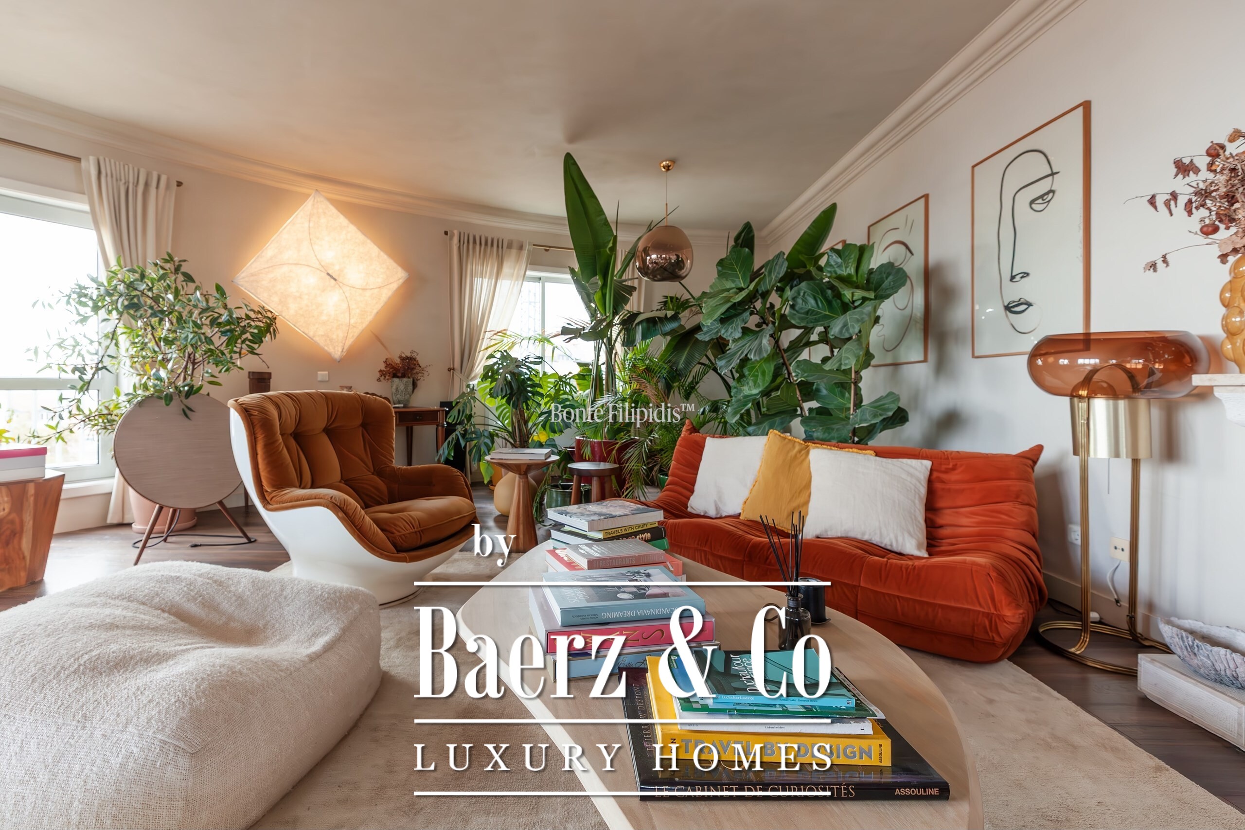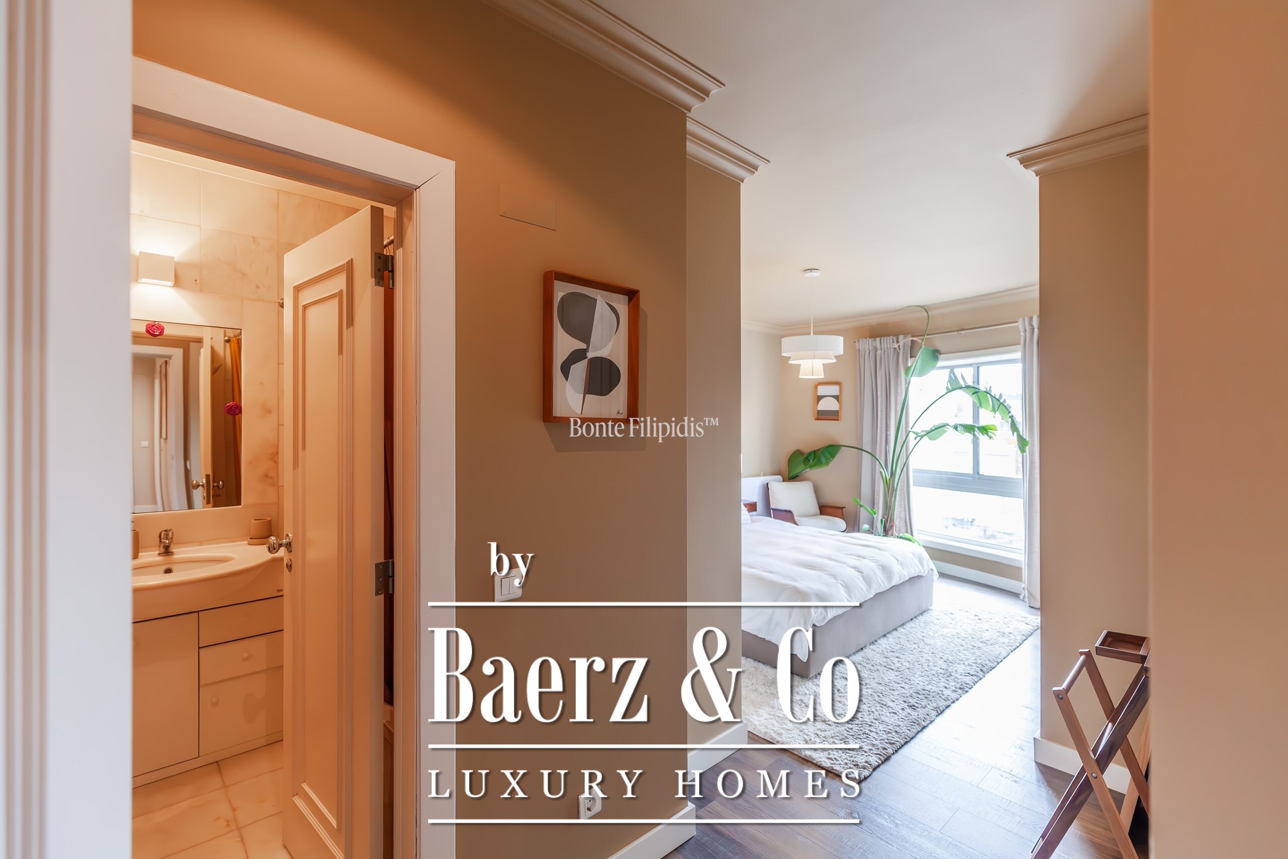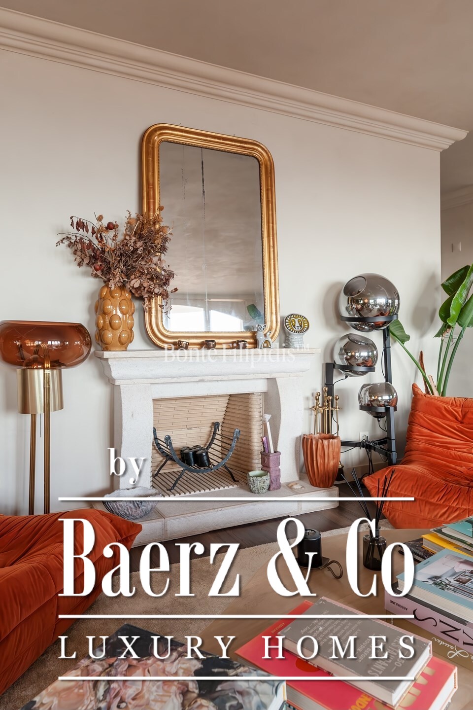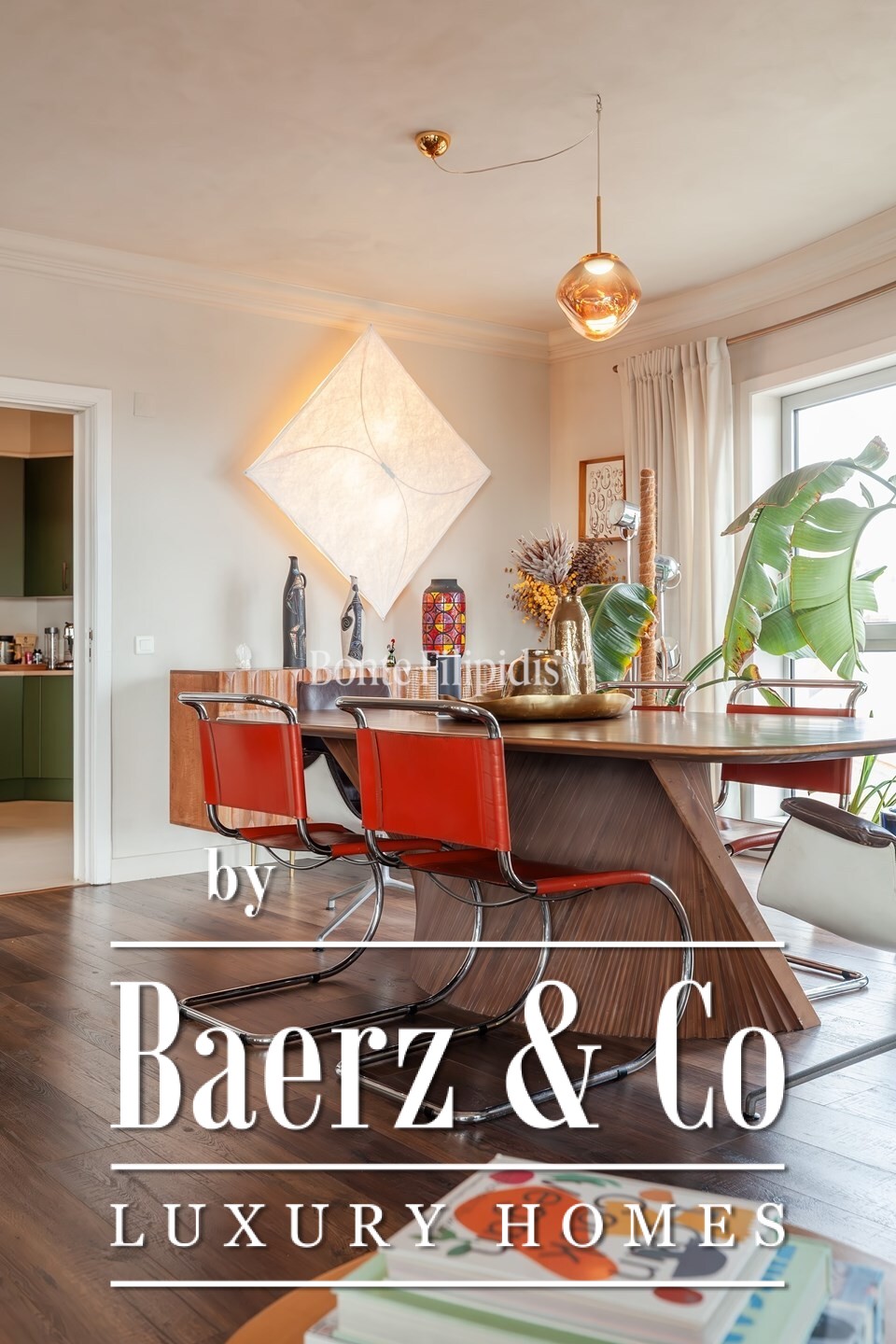 Grote raampartijen in de woon- en eetkamer bieden een kalm uitzicht op de rivier en geven toegang tot een ruim balkon, waarmee binnen en buiten moeiteloos in elkaar overlopen. Een haard vormt het middelpunt van de ruimte voor warmte en gezelligheid tijdens koelere avonden in Lissabon. De keuken is volledig uitgerust met eigentijdse apparatuur en een geïntegreerde wasruimte, waardoor functie en discretie samenkomen.