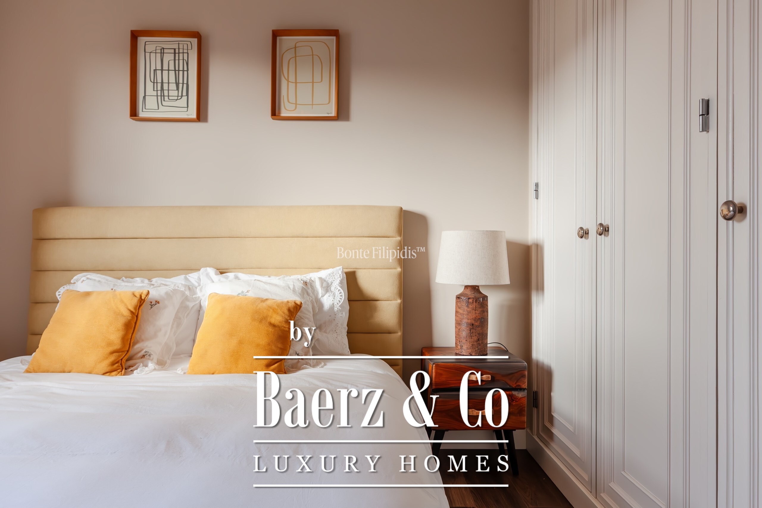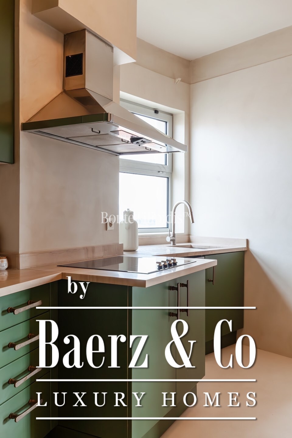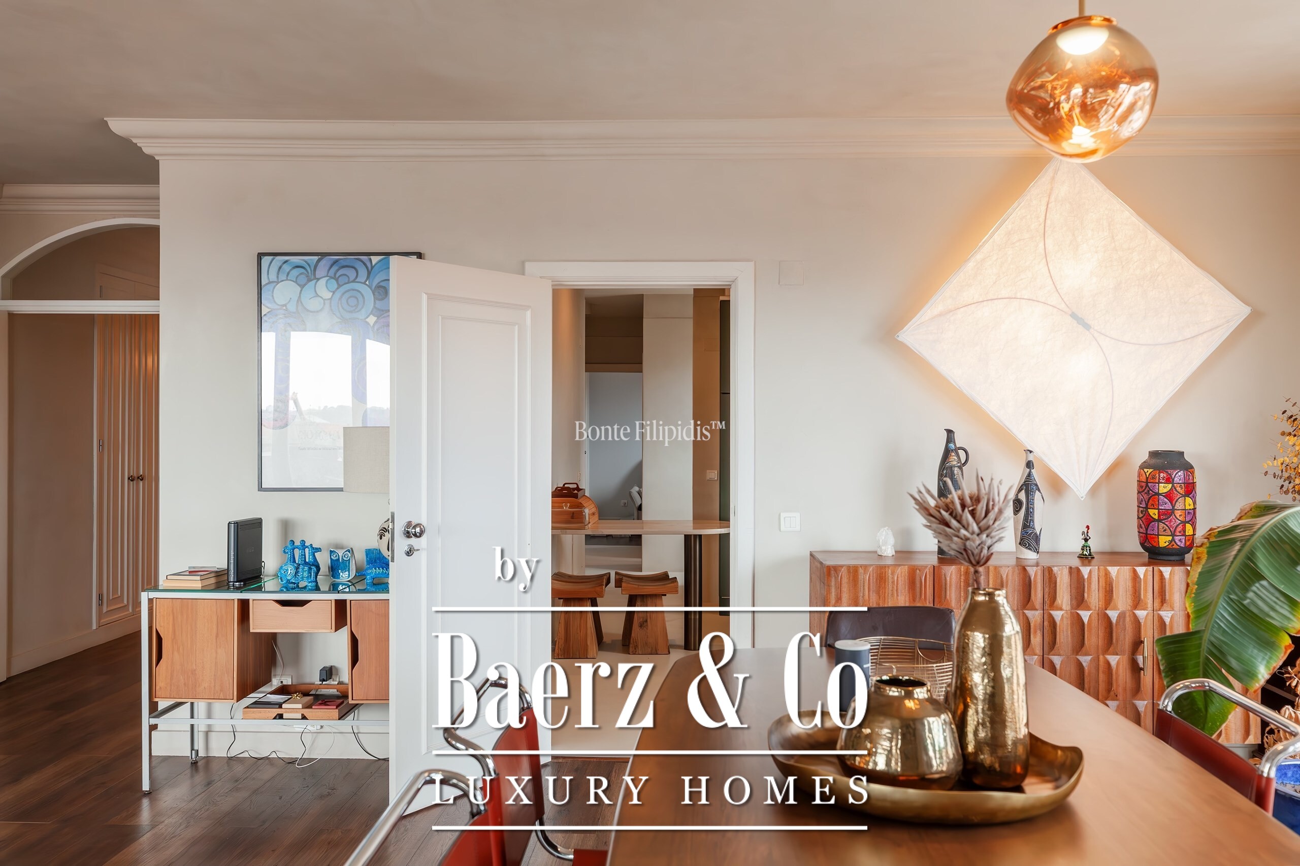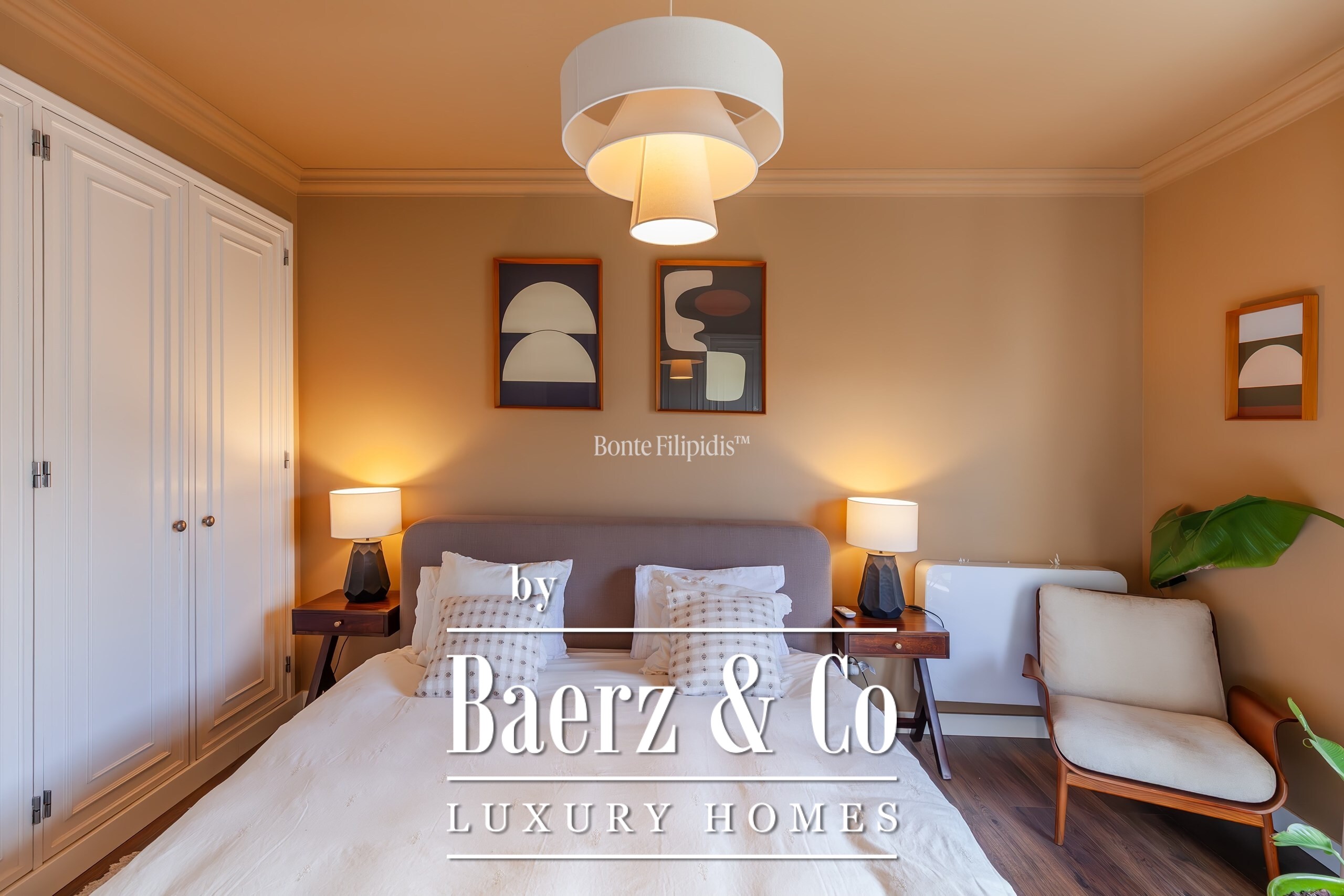 Grote raampartijen in de woon- en eetkamer bieden een kalm uitzicht op de rivier en geven toegang tot een ruim balkon, waarmee binnen en buiten moeiteloos in elkaar overlopen. Een haard vormt het middelpunt van de ruimte voor warmte en gezelligheid tijdens koelere avonden in Lissabon. De keuken is volledig uitgerust met eigentijdse apparatuur en een geïntegreerde wasruimte, waardoor functie en discretie samenkomen.