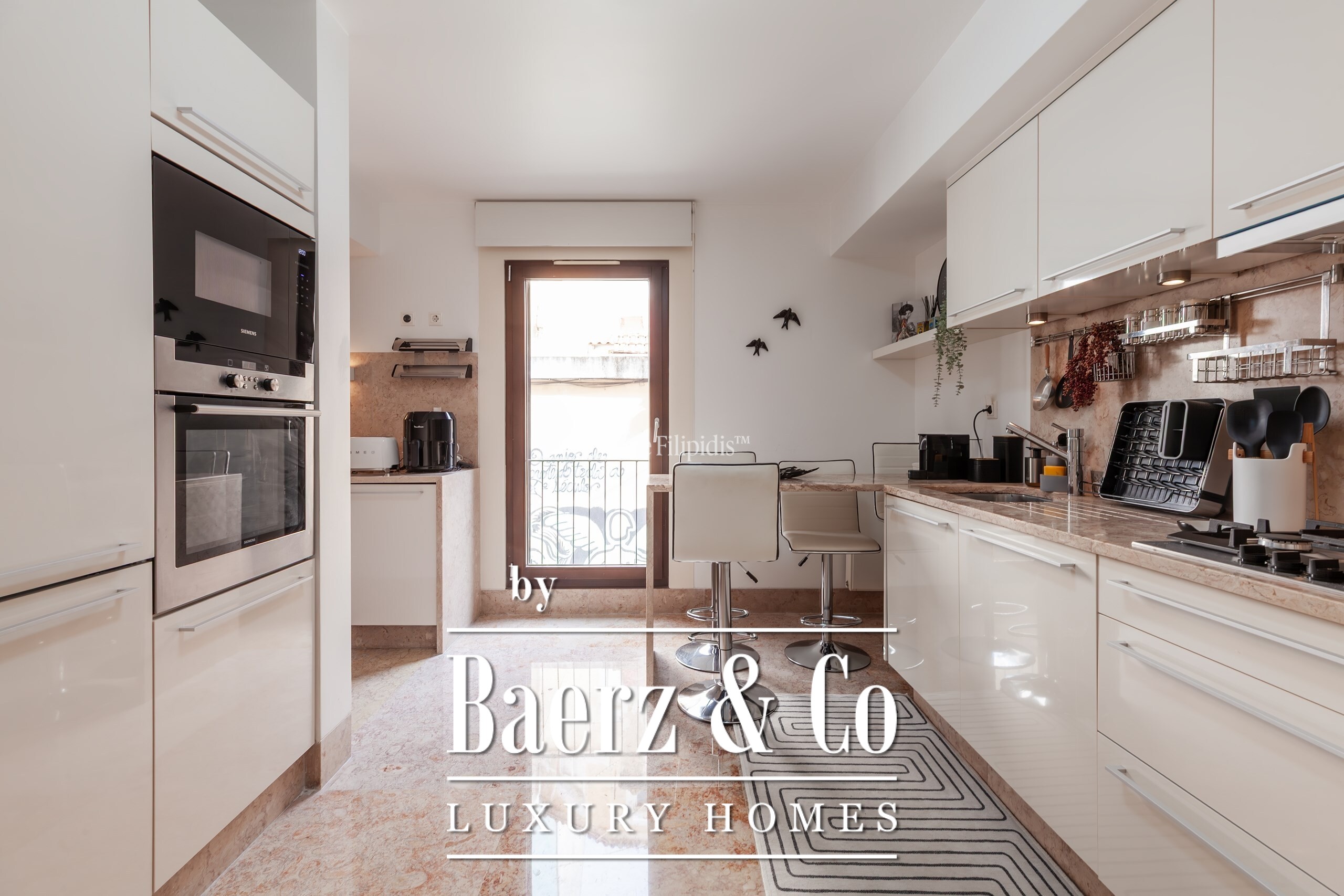 De keuken, badend in het zuidwestelijke licht, is uitgerust met SMEG- en Siemens-apparatuur, Lioz kalksteen en volop bergruimte, voor dagelijks gemak en gastvrijheid bij uitstek. Afzelia houten vloeren, eigentijdse badkamers en centrale verwarming onderstrepen de ingetogen klasse van deze woning. Het appartement wordt grotendeels gemeubileerd aangeboden en ondersteunt daarmee een zorgeloze verhuizing.