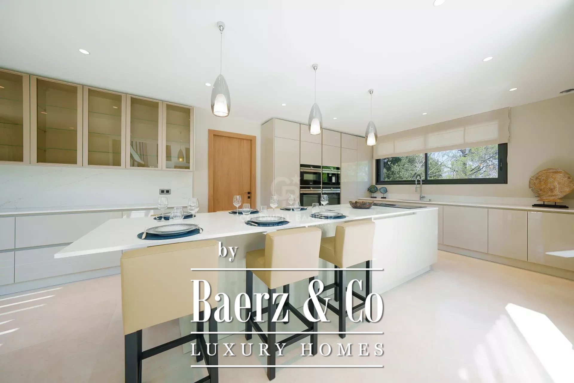 Elke van de vijf slaapkamers met eigen badkamer, inclusief een mastersuite met inloopkast, is georiënteerd op rust en discretie. De villa beschikt daarnaast over een eigen bioscoopzaal, een volledig uitgeruste fitnessruimte, een sauna, een speelkamer en een wijnkelder. Buiten bieden diverse terrassen, een verwarmd zwembad van 14 meter, een zomerse buitenkeuken en een verwarmde garage voor vier auto's een premium ervaring van ingetogen luxe.