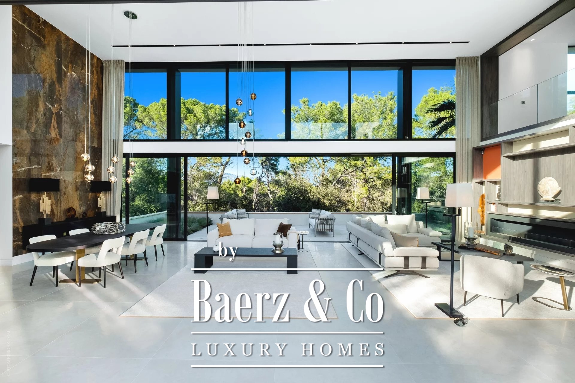 De eigentijdse villa in Mougins kenmerkt zich door een indrukwekkend samenspel van ruimte en licht, gelegen in een van de meest exclusieve beveiligde domeinen van de regio. Deze nieuw gebouwde residentie biedt 700 m² verfijnd wooncomfort op een gelijkvloers perceel van 2.700 m², gericht op rustgevende vergezichten over het bos en centraal gelegen rondom een strakke zwembadpartij.