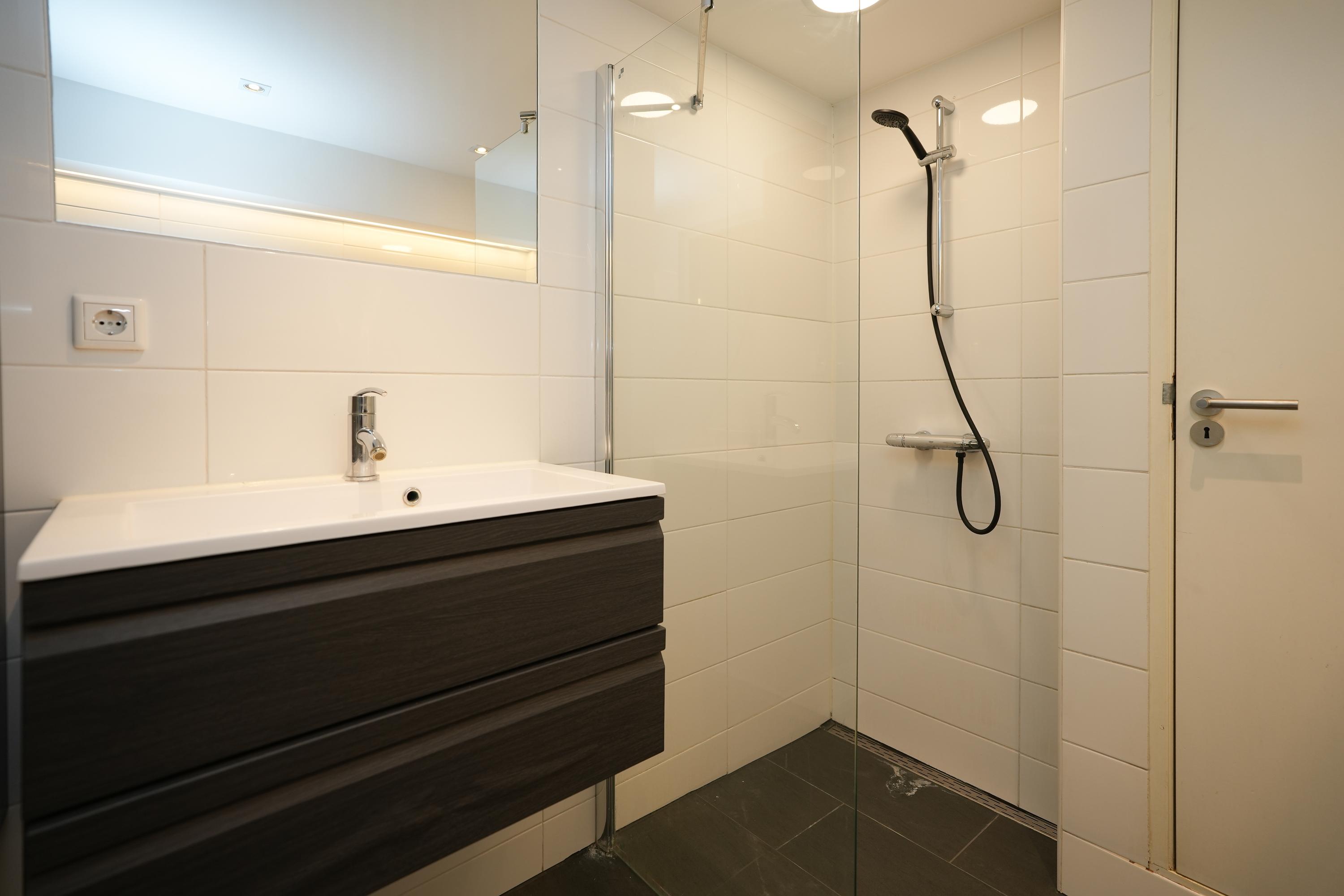 Gang met witgoedaansluiting, aan de achterzijde bevindt zich een open keuken met toegang tot de berging met mechanische ventilatie en stookruimte. Vanuit deze gang zijn aan de voorzijde van de woning een woonkamer met slaapgedeelte aanwezig, inclusief vaste kasten en de badkamer. De keuken heeft een U-opstelling en is voorzien van inbouwapparatuur. De badkamer is uitgerust met een wandtoilet, wastafelmeubel en inloopdouche.