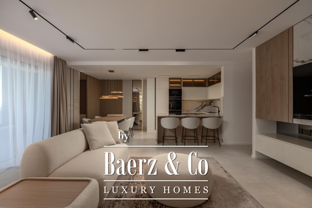 Het interieur combineert modern meubilair, kamerhoge ramen en zorgvuldig gekozen afwerkingen die zowel comfort als duurzaamheid bieden. Natuurlijk licht stroomt door elke kamer en zorgt voor een serene mediterrane sfeer. De open keuken, eet- en woonkamer vormen samen het hart van het appartement, met directe toegang tot het terras waar het uitzicht op zee en het zachte ritme van passerende schepen elkaar ontmoeten.