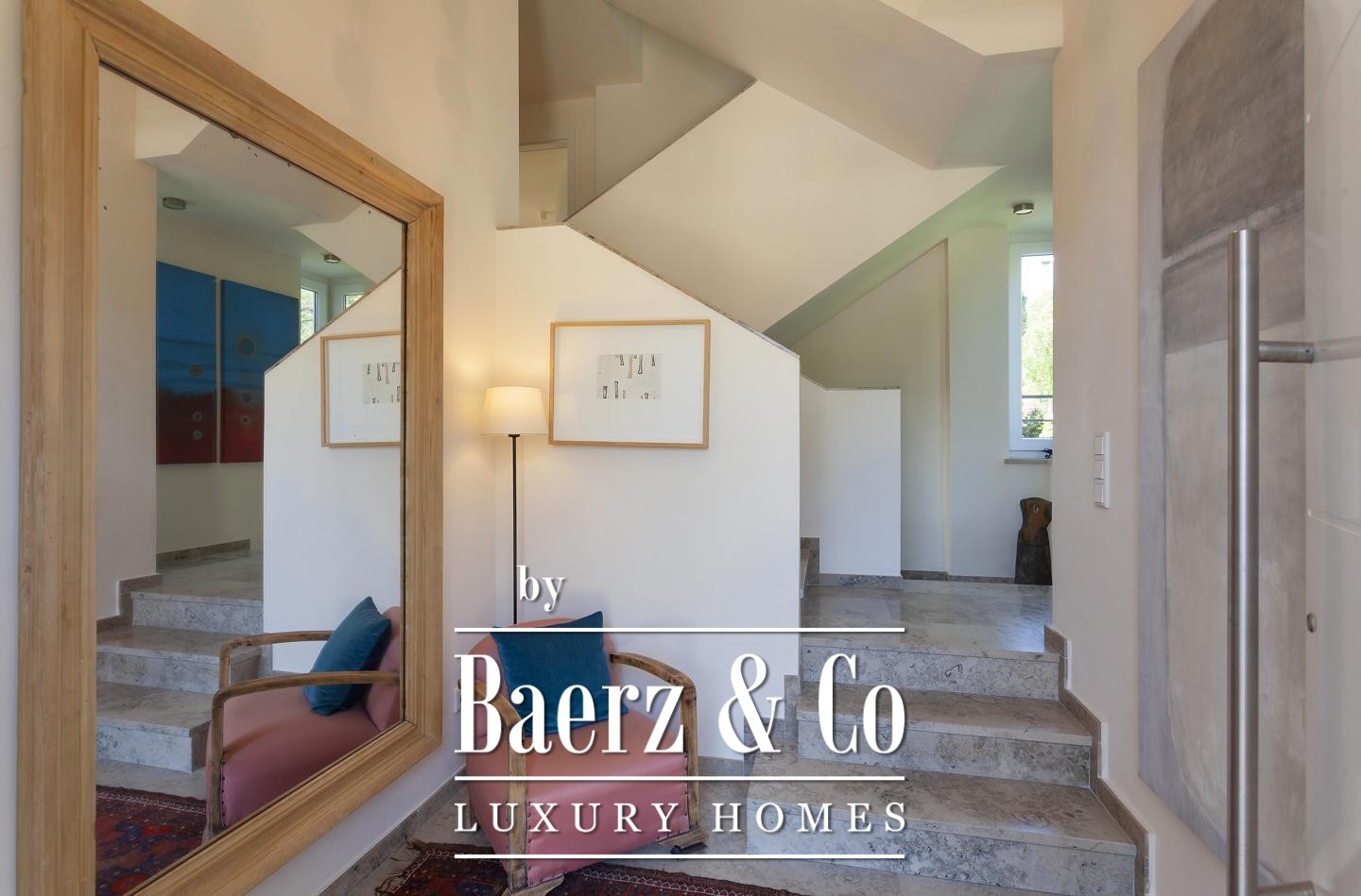 De hoofdvilla, vormgegeven door een eigenaar met expertise in architectuur, design en kunst, biedt een indeling die gericht is op harmonie en functionaliteit. Op de begane grond geeft de lichte woon-eetkamer toegang tot een terras en een mediterrane tuin; een volledig uitgeruste keuken en een slaapkamer en suite waarborgen privacy en comfort. Op de verdieping bieden drie slaapkamers met balkons volop licht en lucht, aangevuld door twee karaktervolle badkamers. De benedenverdieping beschikt over een studio met toegang tot het zwembad, een wasruimte en een geïntegreerde garage, wat het ruimtegevoel versterkt. Vloerverwarming, airconditioning en marmeren vloeren zorgen voor comfort in elk seizoen.