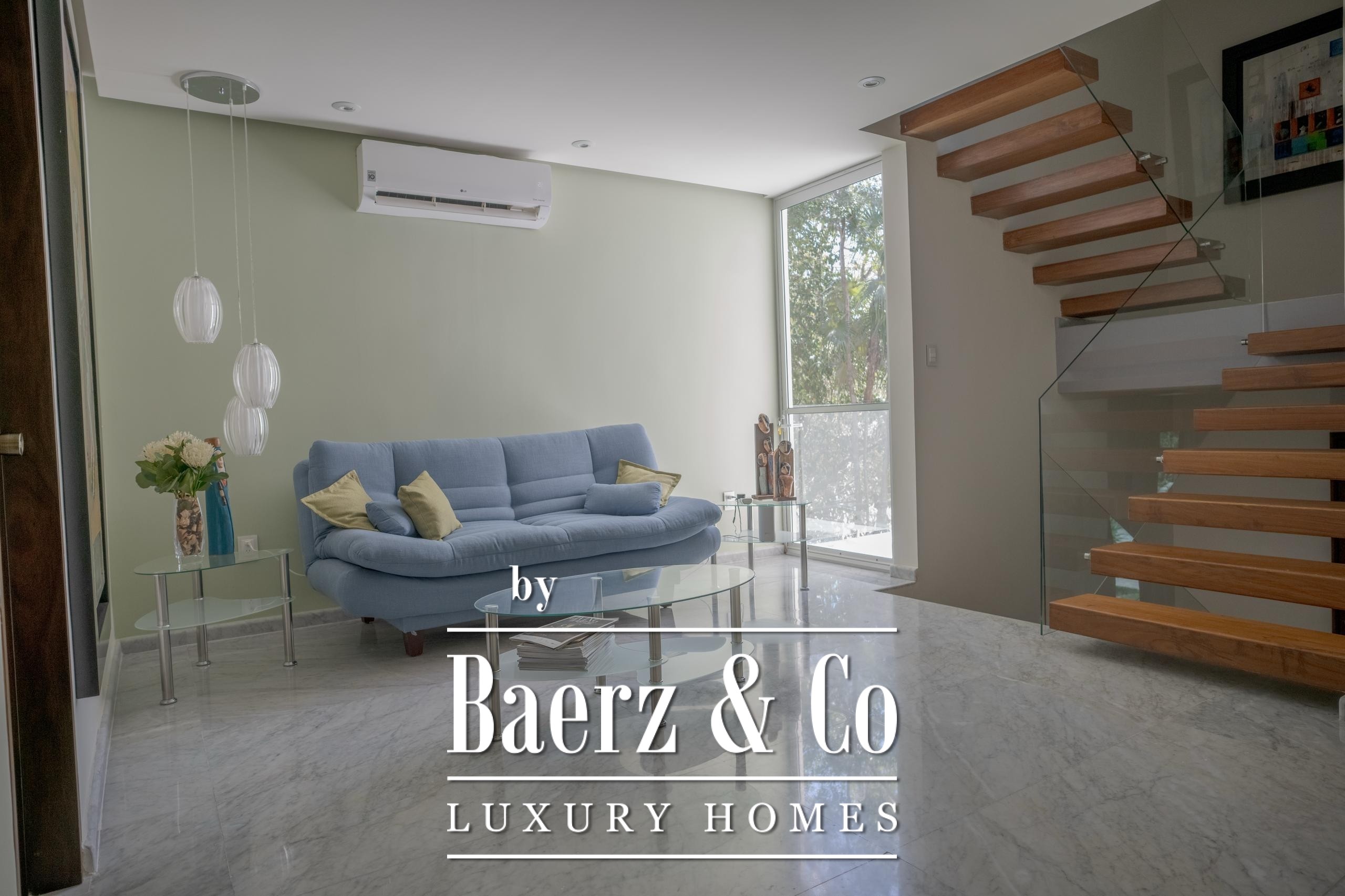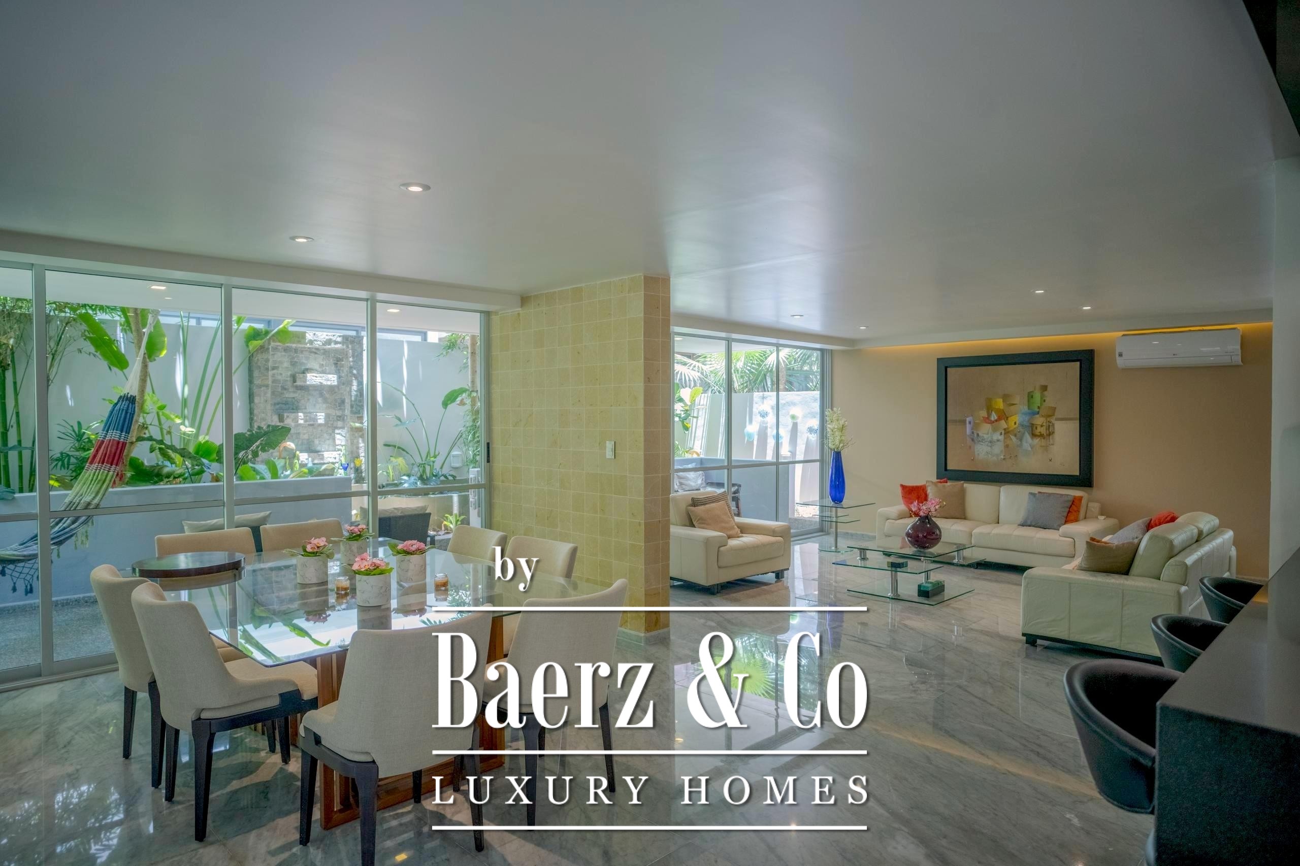 En planta baja, disfruta de una sala-comedor amplia con ventanales corredizos que se abren completamente hacia una terraza integrada con un hermoso jardín tropical, creando un ambiente ideal para el descanso o la convivencia. La cocina equipada cuenta con barra integrada al comedor, cubierta de granito negro y carpintería en madera, perfecta para quienes aman cocinar o recibir invitados.