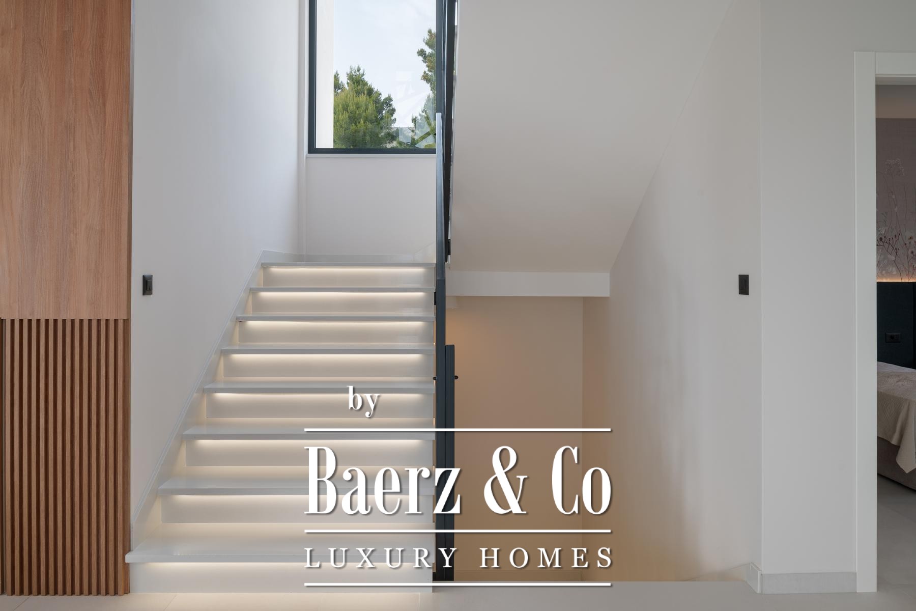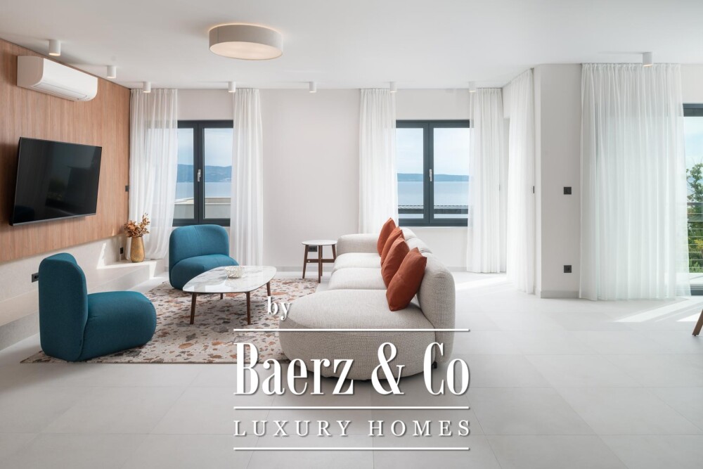 Vier slaapkamers, elk met een eigen en suite badkamer, zijn verspreid over de woning. De open keuken en living vloeien naadloos over in een zonovergoten terras, met een weids uitzicht over de Adriatische Zee. De begane grond omvat een royale lounge, eetgedeelte en een gastenverblijf met privébadkamer, terwijl de kelder plaats biedt aan een garage voor twee auto’s, een wijnkelder en technische ruimtes; alle niveaus zijn intern verbonden. Op de verdieping openen drie extra slaapkamers naar op het zuiden gelegen loggia’s met adembenemende vergezichten over zee en baai.
