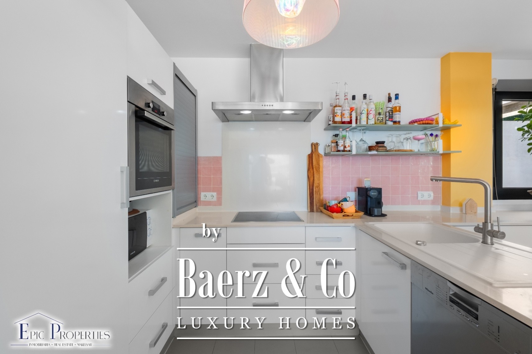 Er is een volledig uitgeruste open keuken die aansluit op de woonkamer. De grote ramen zorgen voor veel natuurlijk licht in het hele huis, wat een gezellige sfeer creëert.