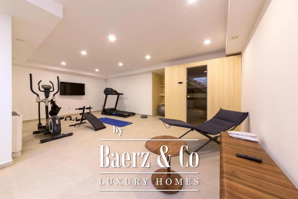 Op de eerste verdieping beschikken drie slaapkamers elk over een eigen badkamer en royale inbouwkasten, wat rust en comfort garandeert. Het dakterras biedt adembenemend zeezicht en is uitgerust met een jacuzzi, waardoor bijzondere momenten van ontspanning boven de kustlijn ontstaan. Wellnessvoorzieningen, waaronder een fitnessruimte en sauna, versterken het gevoel van ingetogen luxe in de villa.