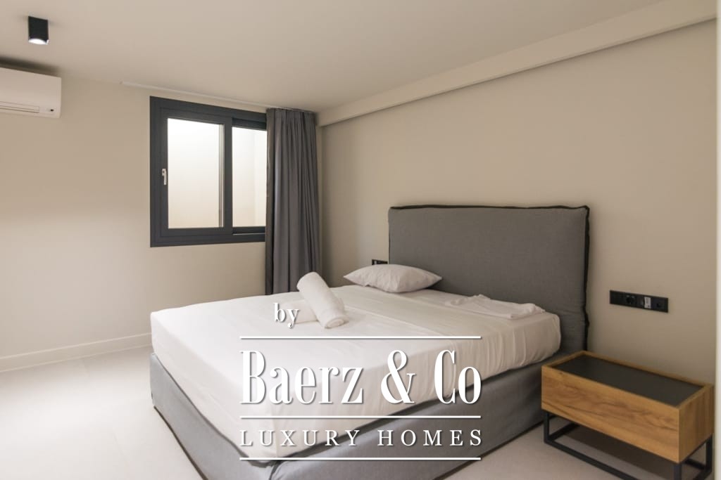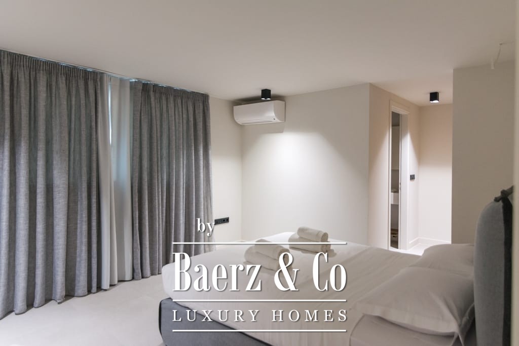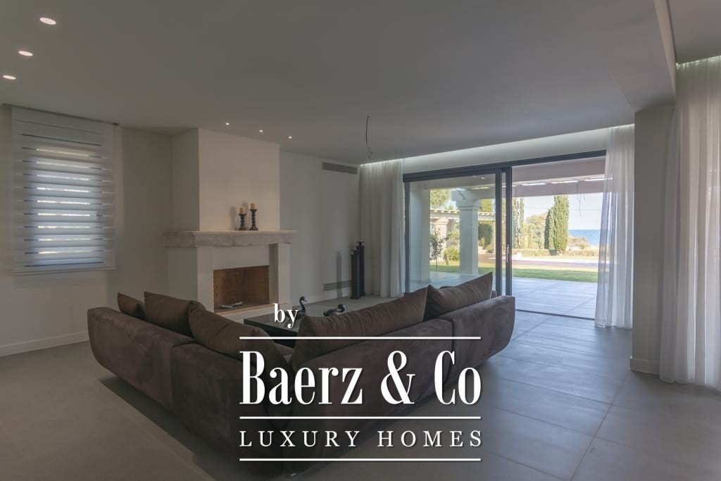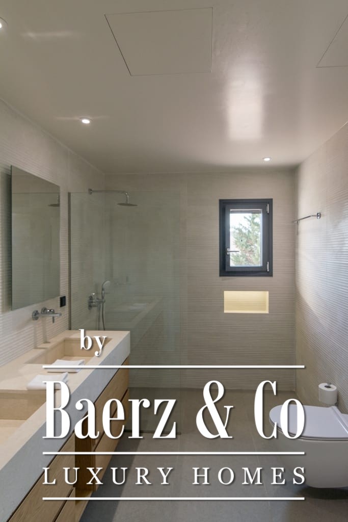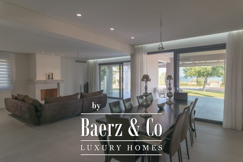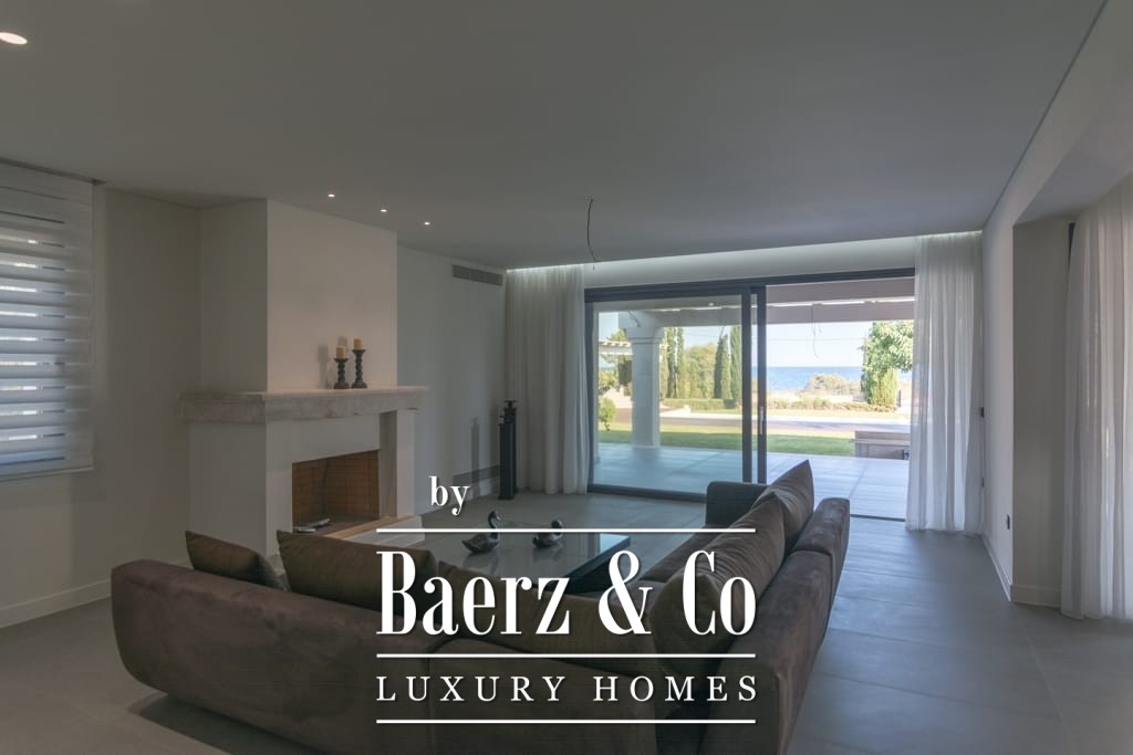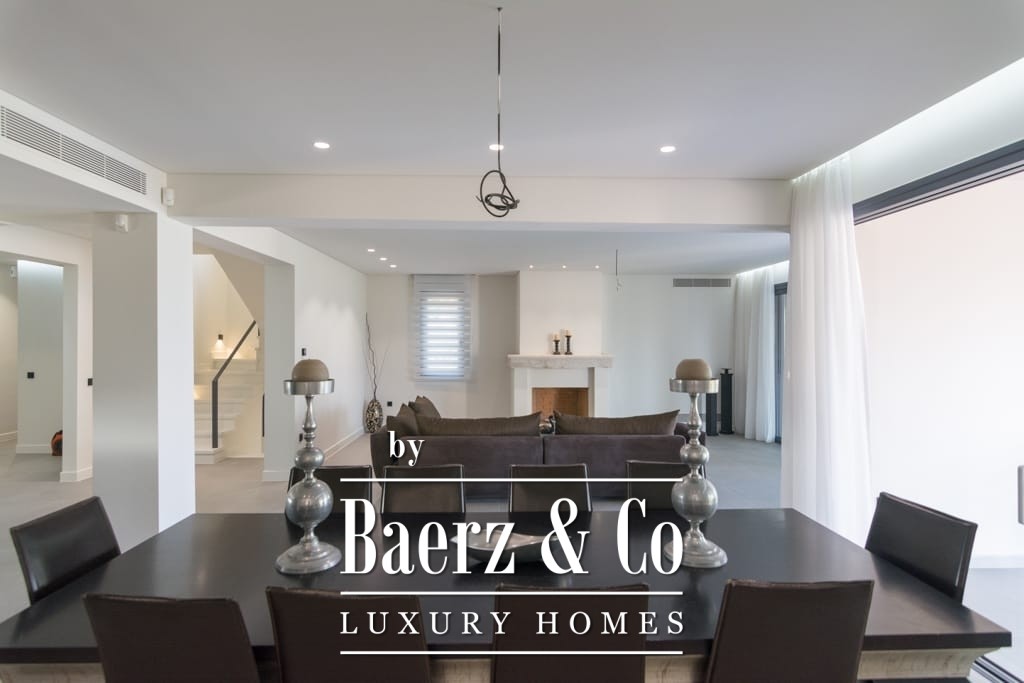 Het interieur ademt ingetogen luxe en combineert tijdloos mediterraan karakter met hedendaags comfort. Opvallende houten dakdetails en grootschalige antieke marmeren vloeren creëren een tastbare elegantie, terwijl royale raampartijen het daglicht overvloedig laten binnenvallen in de ruime ontvangstruimtes. De woon- en eetgedeeltes lopen naadloos over in brede terrassen en royale balkons, die panoramisch uitzicht op zee bieden richting Spetses, Hydra en de verre horizon.