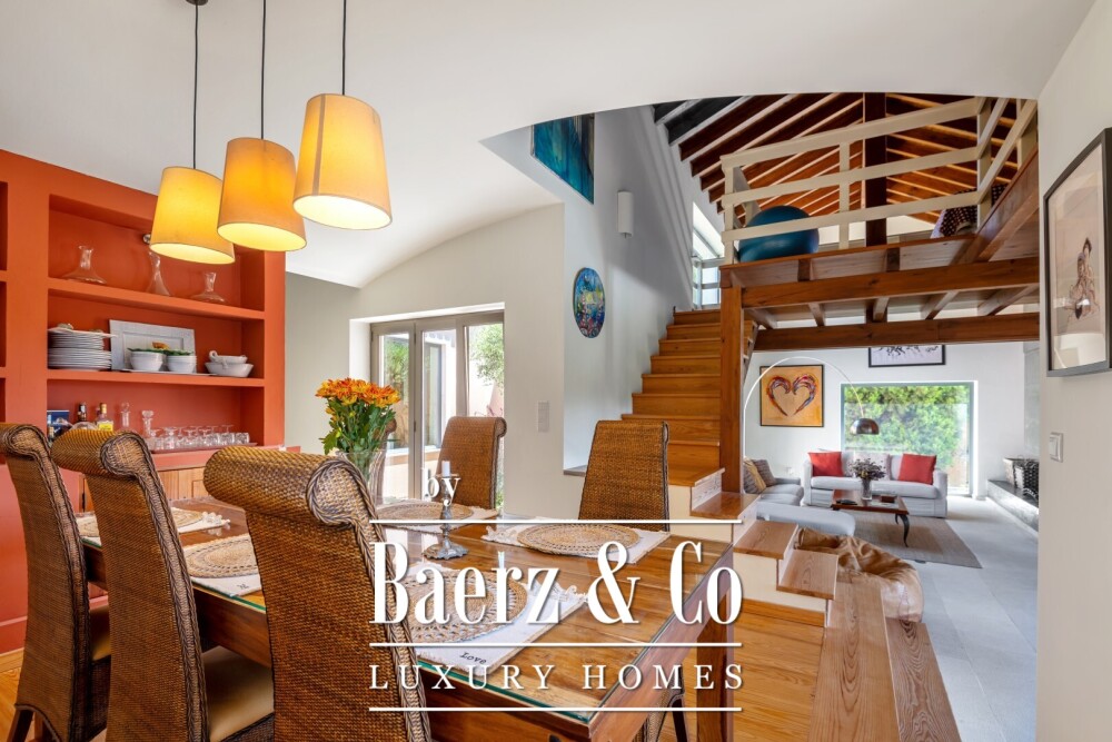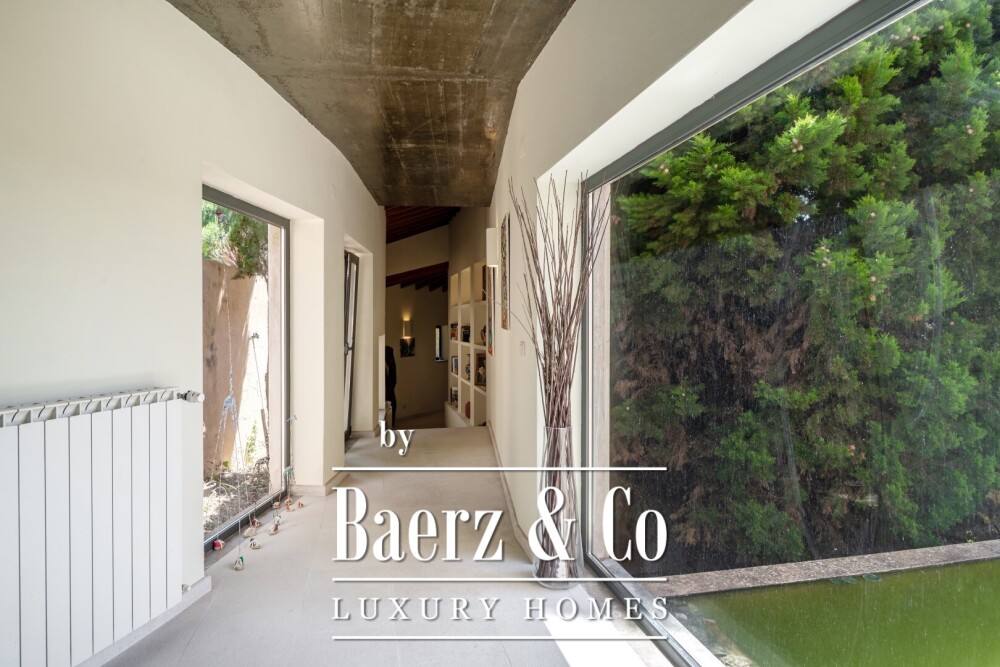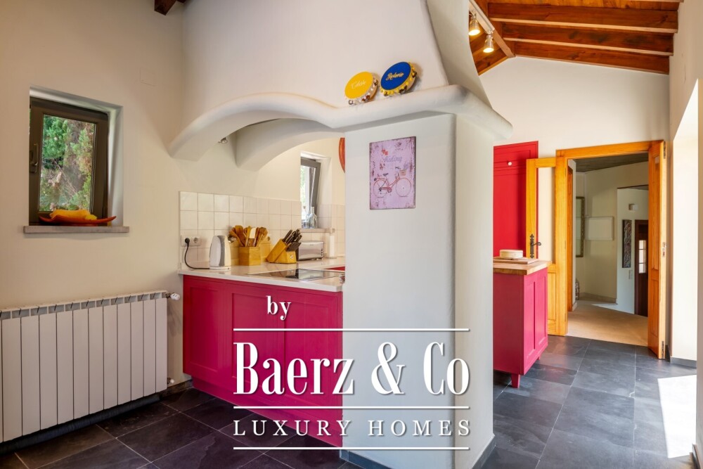 De keuken vormt een naadloos geheel met de woonkamer en komt uit op het terras en een zorgvuldig aangelegde tuin met zwembad, met panoramisch uitzicht over het omliggende landschap. Centrale verwarming door het hele huis en een elegante houtkachel zorgen voor comfort in elk seizoen, terwijl kunststof ramen met dubbel glas, kiepfunctie en rolluiken getuigen van een stille aandacht voor detail.