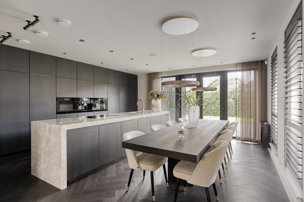 De moderne leefkeuken vormt het hart van het huis en is uitgerust met hoogwaardige apparatuur. Het keukenblad is uitgevoerd in Pure Kwartsiet, een stijlvol en duurzaam natuursteen. U kookt op een Bora inductiekookplaat met geïntegreerde afzuiging, terwijl de Miele-ovens en inbouw koffiemachine en de grote koelkast, vriezer en vaatwasser van Siemens zorgen voor optimaal kookcomfort. De keuken biedt voldoende ruimte voor een royale eettafel en heeft openslaande deuren naar het terras, waardoor u direct buiten kunt dineren of ontspannen.