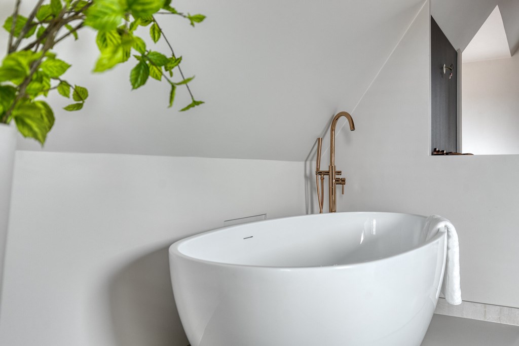 Via een vaste trap bereikt u de tweede verdieping, die is ingericht als oudervertrek. Hier bevindt zich een ruime slaapkamer en een royale, open wellnessruimte met vrijstaand bad, inloopdouche, toilet en dubbele wastafel. Er is tevens een voorbereiding getroffen voor de installatie van een sauna, zodat u hier een echte ontspanningsruimte kunt creëren. Op de overloop is een fraaie kastenwand met verlichting ingebouwd.