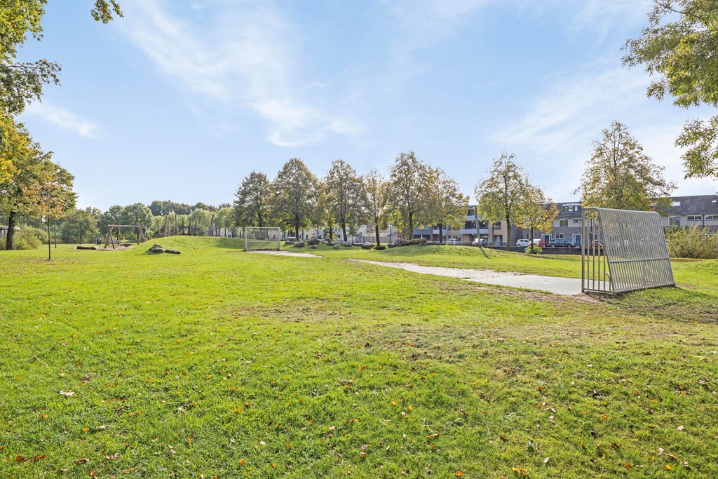 Rondom de woning ligt een nette, groene tuin, grotendeels voorzien van gazon en deels bestraat. Dankzij de ideale ligging geniet u de hele dag van de zon – van de vroege ochtend tot de avondzon op het terras. De tuin biedt volop privacy en ruimte voor een lounge of eetgedeelte. Aan de voorzijde bevindt zich een oprit met plaats voor twee auto’s en een laadpaal, terwijl fraaie buitenverlichting zorgt voor een sfeervol geheel, ook in de avonduren.