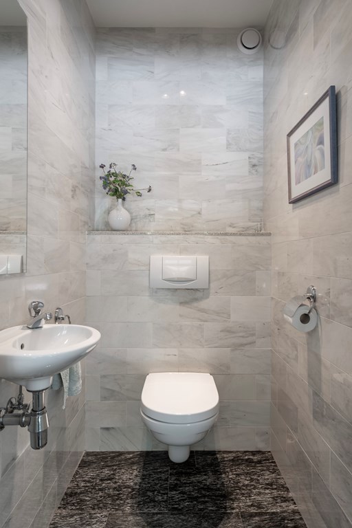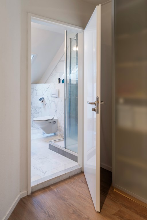 Op de begane grond bevindt zich in de hal een separate toiletruimte met fonteintje. Op de eerste verdieping zijn twee badkamers aanwezig. De badkamer die grenst aan de masterbedroom is geheel vernieuwd in 2020 en is luxe uitgevoerd en voorzien van een inloopdouche, een Sunshower, een designradiator, een dubbele wastafel en een toilet. De betegelde vloer is uitgerust met vloerverwarming voor extra comfort. De tweede badkamer, afgewerkt met witte marmeren tegels, beschikt over een douche, een wastafel, toilet en designradiator.