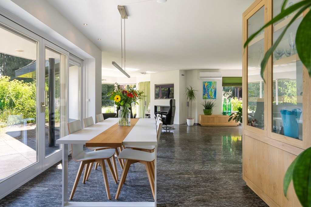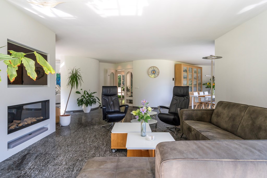 U komt binnen in een ruime, lichte hal die toegang geeft tot de woonkamer, een werkkamer, toiletruimte, meterkast (21 groepen + glasvezel) en de trapopgang. De werkkamer is ideaal en perfect bereikbaar om bijvoorbeeld klanten te ontvangen. De royale woonkamer heeft een bijzondere indeling, waardoor u gemakkelijk verschillende zithoeken kunt creëren. De grote ramen rondom bieden een prachtig uitzicht op de tuin en zorgen voor veel licht. Een sfeervolle gashaard voegt extra warmte toe. Via een dubbele schuifpui loopt u zo de zonnige achtertuin in. Aan de zonnige kant zorgen screens voor extra comfort. De ruime keuken met een eigen deur naar de tuin is ideaal voor het bereiden van maaltijden. Aangrenzend aan de keuken vindt u een bijkeuken met een aanrecht voorzien van spoelbak en aansluitingen voor de wasmachine en droger. De gehele benedenverdieping is voorzien van een natuurstenen vloer met vloerverwarming. In de woonkamer bevindt zich ook een airco.
