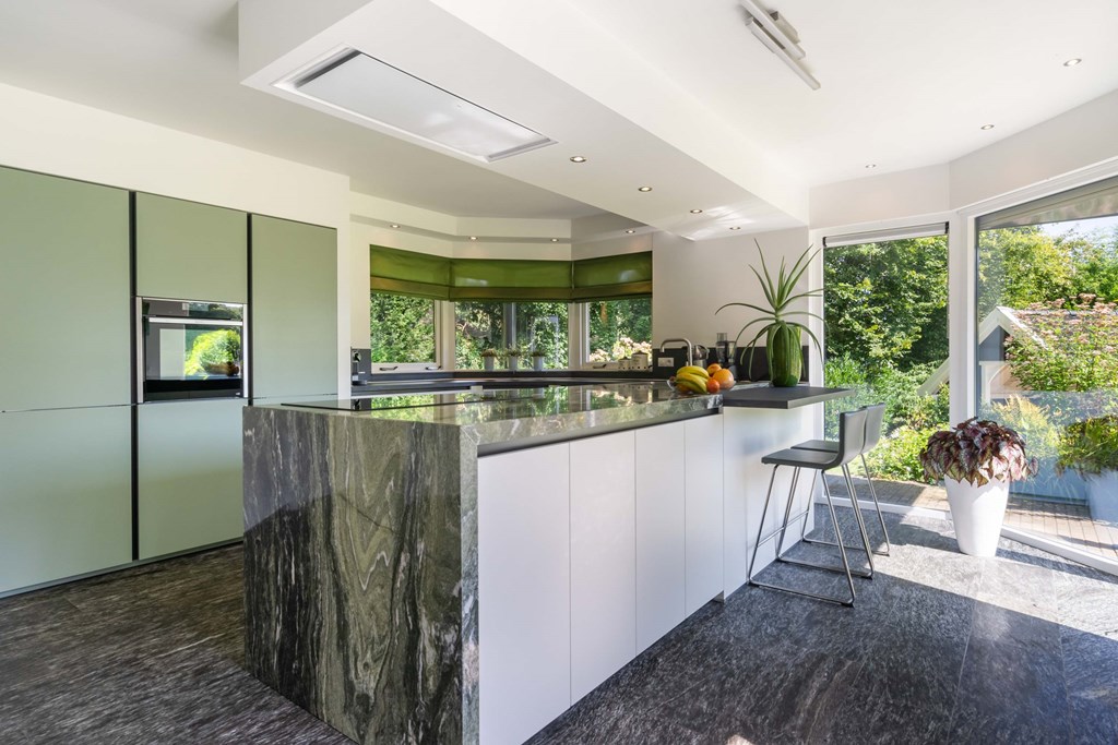 De royale, U-vormige keuken is nog maar een paar jaar oud (2020) en voorzien van hoogwaardige apparatuur. Dankzij de ruime opzet en praktische indeling is deze keuken van alle gemakken voorzien. U beschikt over een groot natuurstenen werkblad, een vijfpits kookplaat, bakoven, plafondunit afzuigkap, vaatwasser, grote koelkast, een grote vriezer en veel opberg-/kastruimte. Deze moderne keuken biedt volop ruimte om uitgebreid te kokerellen. Bovendien heeft u vanuit de keuken een prachtig uitzicht op de zij- achtertuin en directe toegang tot het terras.