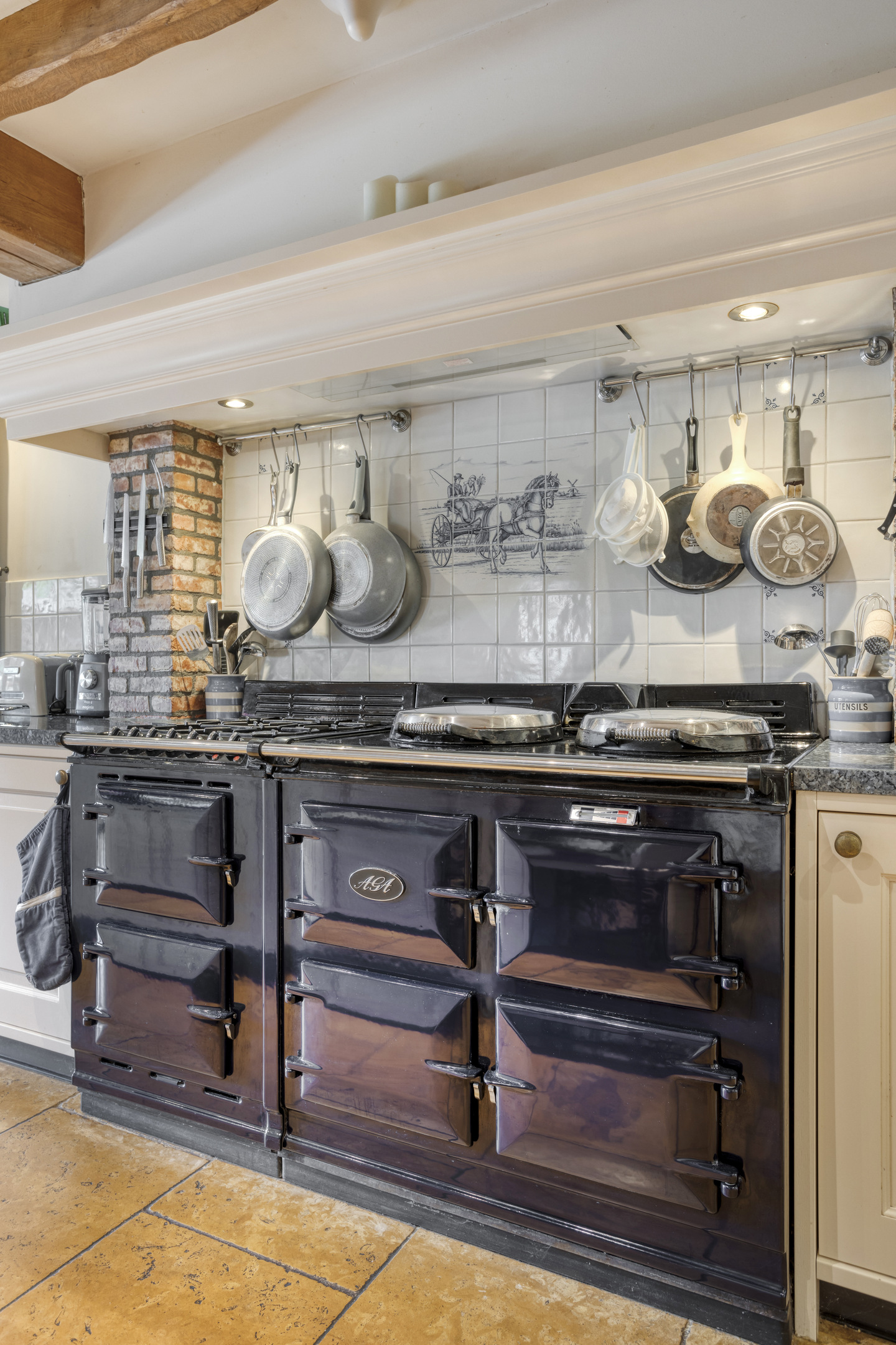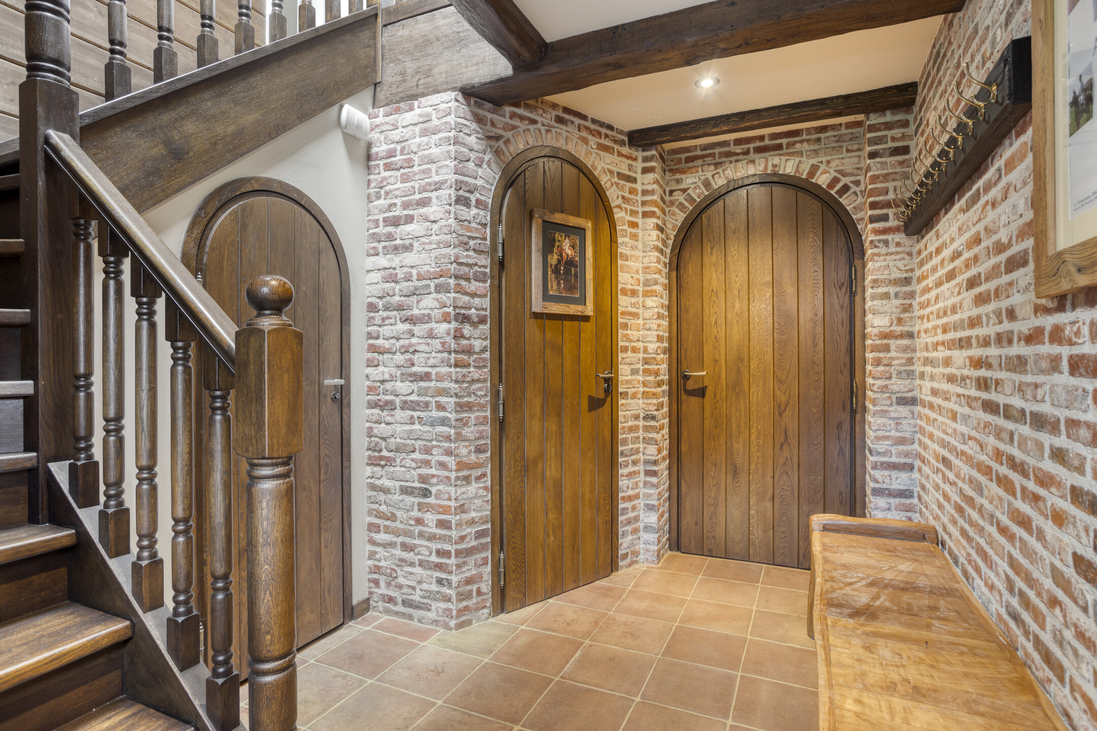 Royale entree met marmeren vloer, toiletruimte, meterkast en fraaie hardhouten trapopgang naar de eerste verdieping. De hal biedt toegang tot de eetkamer en tot een gang die leidt naar de woonkeuken, slaapkamers en badkamer. Toiletruimte met marmeren vloer- en wandbetegeling, vrij hangend closet en fonteintje. Royale, sfeervolle eetkamer met marmeren vloer, balkenplafond en volop ruimte voor een grote eettafel. Vanuit de eetkamer is er toegang tot de woonkamer. Ruime, stijlvolle woonkamer met houten vloer, grote openhaardpartij (hout), een zeer hoog plafond met een unieke balkenconstructie en een prachtige vide die toegang biedt tot een van de slaapkamers. De grote en sfeervolle woonkeuken is voorzien van een marmeren vloer, balkenplafond met inbouwspots en twee dubbele openslaande deuren naar het overdekte terras. De woonkeuken beschikt aan de tuinzijde over een ruime en gezellige zithoek met open haardpartij (gas). De keuken bestaat uit een wandopstelling met een aanrechtblad met kookgedeelte, een grote kastenwand en een spoeleiland met bargedeelte. De keukeninrichting bestaat uit een marmeren aanrechtblad met diverse kasten en lades, een groot AGA fornuis met diverse soorten ovens, een gasfornuis, twee kookplaten en een afzuigkap. De ‘kastenwand’ bestaat uit een grote koelkast, vriezer met ijsblokjesfunctie, koffiemachine, combi-oven/magnetron, stoomoven en diverse kasten. Het spoeleiland, voorzien van een marmeren blad met dubbele spoelbak en een bar met maar liefst negen zitplaatsen, vormt de centrale plek in de woonkeuken. Het eiland beschikt verder over een vaatwasmachine en diverse kasten.