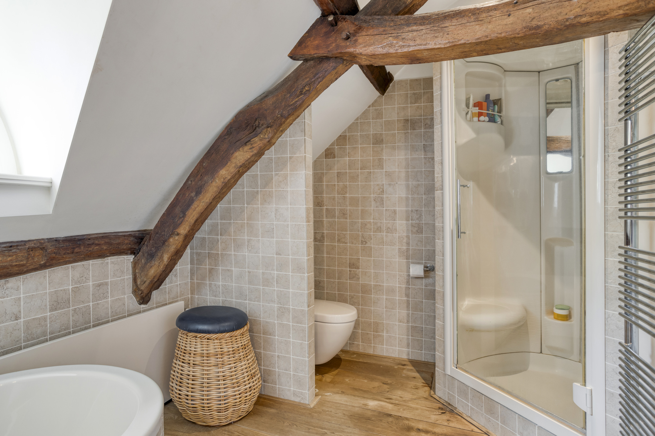 Ruime badkamer 1 met natuurstenen vloerbetegeling en wandbetegeling, balkenplafond met inbouwspots, douchecabine en een dubbele wastafel in meubel.