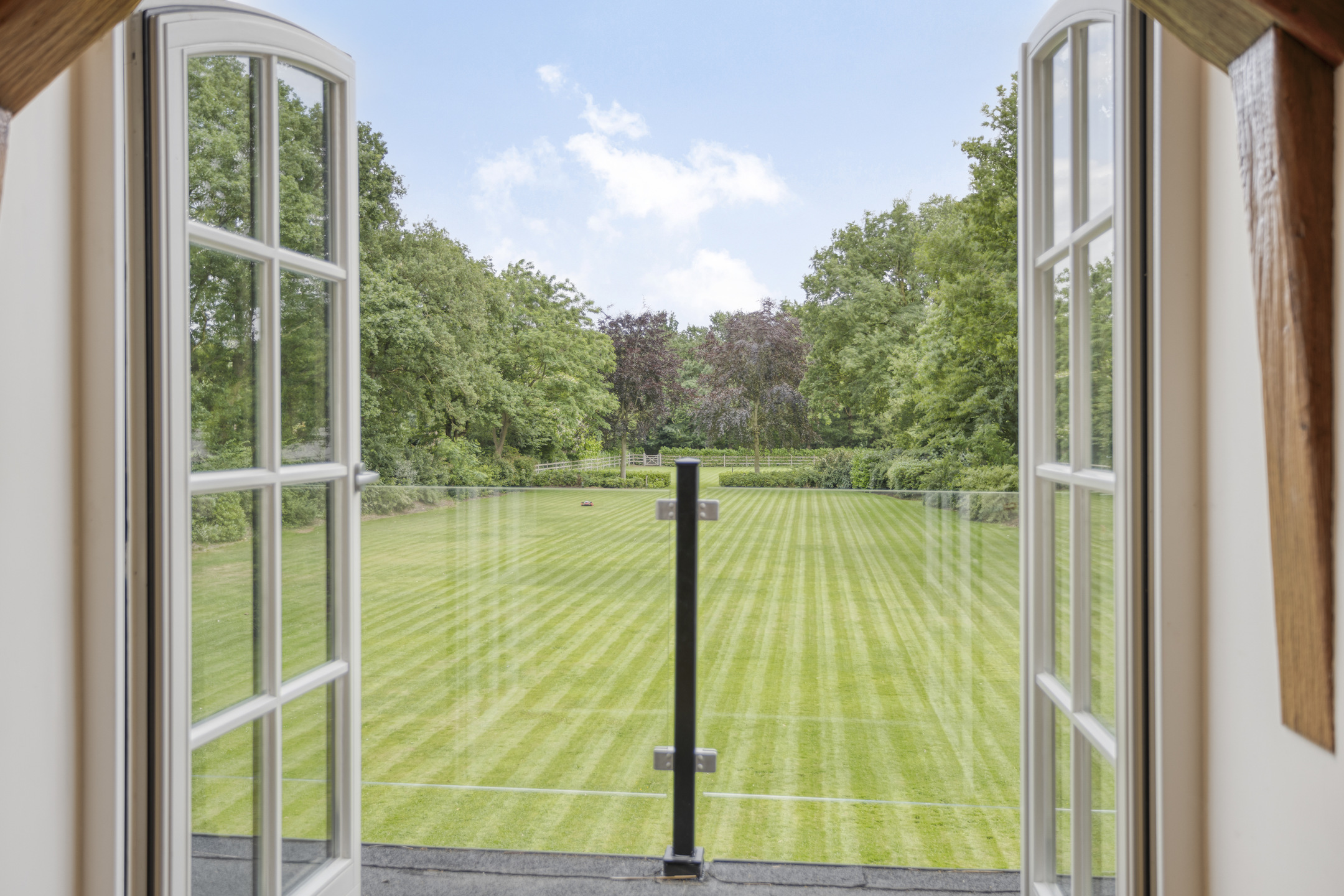 De magnifieke achtertuin is voorzien van een zeer groot gazon, volwassen bomen en borders met diverse beplanting. Vanuit het gazon leidt een natuurlijke doorgang naar een tweede perfect onderhouden gazon. Aan de achterzijde grenst de tuin aan het groen zodat rust en privacy gegarandeerd zijn. De tuin is verder voorzien van een beregeningsinstallatie en diverse elektrapunten.