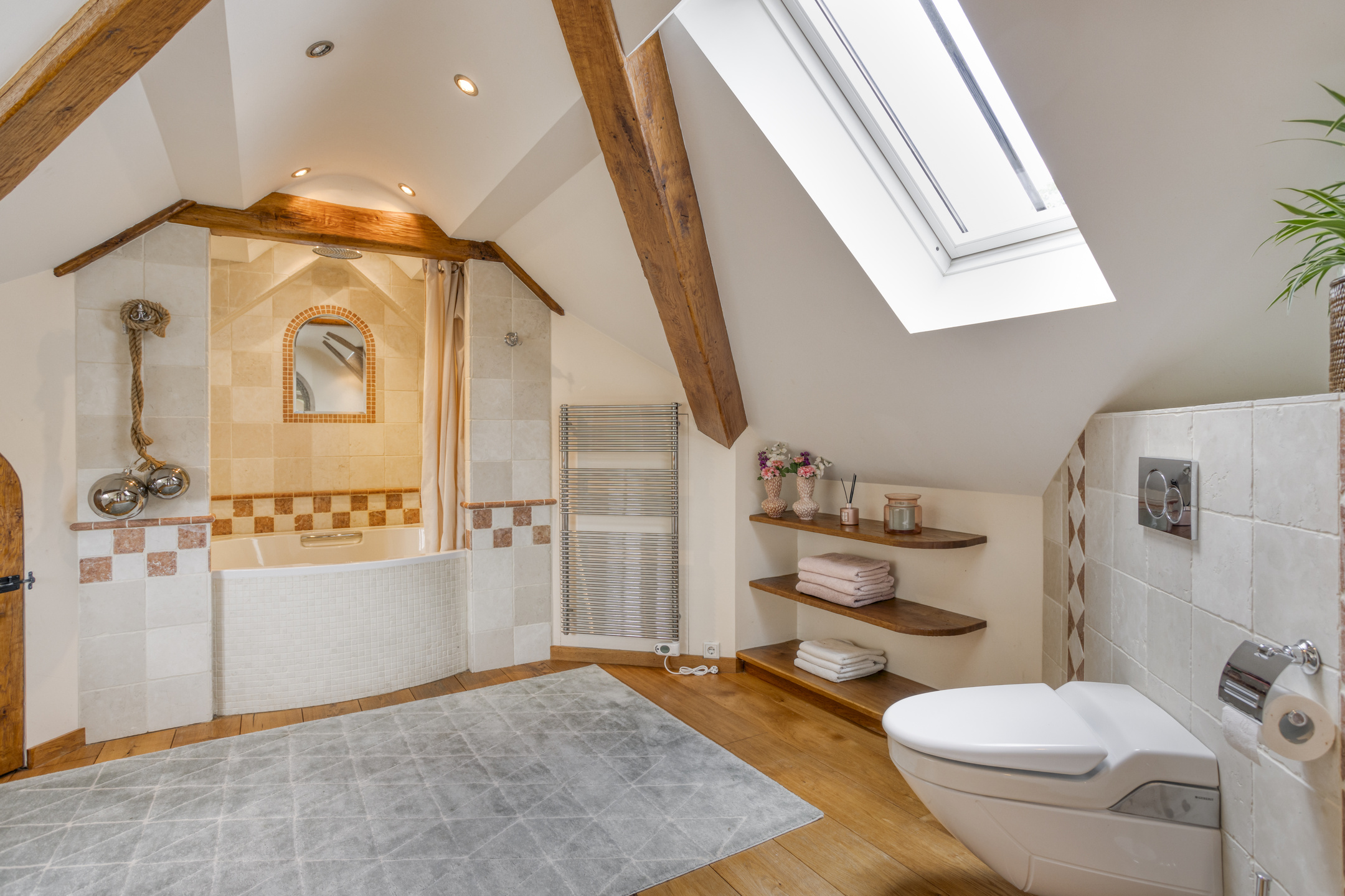 De zeer ruime slaapkamer 4 is voorzien van een houten vloer, een plafond met een zeer bijzondere balkenconstructie, twee dakkapellen en een grote walk in closet. Een grote karakteristieke raampartij biedt een prachtig uitzicht over de parkachtige tuin. Badkamer 2 is voorzien van marmeren vloer- en wandbetegeling, een dakkapel, sierradiator, wandcloset, ligbad, douche en dubbele wastafel in meubel.
