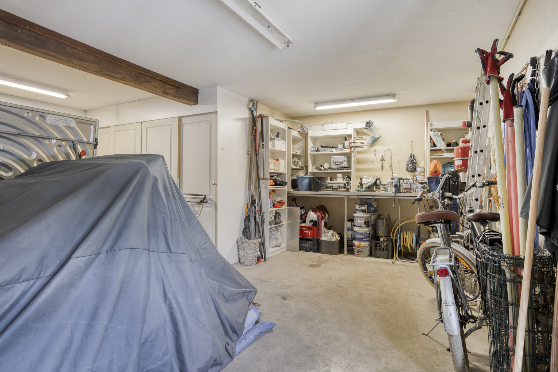 De voormalige garage is volledig verbouwd en voorzien van een rieten dak. Een deel van dit 'gepotdekselde' bijgebouw is in gebruik als berging. Deze is toegankelijk via een deur bij de carport. Op de begane grond bevindt zich verder een grote ontspanningsruimte. De hal is voorzien van natuurstenen vloerbetegeling, een grote kast met daarin de meterkast, de toiletruimte en een fraaie hardhouten trapopgang naar de eerste verdieping. Vanuit de hal is ook de ontspanningsruimte bereikbaar. Toiletruimte met natuurstenen vloerbetegeling, vrij hangend closet, urinoir en een designmeubel met fonteintje. Grote, sfeervolle ontspanningsruimte met natuurstenen vloerbetegeling, balkenplafond met inbouwspots en een glazen doorkijkje naar de erboven gelegen fitnessruimte/gym. Deze ontspanningsruimte is voorzien van een grote stijlvolle bar met ‘drankkast’, gezellige zithoek en een ingebouwd geluidssysteem. Op dit moment is deze ruimte deels in gebruik als ‘biljartkamer’. De toegangsdeur van de berging bevindt zich bij de carport. De berging biedt volop ruimte en is voorzien van een ingebouwde kastenwand. In de berging bevinden zich ook de installatie van de vloerverwarming en de aansluitingen voor de CV- en beregeningsinstallatie.