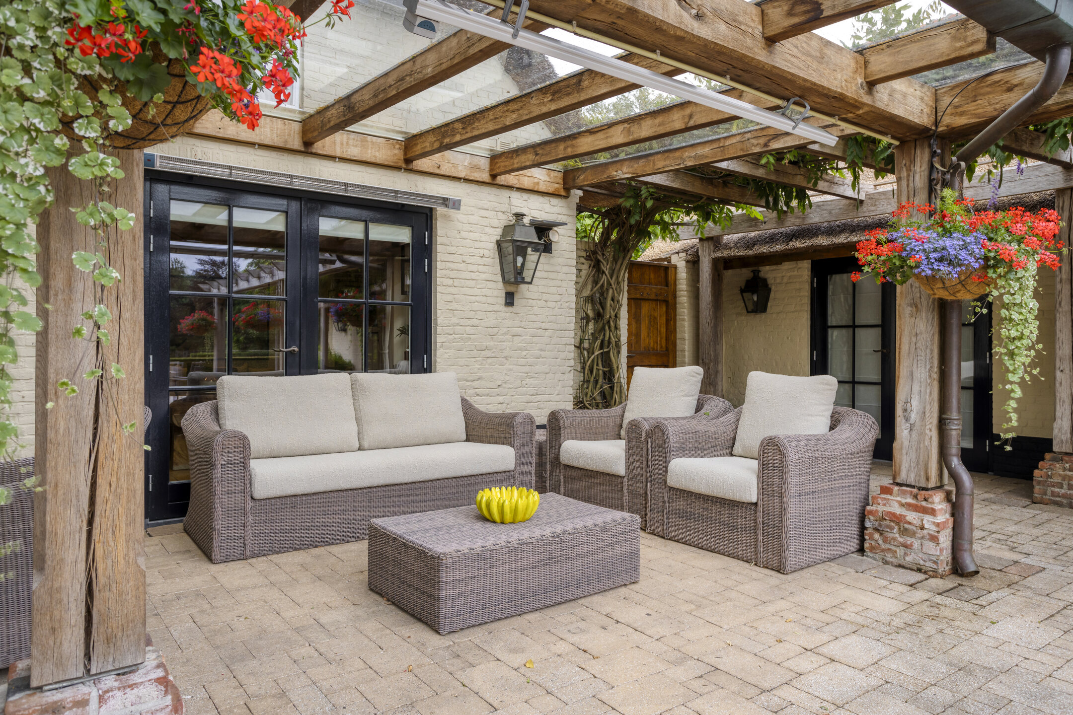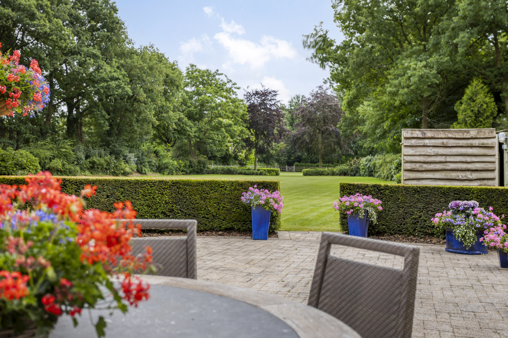 De fraai aangelegde zeer royale tuin ligt op het oosten en beschikt over meerdere grote zonneterrassen. De terrassen zijn dusdanig gesitueerd dat zowel de woonboerderij als het gastenverblijf kunnen rekenen op voldoende privacy en een prachtig uitzicht bieden op de parkachtige achtertuin. Het terras grenzend aan de woonboerderij is voorzien van een grote glazen overkapping en een fraaie pergola.