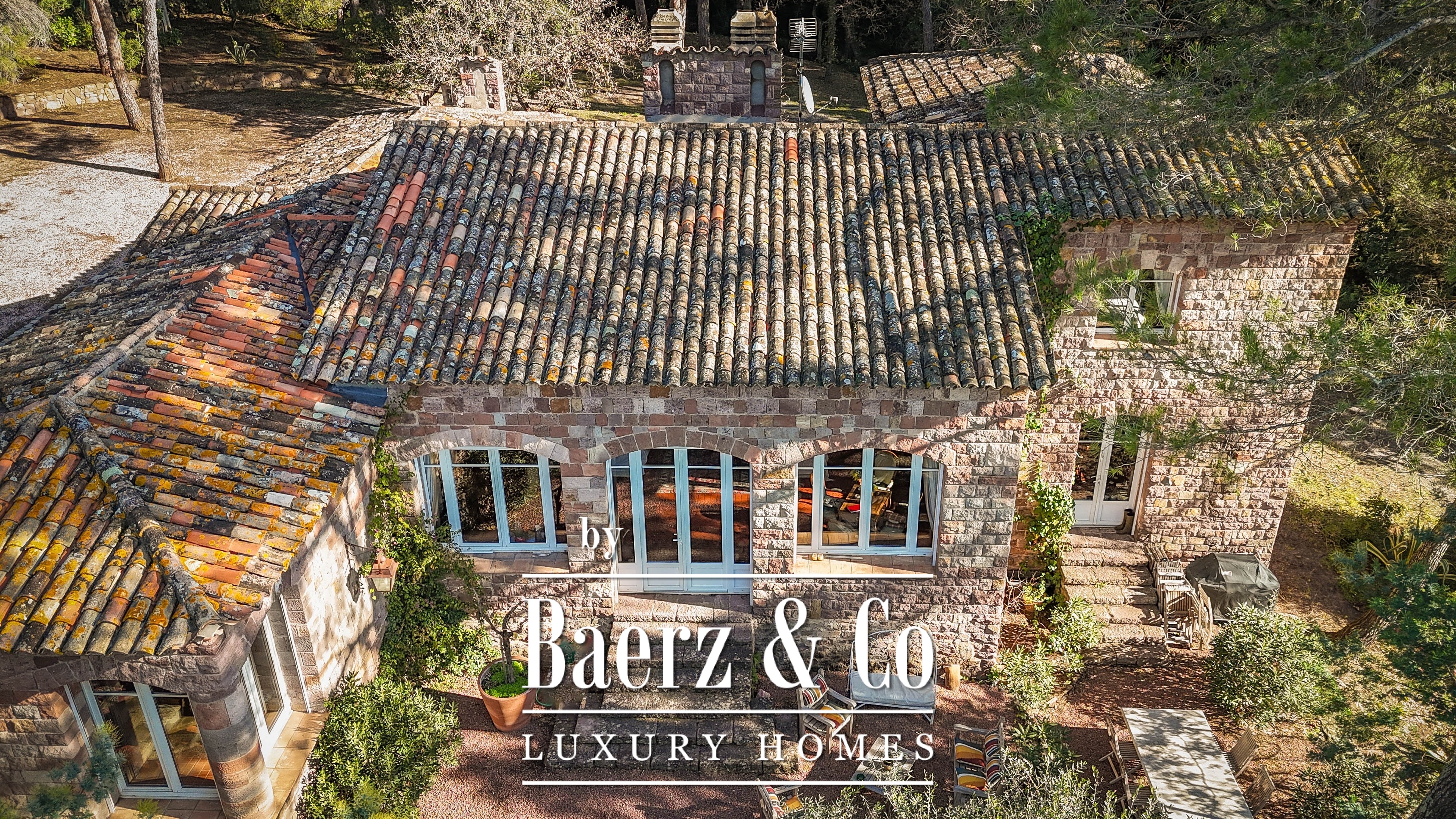 Het huis werd in de jaren 40 ontworpen door de vliegenier Pierre Wertheim voor zijn echtgenote, een operazangeres bij La Scala. De residentie ademt de gulden snede, zowel qua structuur als sfeer. Rood porfier uit de Estérel, bewerkt door Italiaanse steenhouwers, verankert de villa stevig in de Provençaalse context. De royale dubbele woonkamer met hoge plafonds en open haard opent naar het aangelegde park, waardoor licht en sereniteit het dagelijks leven verrijken.