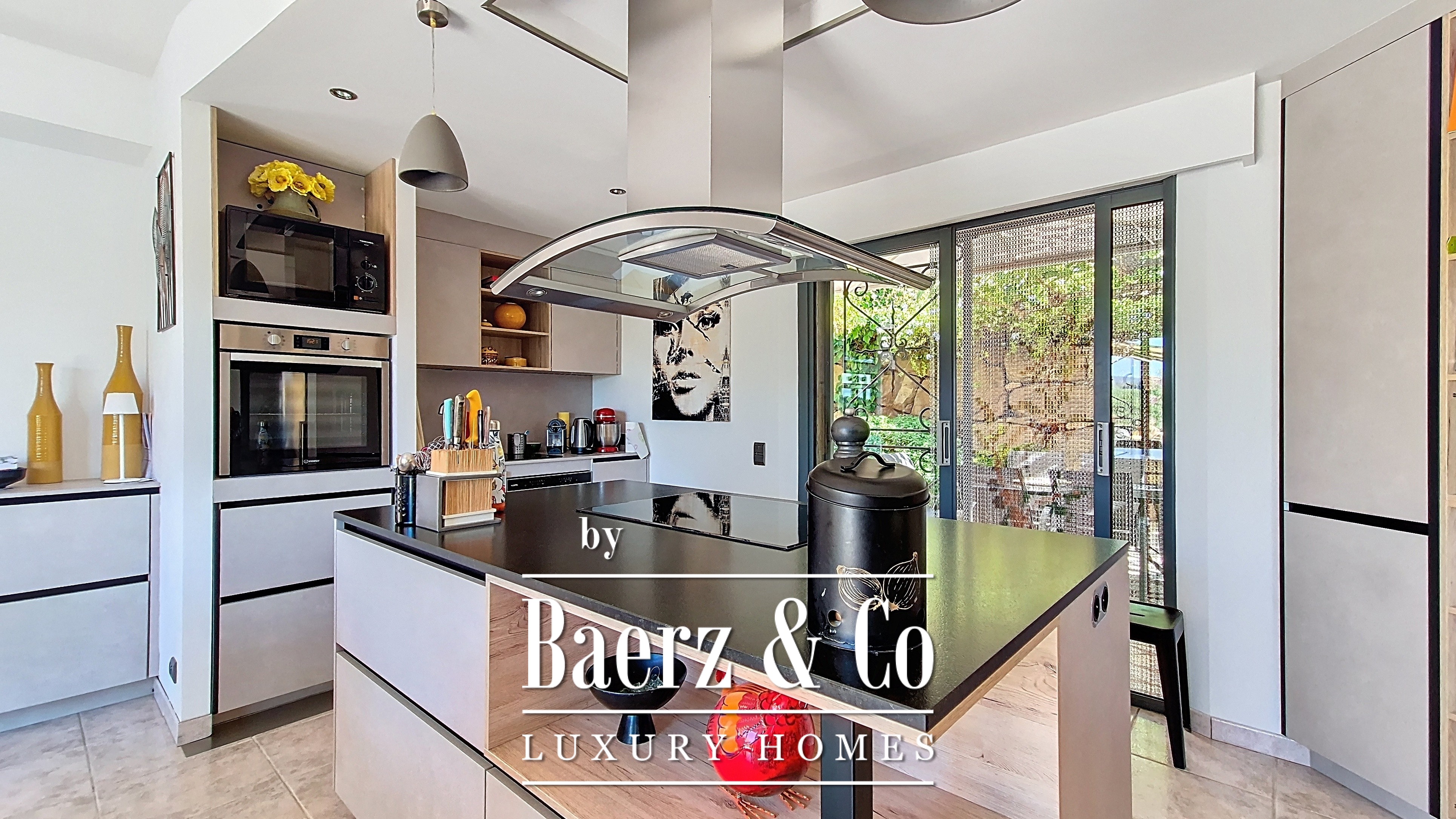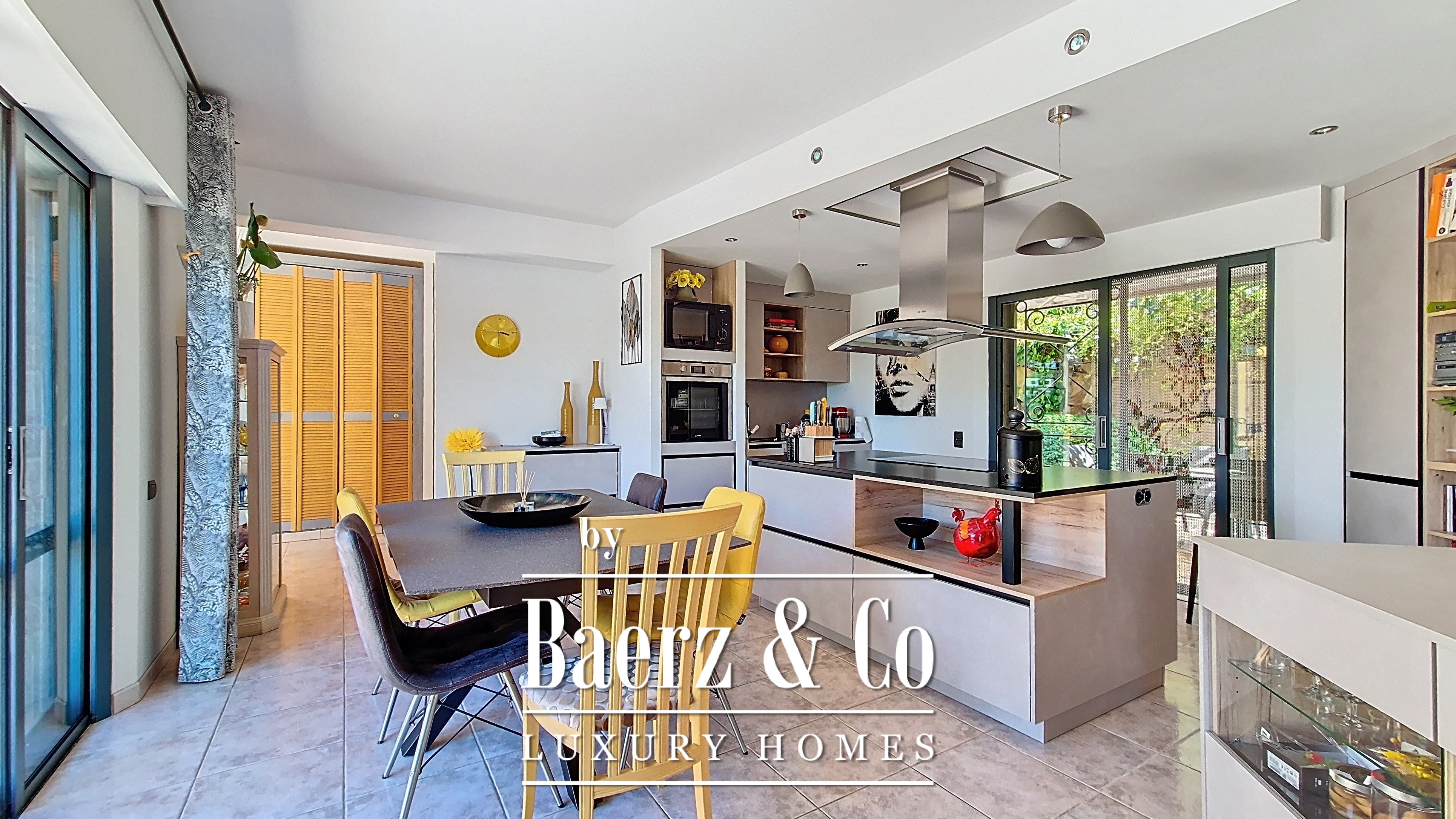 In the prestigious residential area of Valescure, surrounded by lush greenery, this remarkable 196 sqm villa—146 sqm of which is on one level—seamlessly blends Provençal charm with refined modern comforts. Presented in immaculate condition, the property offers an exceptional lifestyle in a rare and privileged setting. The main level features a spacious and light-filled double reception room with fireplace, a recently renovated open-plan kitchen, and three bedrooms including a sumptuous master suite. Each room opens onto expansive sun-drenched terraces, creating a perfect