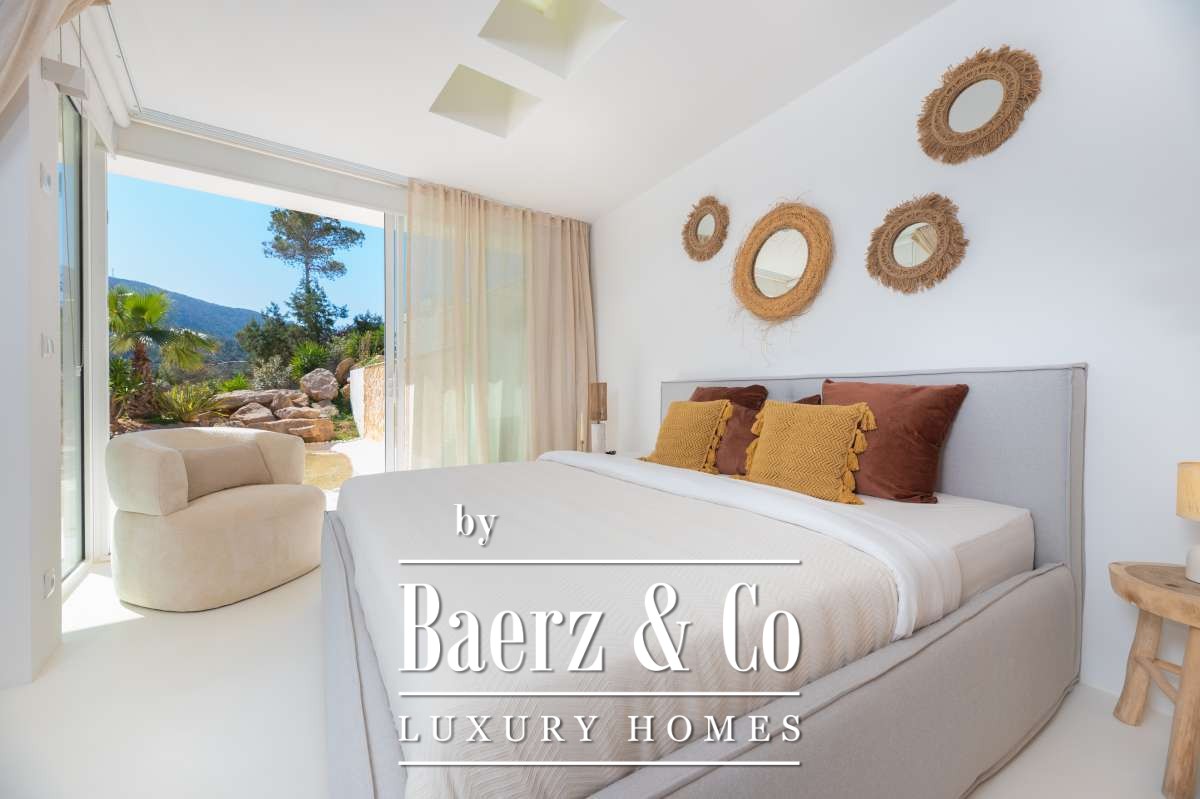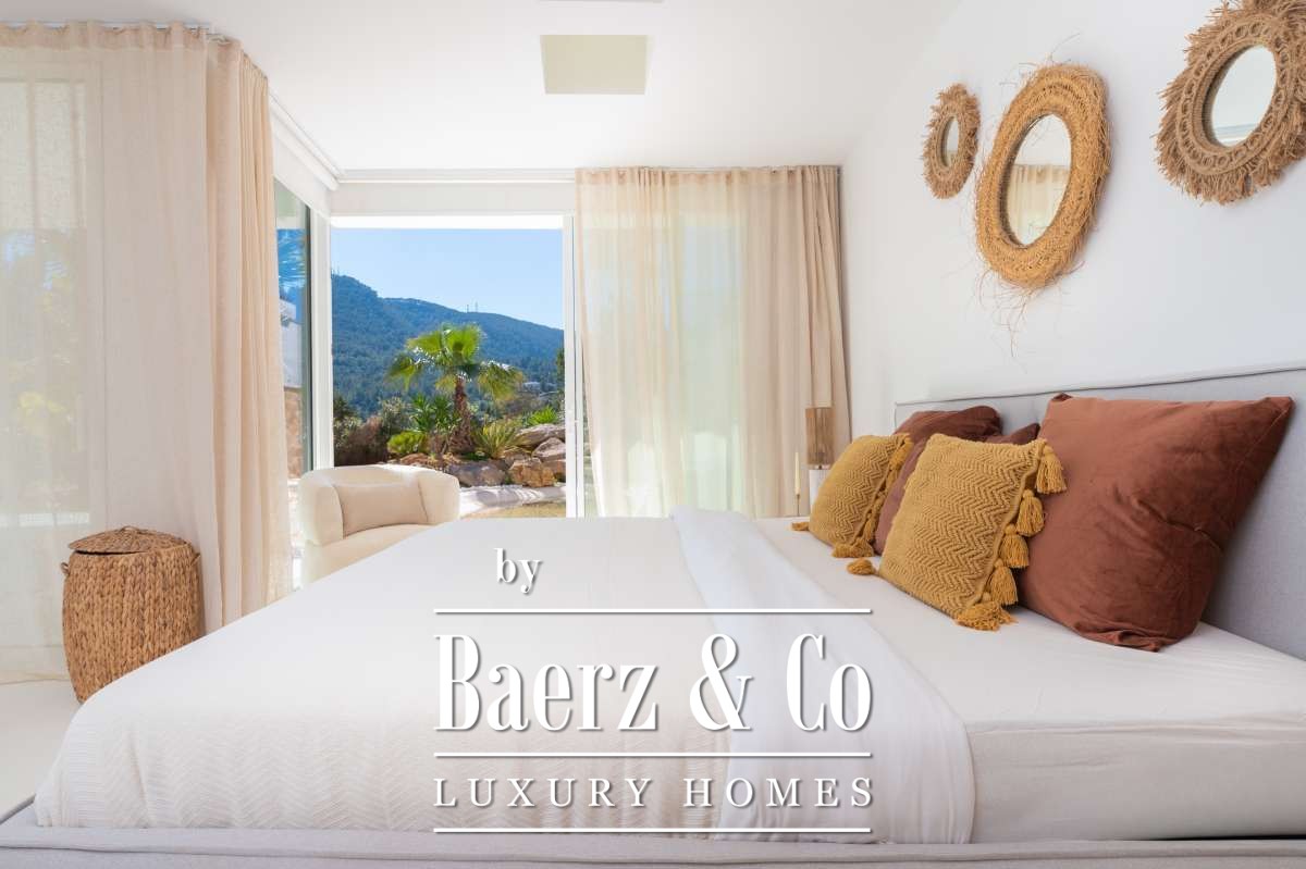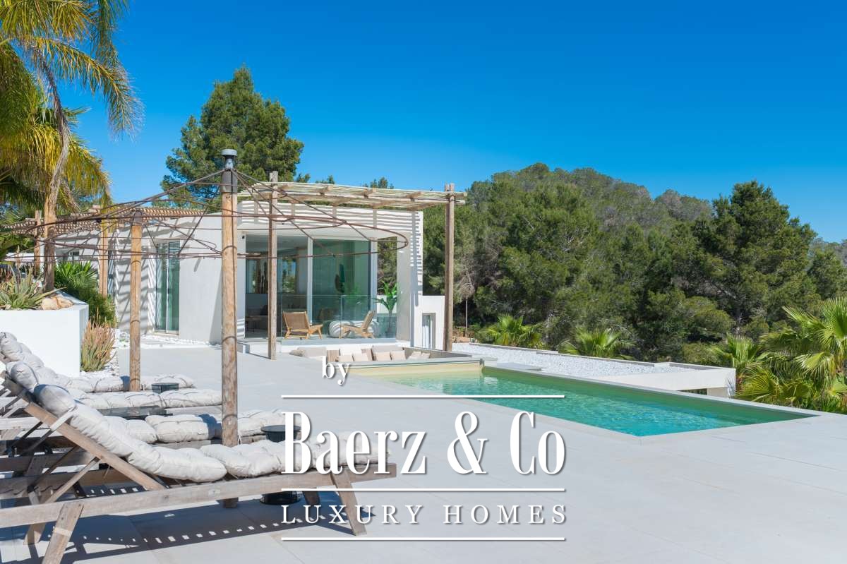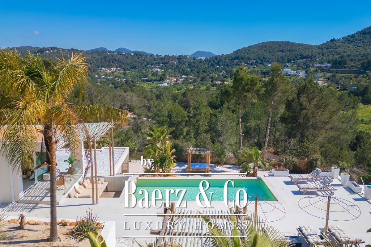 De omgevingVerscholen in de groene heuvels van het westen van Ibiza biedt deze villa een zeldzame combinatie van rust, ruimte en indrukwekkende vergezichten. Gelegen op een royaal perceel van maar liefst 19.600 m² geniet u hier van absolute privacy, omringd door mediterrane natuur en glooiende heuvels. Vanaf verschillende plekken op het terrein kijkt u uit over het landschap met in de verte zelfs een glimp van de zee. Tegelijkertijd liggen het charmante San José en enkele van Ibiza’s mooiste stranden, zoals Cala Tarida, Cala Conta en Cala Bassa, op korte rijafstand.De villaDe villa beschikt over een totale woonoppervlakte van circa 330 m², inclusief een ruim souterrain van ongeveer 120 m², en combineert comfort, ruimte en privacy op een unieke manier. Met vier slaapkamers en drie badkamers is de woning perfect ingericht voor zowel familie als gasten, terwijl de royale opzet zorgt voor een ontspannen en luxe woonervaring. Grote raampartijen laten het daglicht rijkelijk binnenstromen en creëren een prachtige verbinding tussen de binnenruimtes en het omliggende landschap. Het comfortniveau ligt hoog: vloerverwarming en airconditioning in alle ruimtes zorgen het hele jaar door voor een aangenaam klimaat. Daarnaast beschikt de villa over diverse luxe voorzieningen zoals een indoor gym, sauna, jacuzzi en een wijnkelder van circa 20 m². Ook technisch is de woning uitstekend uitgerust met zonnepanelen, een batterijopslag van 32 kW en een watertank die wordt gevuld via een gemeenschappelijke bron.De buitenruimtesDe buitenruimtes vormen het hart van deze villa en zijn ontworpen om optimaal te genieten van het mediterrane buitenleven. Rondom de woning liggen meerdere terrassen met een totale oppervlakte van circa 300 m², waar zon, uitzicht en privacy samenkomen. Het infinity zwembad van ongeveer 30 m² met natuurlijke waterval vormt het stralende middelpunt en lijkt naadloos over te vloeien in het omliggende landschap. Daarnaast beschikt het terrein over een stijlvolle outdoor living van circa 100 m², een perfecte setting voor lange zomerdagen, diners onder de sterren en ontspannen momenten met vrienden en familie. Verspreid over het perceel bevinden zich verschillende loungeplekken en een buiten gym van circa 30 m². Binnen de huidige vraagprijs behoort tevens de mogelijkheid tot het plaatsen van een mobiele padelbaan. Ook is er een charmant houten gastenverblijf van circa 20 m² met eigen terras en een carport van circa 40 m². Dankzij het royale perceel en de uitzonderlijke privacy voelt deze villa als een privéresort midden in de natuur.
