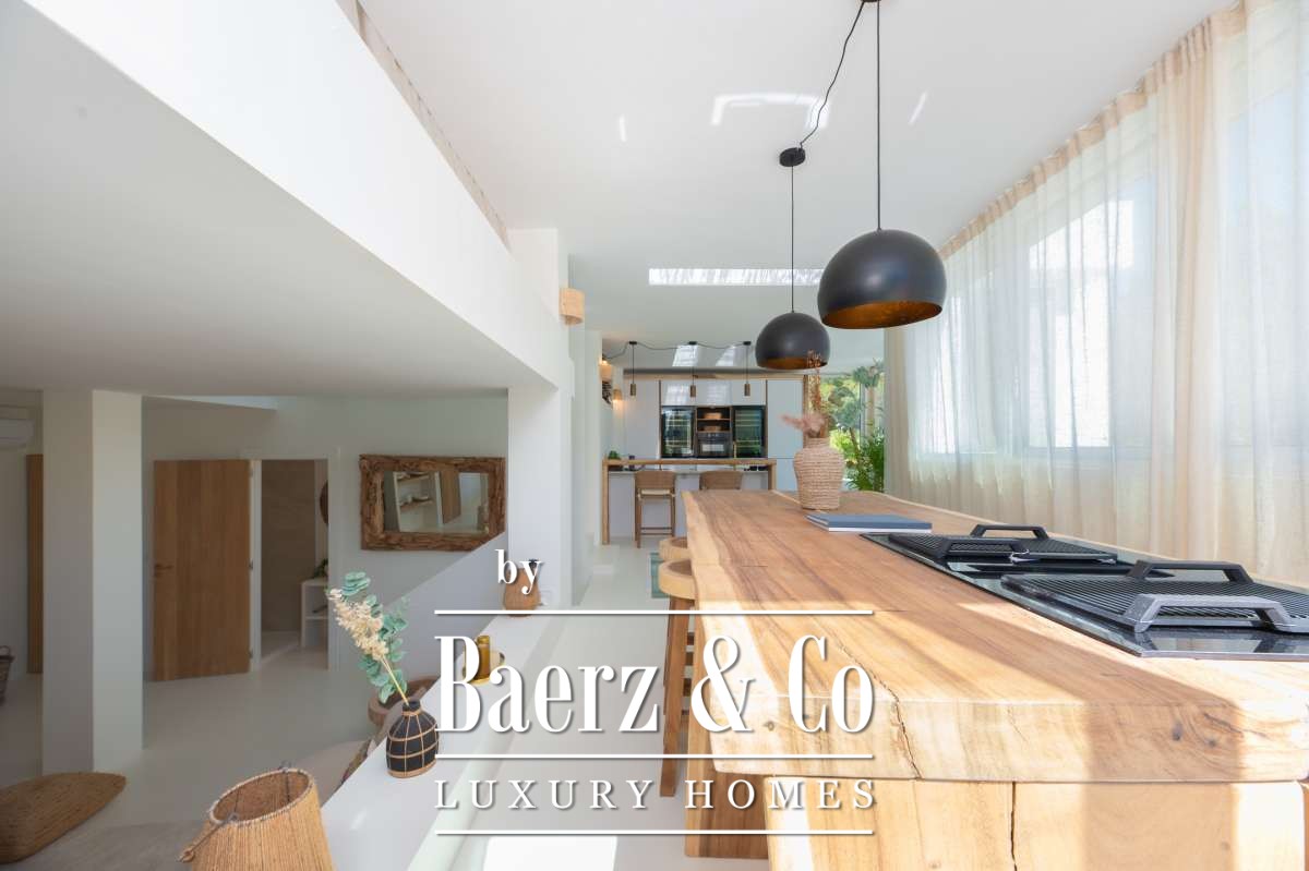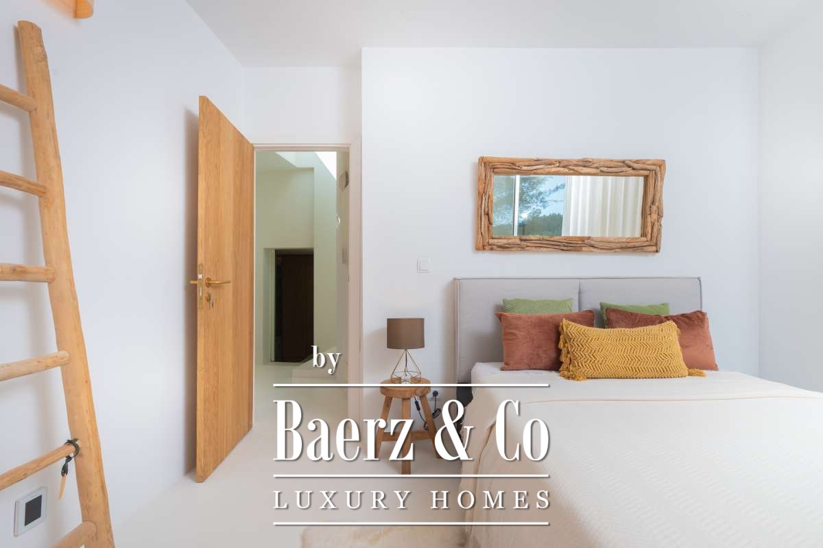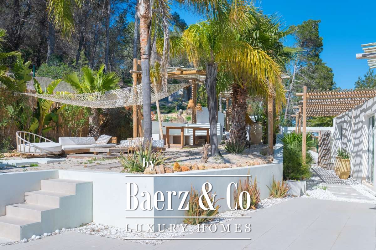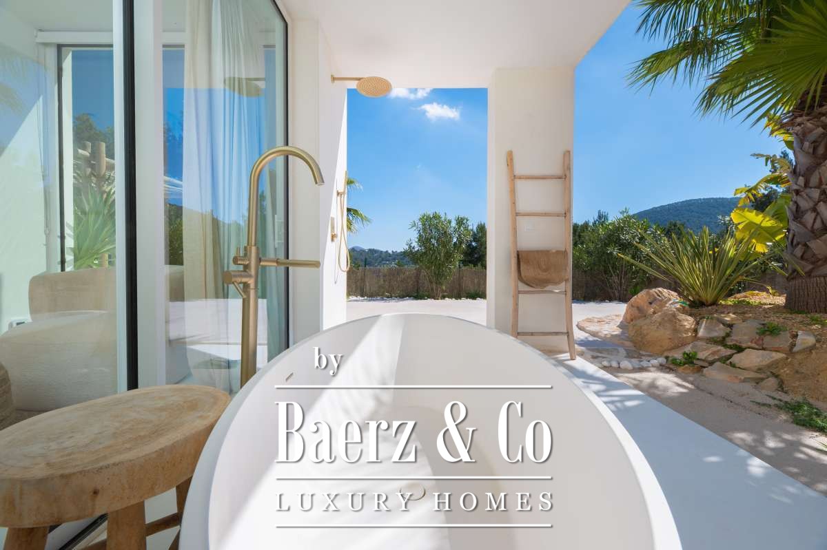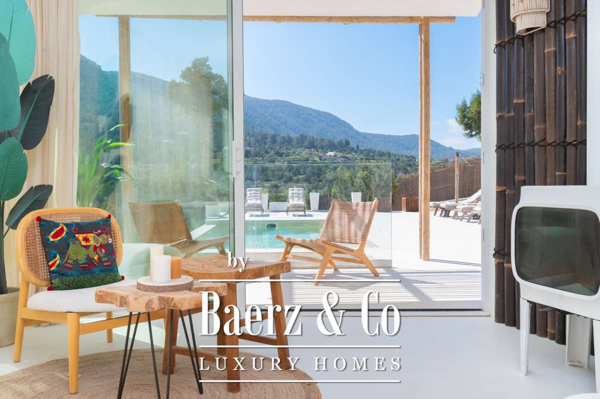 De omgevingVerscholen in de groene heuvels van het westen van Ibiza biedt deze villa een zeldzame combinatie van rust, ruimte en indrukwekkende vergezichten. Gelegen op een royaal perceel van maar liefst 19.600 m² geniet u hier van absolute privacy, omringd door mediterrane natuur en glooiende heuvels. Vanaf verschillende plekken op het terrein kijkt u uit over het landschap met in de verte zelfs een glimp van de zee. Tegelijkertijd liggen het charmante San José en enkele van Ibiza’s mooiste stranden, zoals Cala Tarida, Cala Conta en Cala Bassa, op korte rijafstand.De villaDe villa beschikt over een totale woonoppervlakte van circa 330 m², inclusief een ruim souterrain van ongeveer 120 m², en combineert comfort, ruimte en privacy op een unieke manier. Met vier slaapkamers en drie badkamers is de woning perfect ingericht voor zowel familie als gasten, terwijl de royale opzet zorgt voor een ontspannen en luxe woonervaring. Grote raampartijen laten het daglicht rijkelijk binnenstromen en creëren een prachtige verbinding tussen de binnenruimtes en het omliggende landschap. Het comfortniveau ligt hoog: vloerverwarming en airconditioning in alle ruimtes zorgen het hele jaar door voor een aangenaam klimaat. Daarnaast beschikt de villa over diverse luxe voorzieningen zoals een indoor gym, sauna, jacuzzi en een wijnkelder van circa 20 m². Ook technisch is de woning uitstekend uitgerust met zonnepanelen, een batterijopslag van 32 kW en een watertank die wordt gevuld via een gemeenschappelijke bron.De buitenruimtesDe buitenruimtes vormen het hart van deze villa en zijn ontworpen om optimaal te genieten van het mediterrane buitenleven. Rondom de woning liggen meerdere terrassen met een totale oppervlakte van circa 300 m², waar zon, uitzicht en privacy samenkomen. Het infinity zwembad van ongeveer 30 m² met natuurlijke waterval vormt het stralende middelpunt en lijkt naadloos over te vloeien in het omliggende landschap. Daarnaast beschikt het terrein over een stijlvolle outdoor living van circa 100 m², een perfecte setting voor lange zomerdagen, diners onder de sterren en ontspannen momenten met vrienden en familie. Verspreid over het perceel bevinden zich verschillende loungeplekken en een buiten gym van circa 30 m². Binnen de huidige vraagprijs behoort tevens de mogelijkheid tot het plaatsen van een mobiele padelbaan. Ook is er een charmant houten gastenverblijf van circa 20 m² met eigen terras en een carport van circa 40 m². Dankzij het royale perceel en de uitzonderlijke privacy voelt deze villa als een privéresort midden in de natuur.